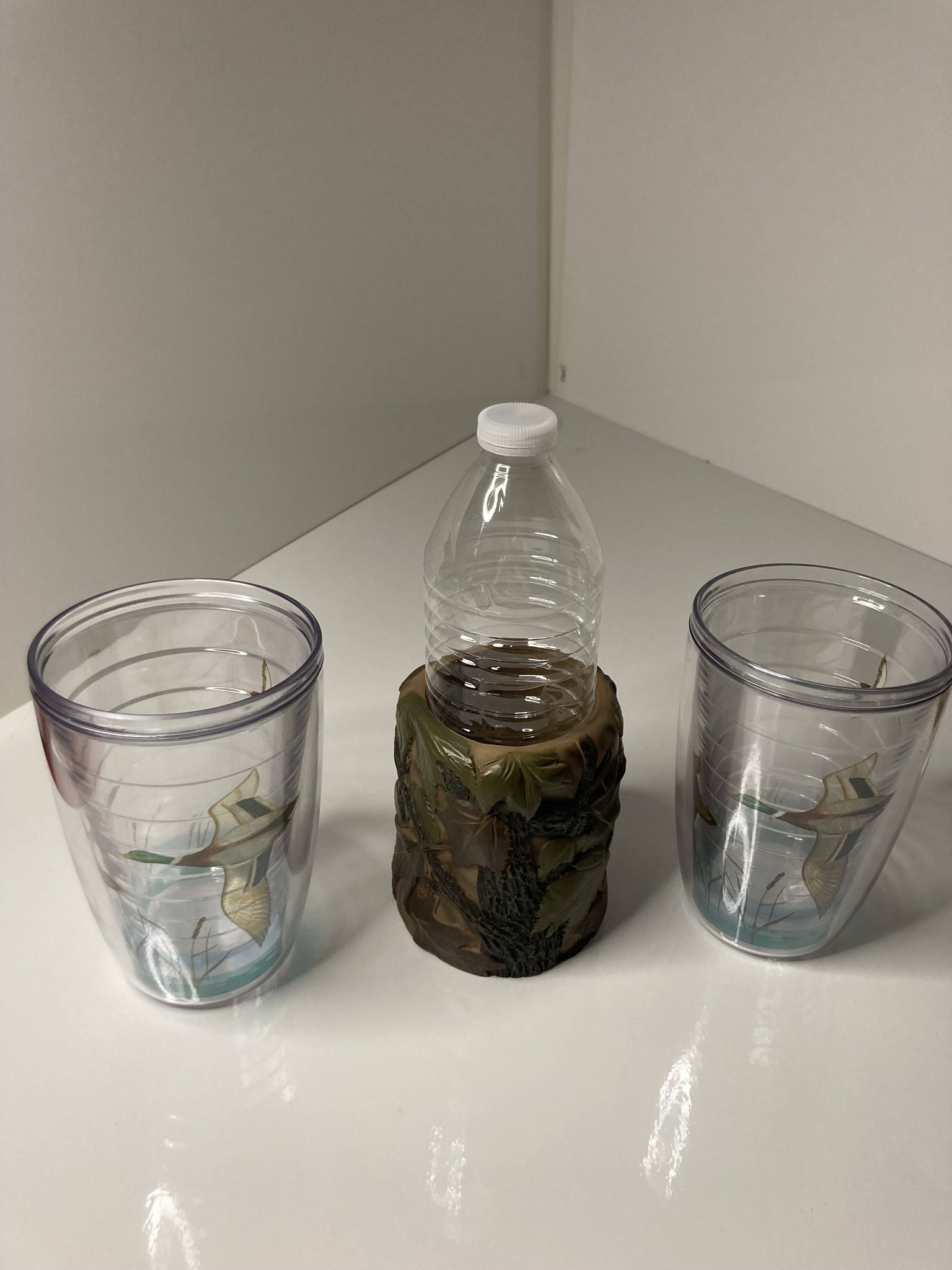 Two duck insulated tumblers (seems like 12 oz each) and one unique plastic tree heavy koozie.
