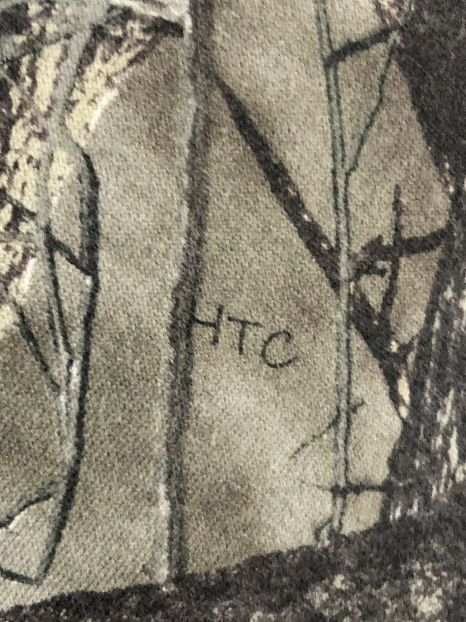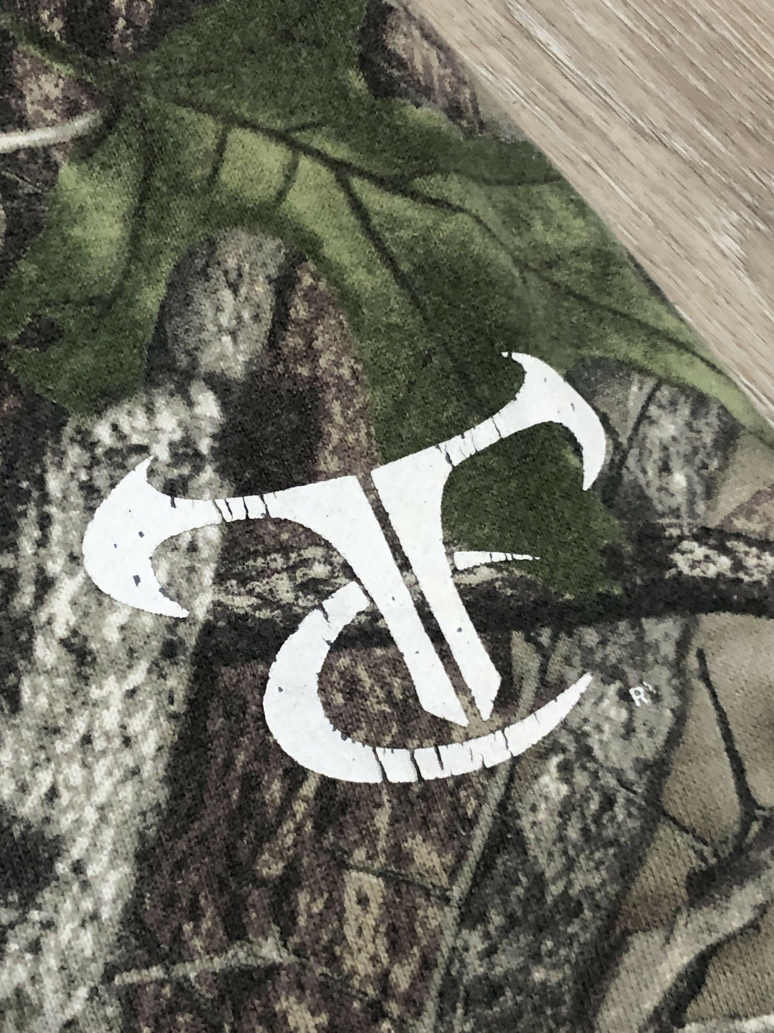 Multicolored Treeline Camo pattern. Drawstring hood. White fleece interior. 75/25 cotton poly.
