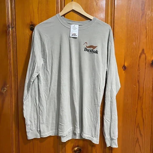Duxbak vintage long-sleeve graphic t-shirt in excellent condition. Never worn and new with tags, this t-shirt is one-of-a-kind, showcasing the original Duxbak logo on the front and artwork of an old, classic Duxbak advertising sign on the back (see photos).