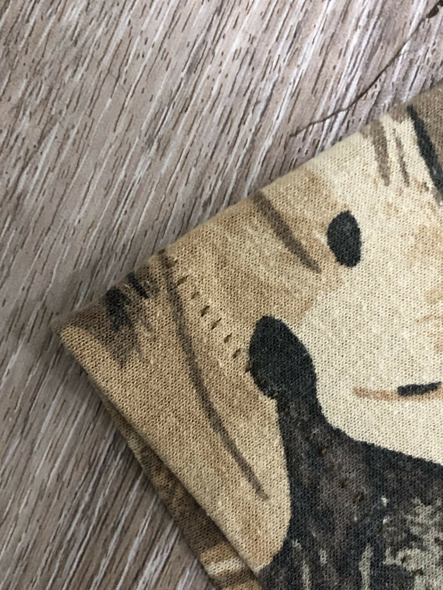 21 chest 29 length. Tan, brown, green and gray leaf and branch pattern. Brown cuffs and collar. Made in USA. Single stitch hem. Pocket on left side of chest.