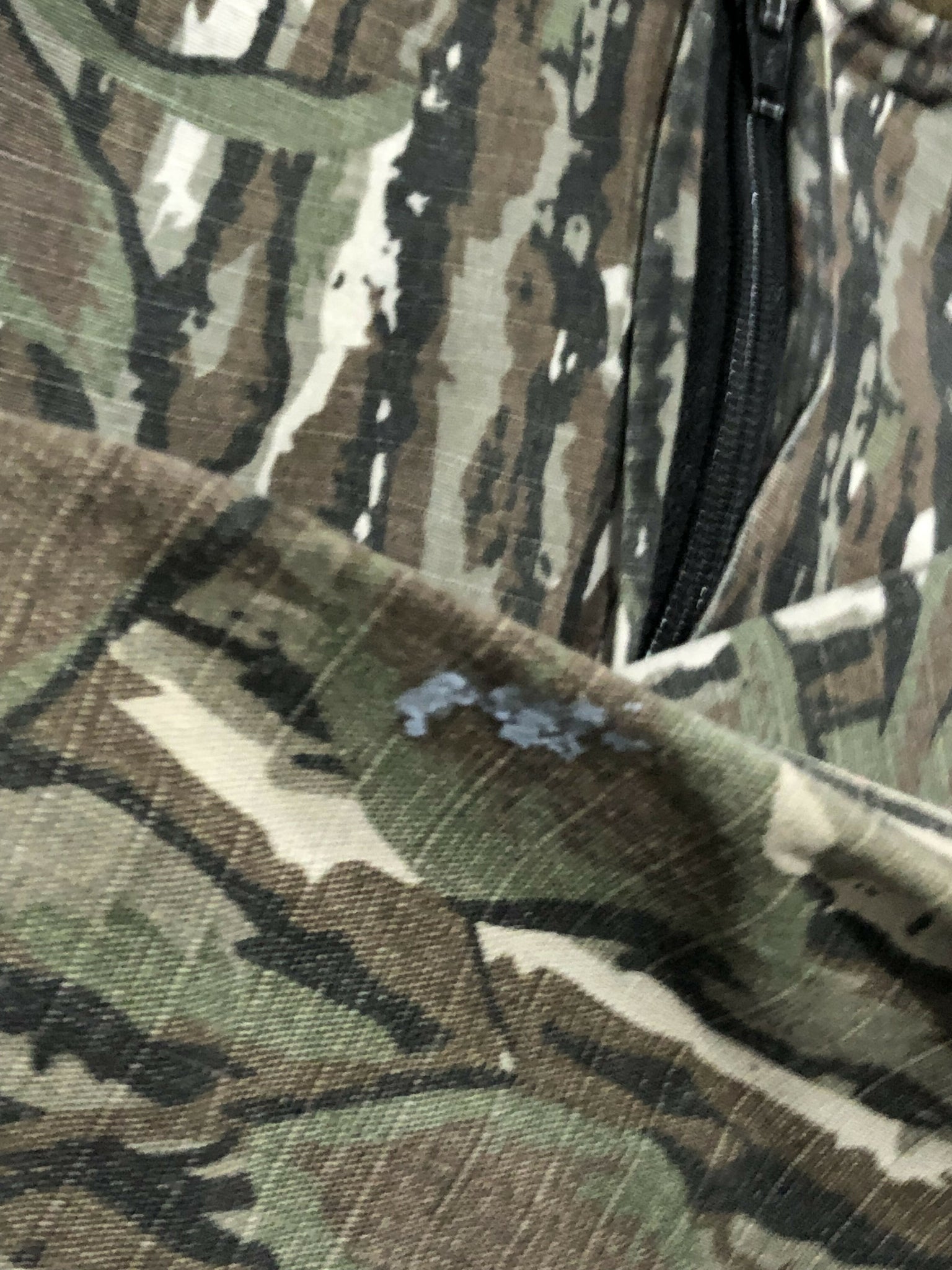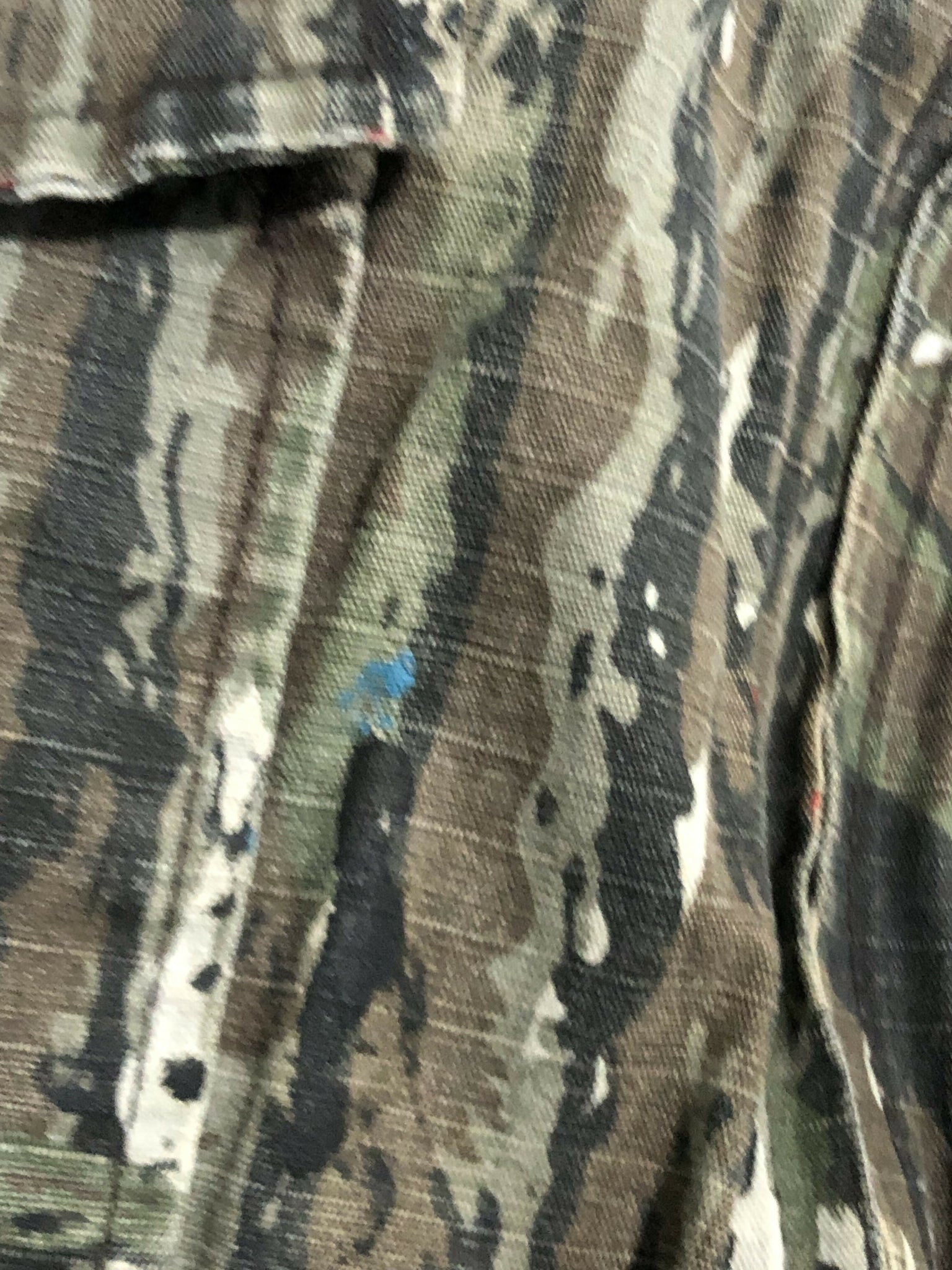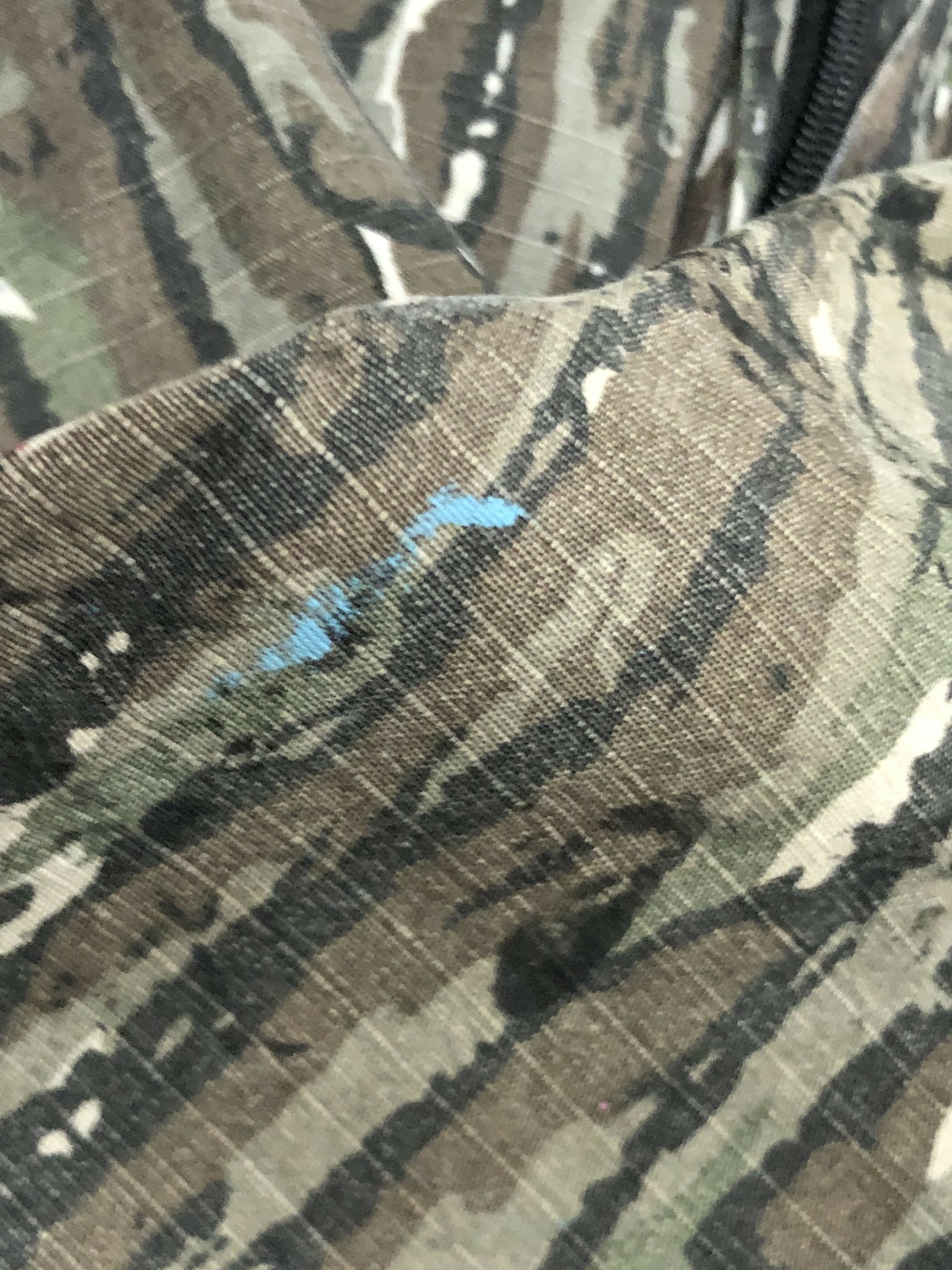 Small holes in back of collar and jacket. Made in USA. Black staining on bottom half of right sleeve. Small teal and blue paint stains on each sleeve and each stomach pocket.