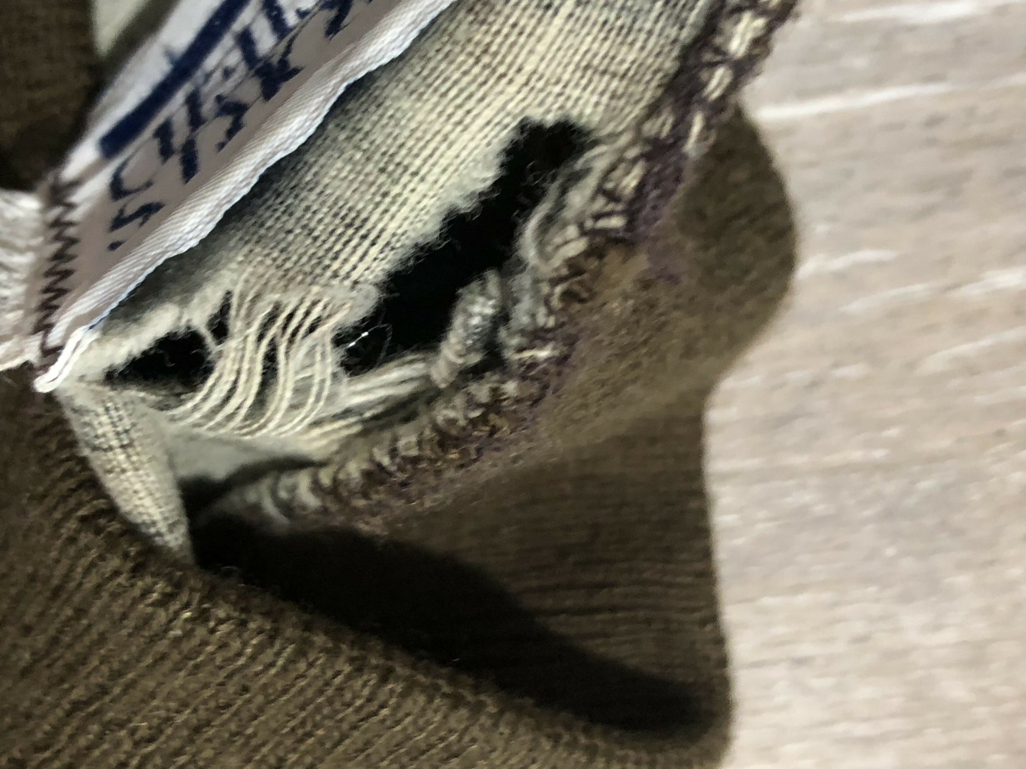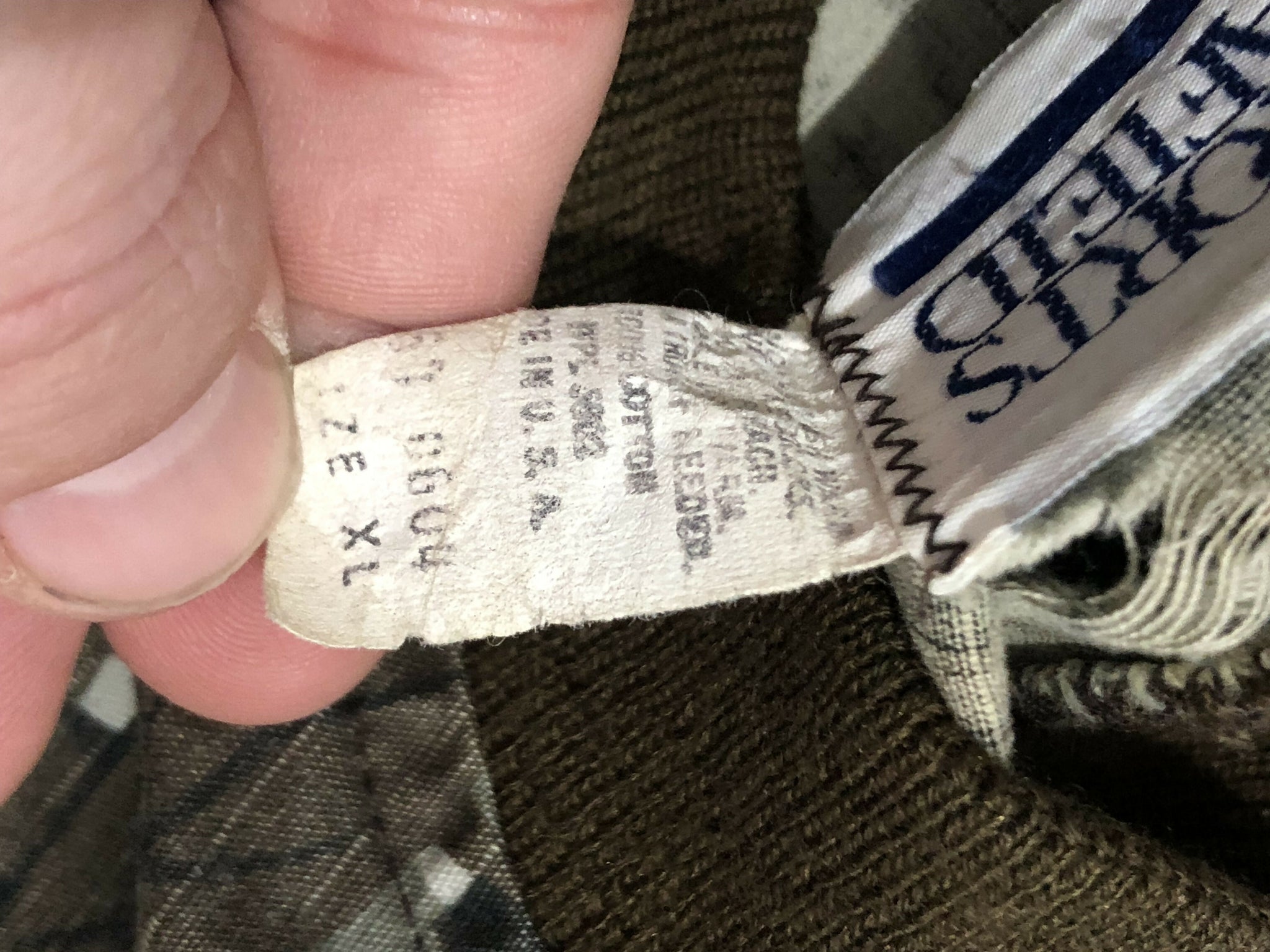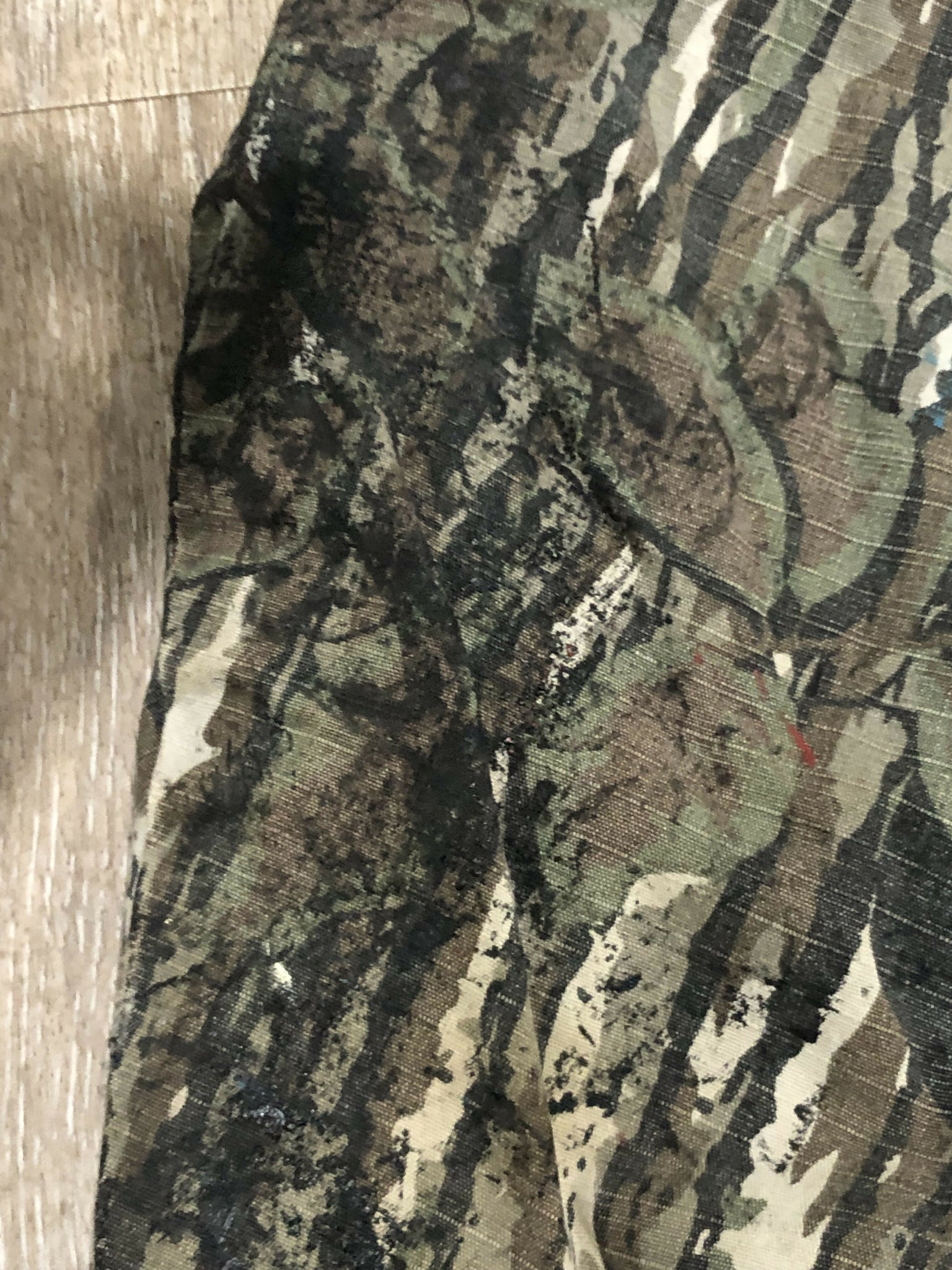 Small holes in back of collar and jacket. Made in USA. Black staining on bottom half of right sleeve. Small teal and blue paint stains on each sleeve and each stomach pocket.