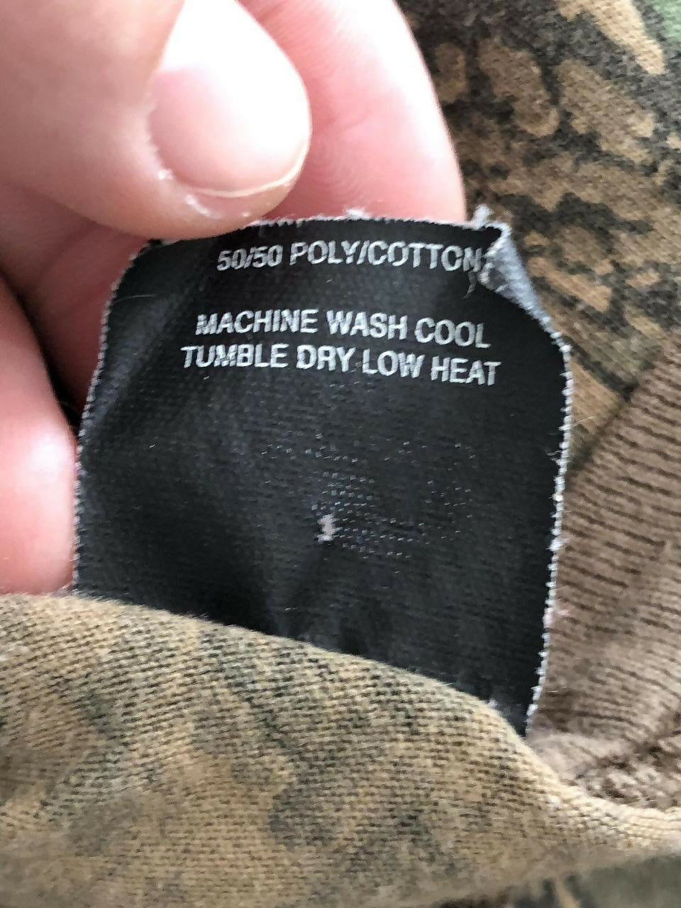 Brown, green, black and tan pattern. Made in USA. 50% cotton 50% poly.