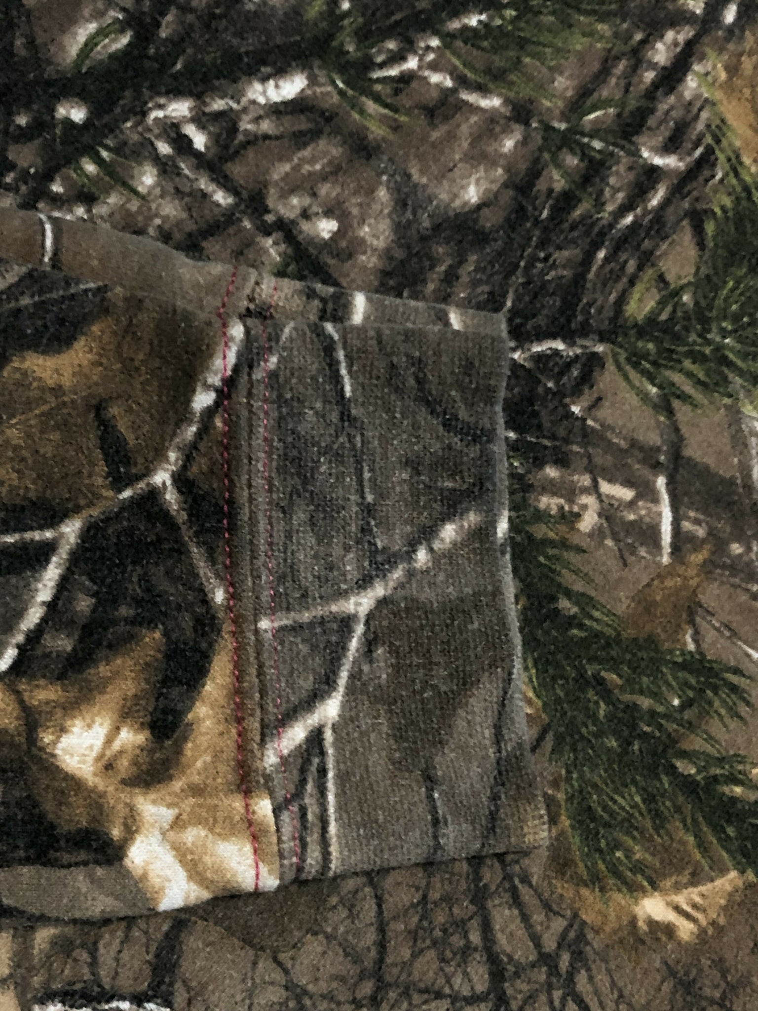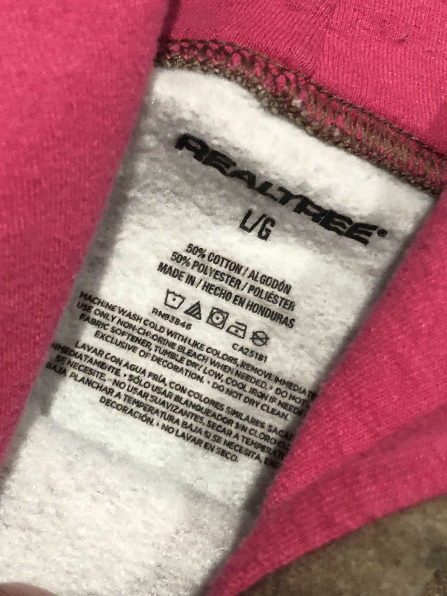 Multicolored Camo pattern. Drawstring hood. Pink stitching and lining in hood. Fleece lining. 50/50 cotton poly.