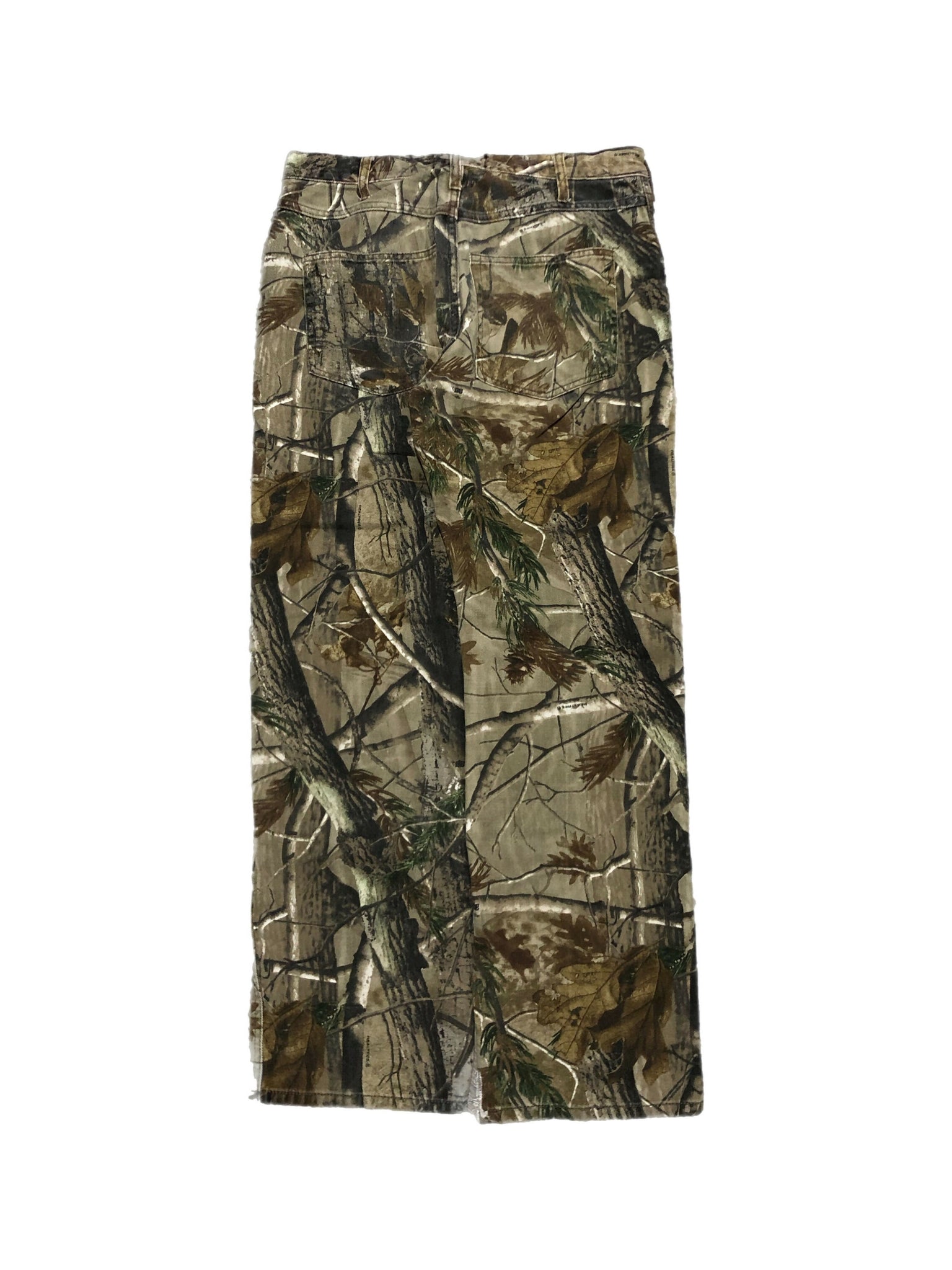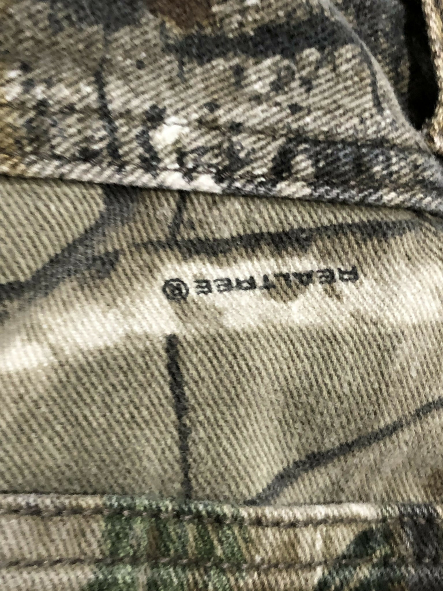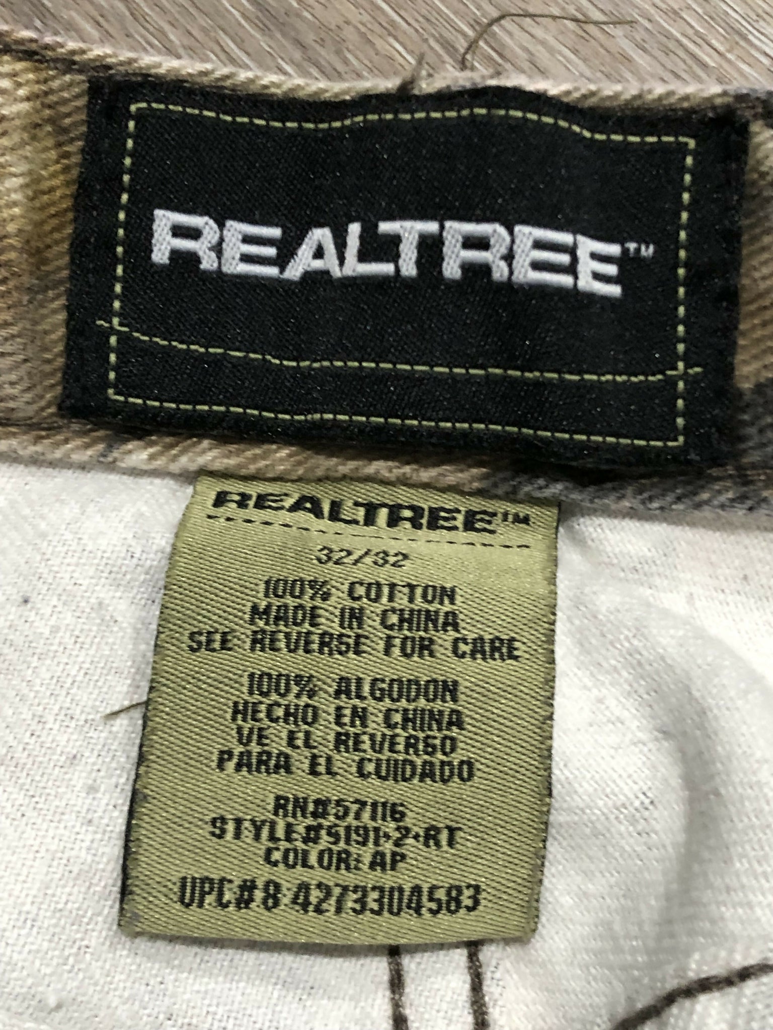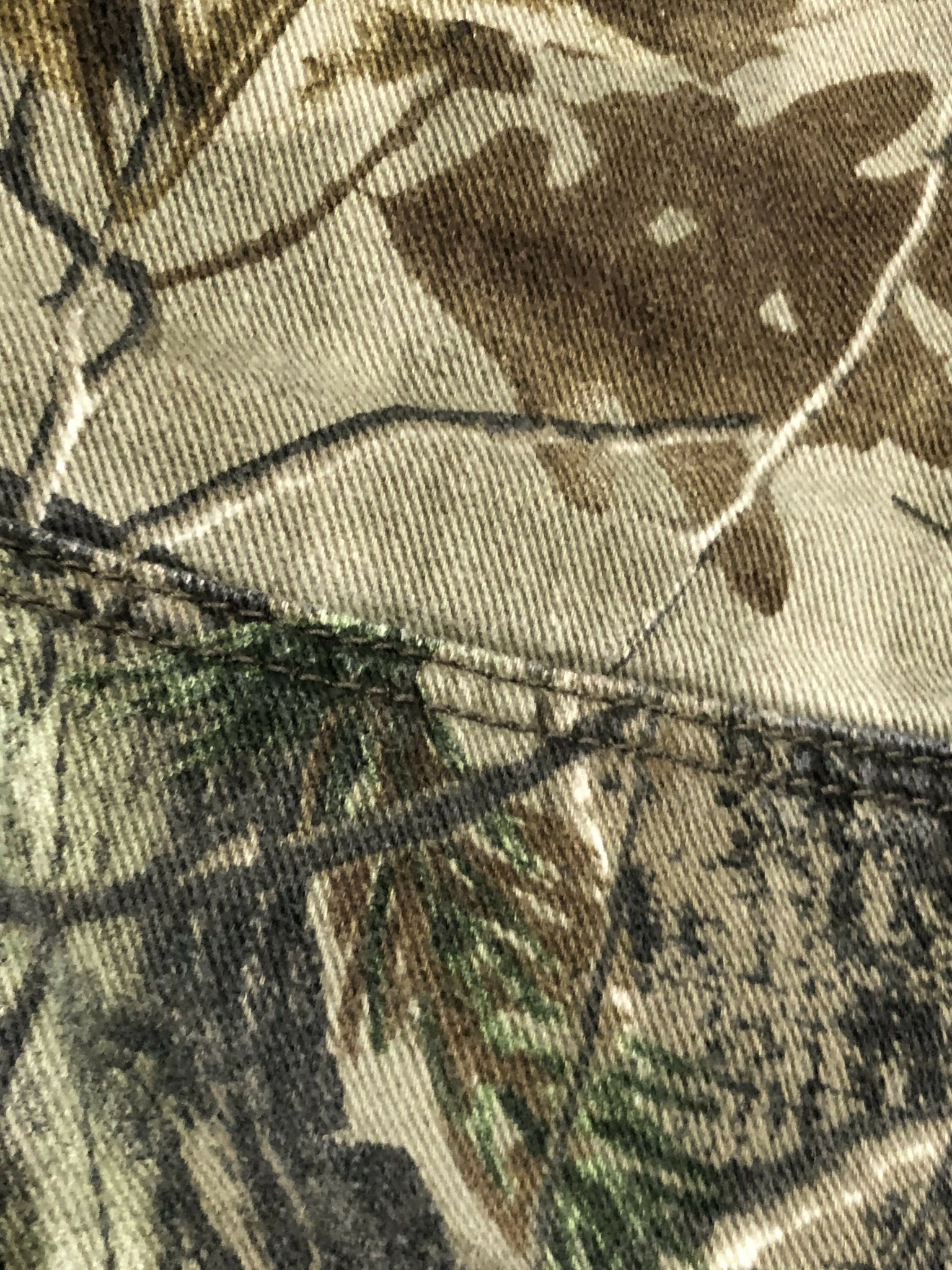 33 waist. 30 inseam. Green, tan brown and khaki pattern. Stitched knees. 100% cotton. Small slits along the inseam around each leg cuff.
