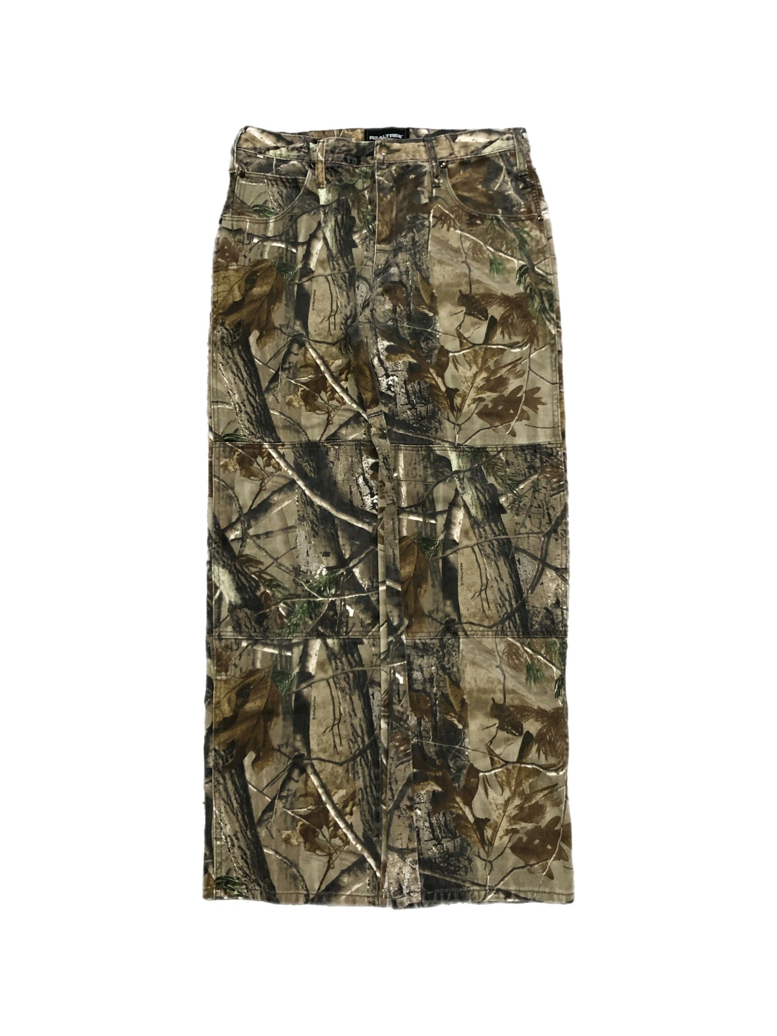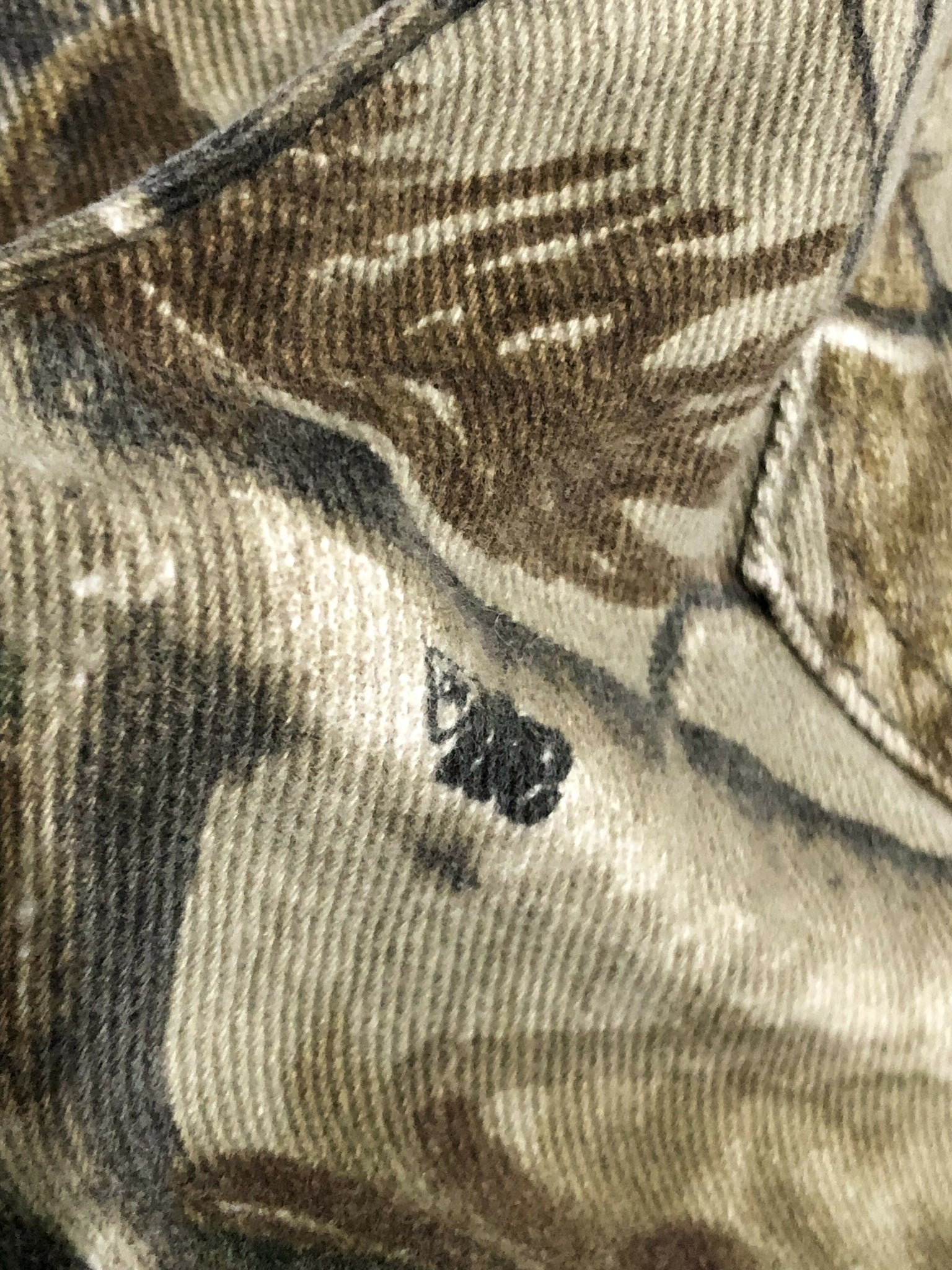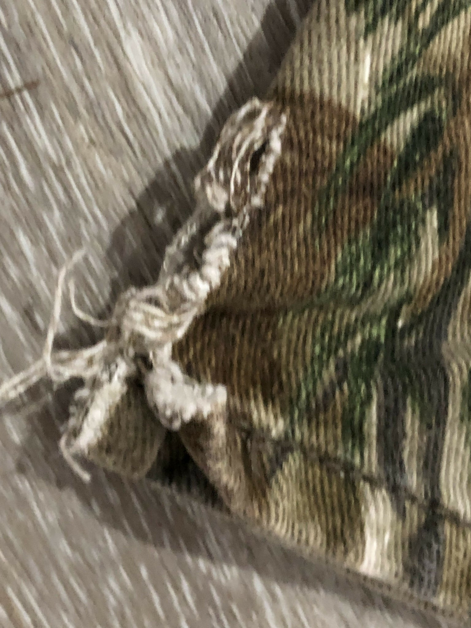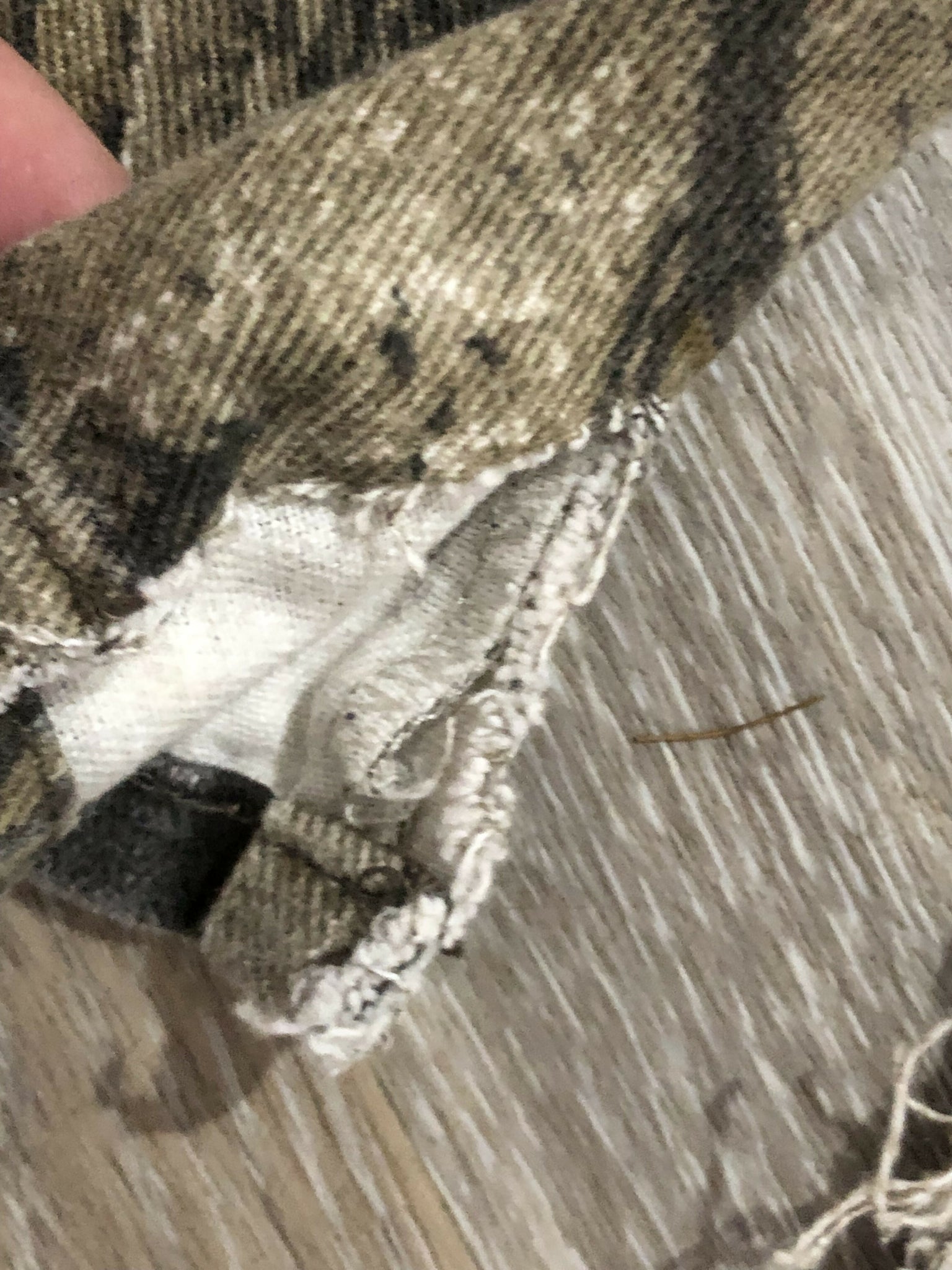 33 waist. 30 inseam. Green, tan brown and khaki pattern. Stitched knees. 100% cotton. Small slits along the inseam around each leg cuff.