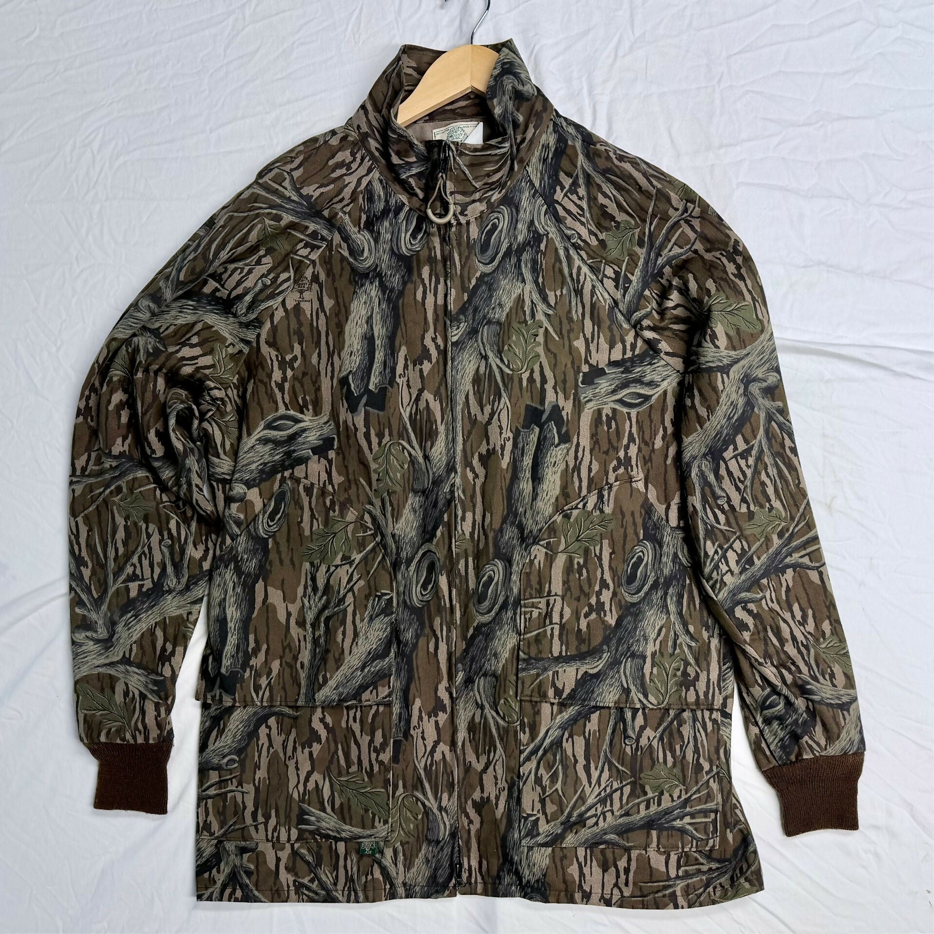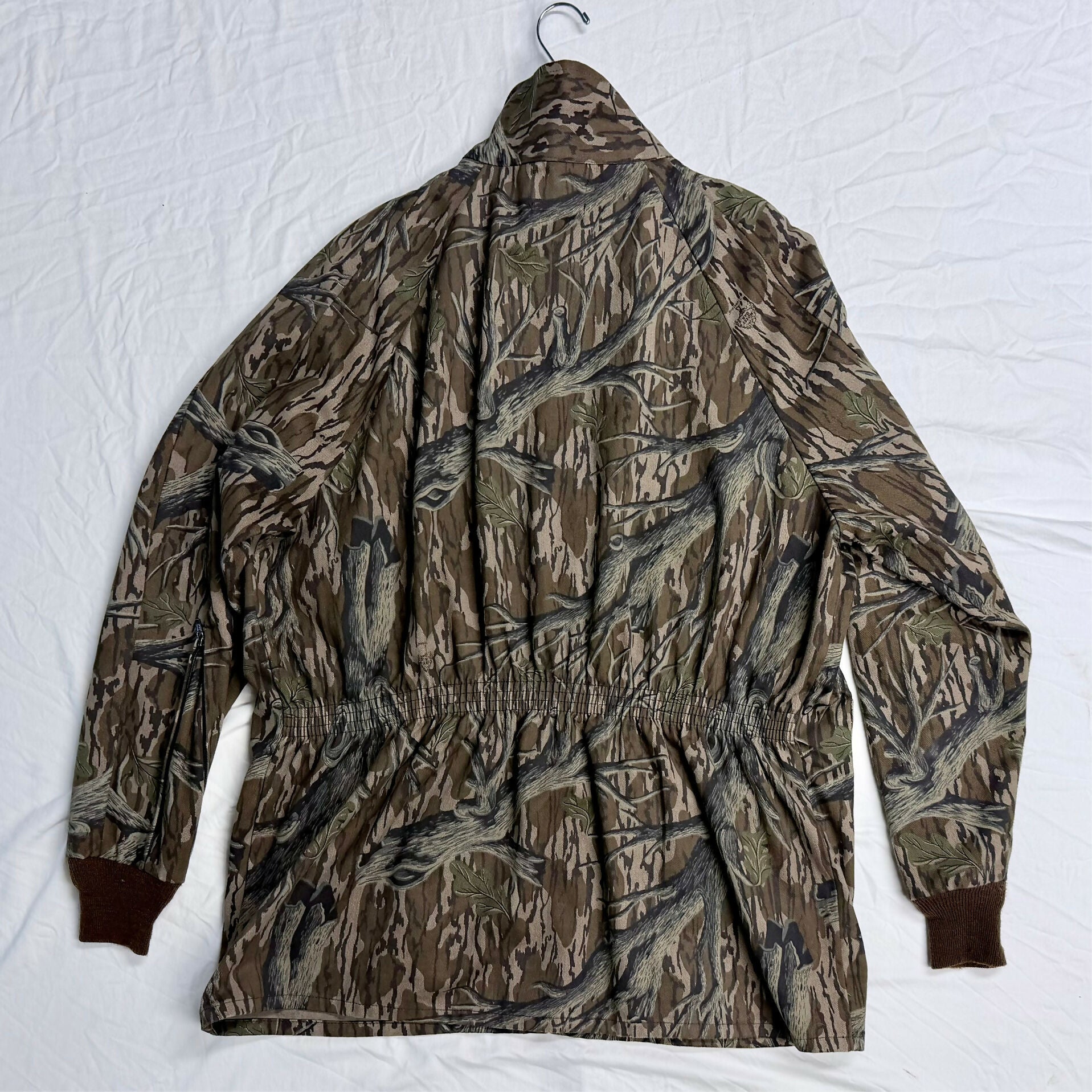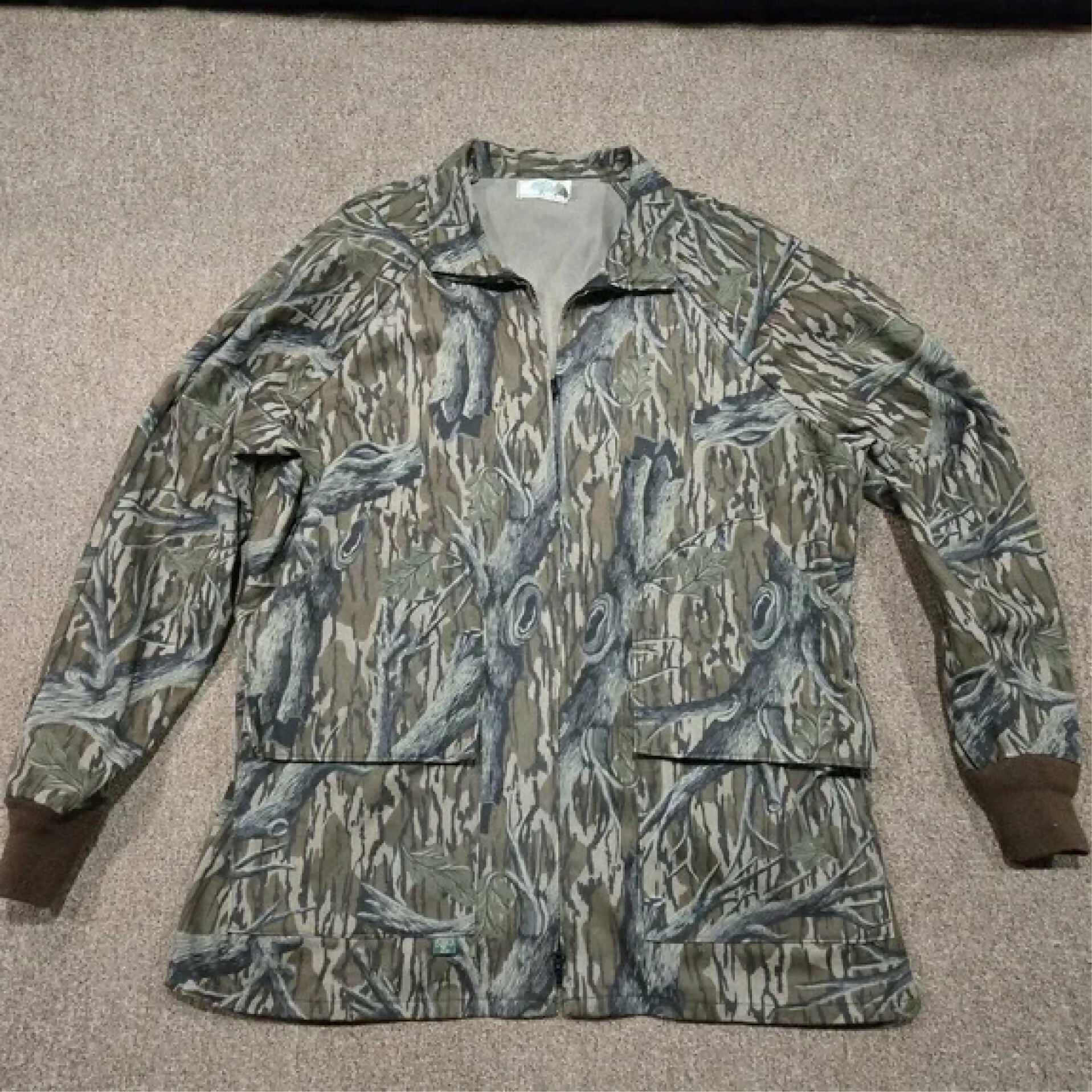 This rare, old-school Mossy Oak Treestand Camo turkey hunting jacket is in excellent condition and Made in the USA. The jacket is made of lightweight, but durable cotton twill. It looks and feels almost new with great color, and no stains, holes, tears, or odor. The elastic cuffs are not stretched and the forearms have zippers to adjust the size to a snug or loose forearm fit! The jacket features four (4) pockets, dual zippered front, and stand up or down collar. Great for turkey hunting, but also nice for autumn deer or duck hunting.