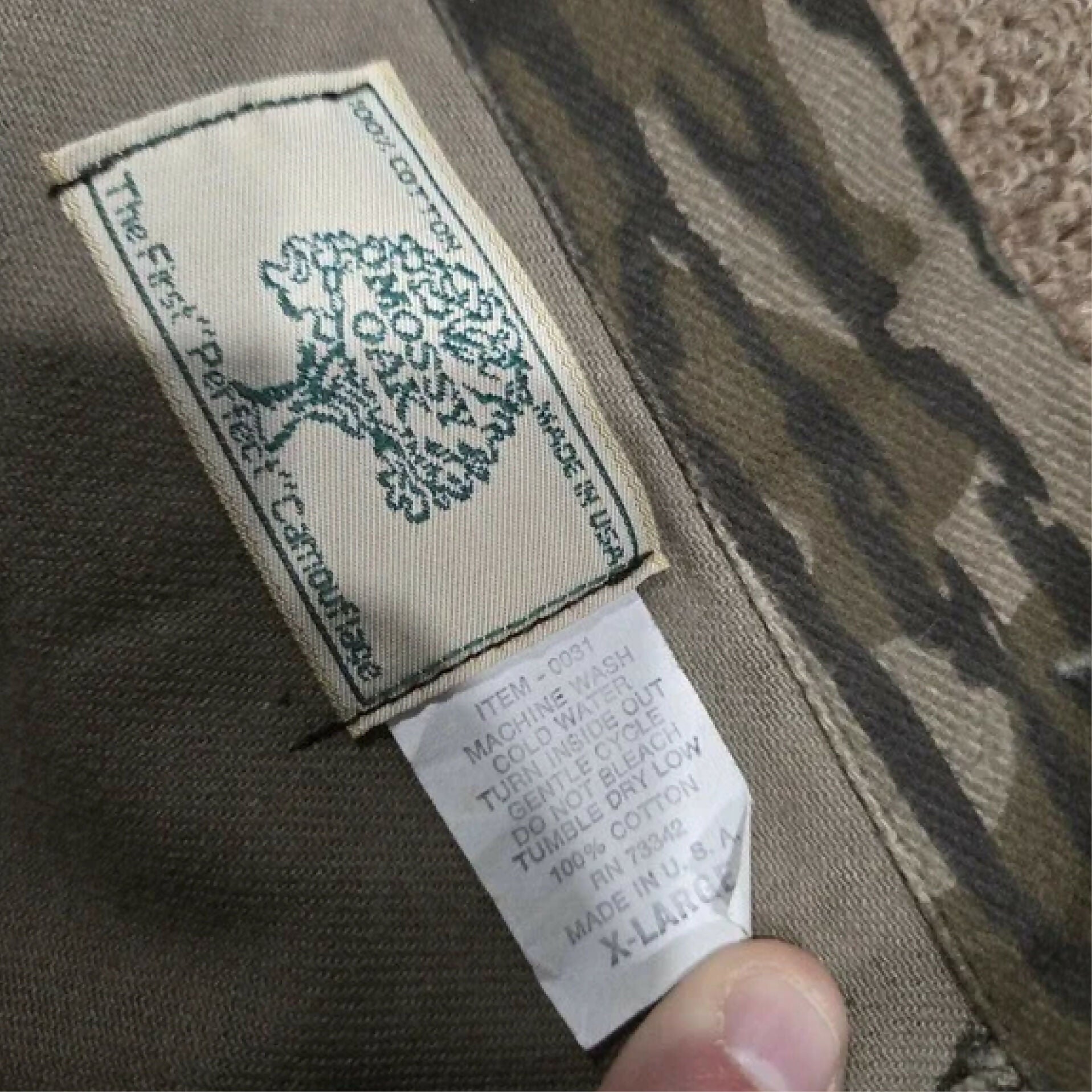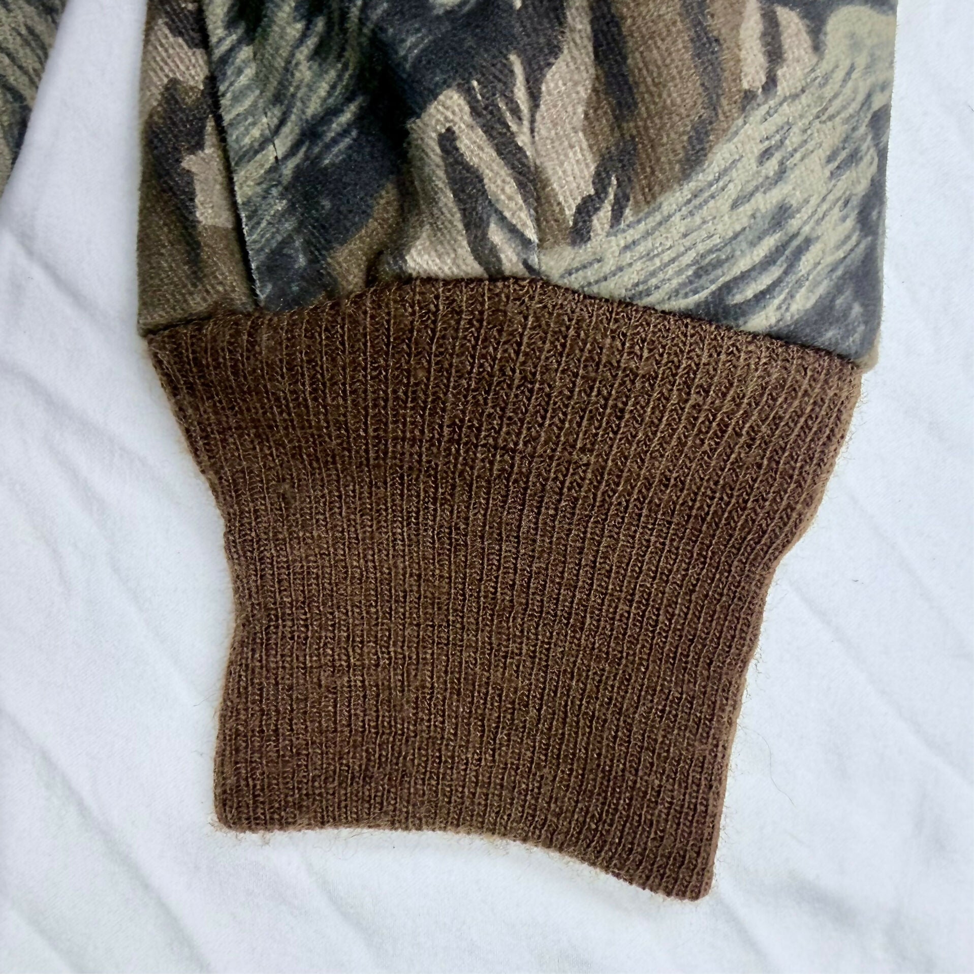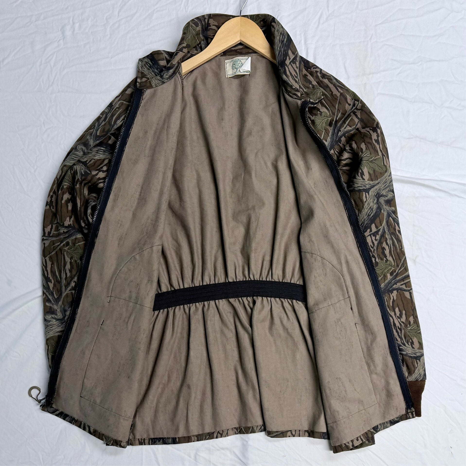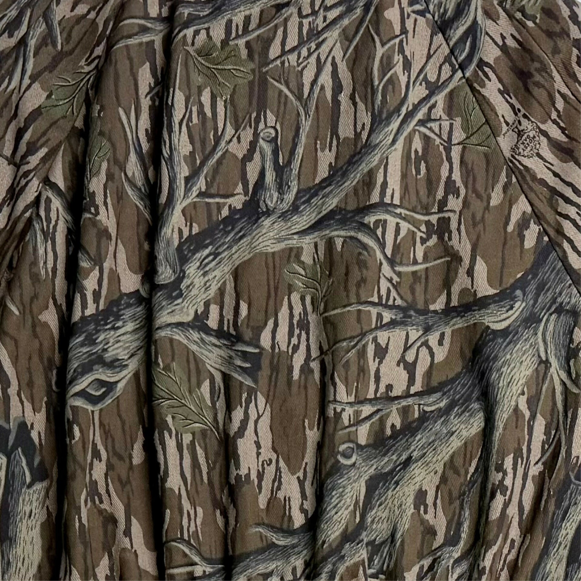 This rare, old-school Mossy Oak Treestand Camo turkey hunting jacket is in excellent condition and Made in the USA. The jacket is made of lightweight, but durable cotton twill. It looks and feels almost new with great color, and no stains, holes, tears, or odor. The elastic cuffs are not stretched and the forearms have zippers to adjust the size to a snug or loose forearm fit! The jacket features four (4) pockets, dual zippered front, and stand up or down collar. Great for turkey hunting, but also nice for autumn deer or duck hunting.