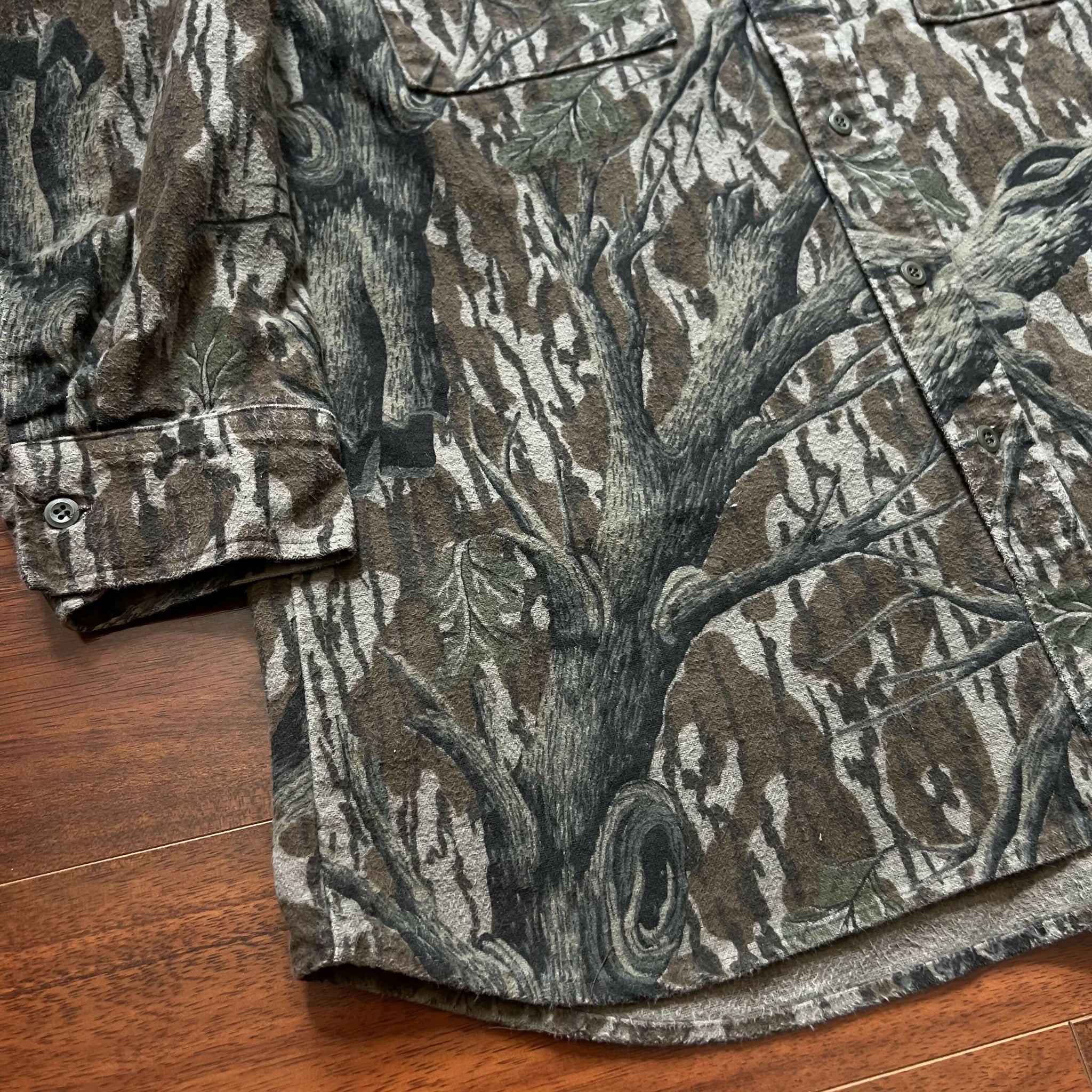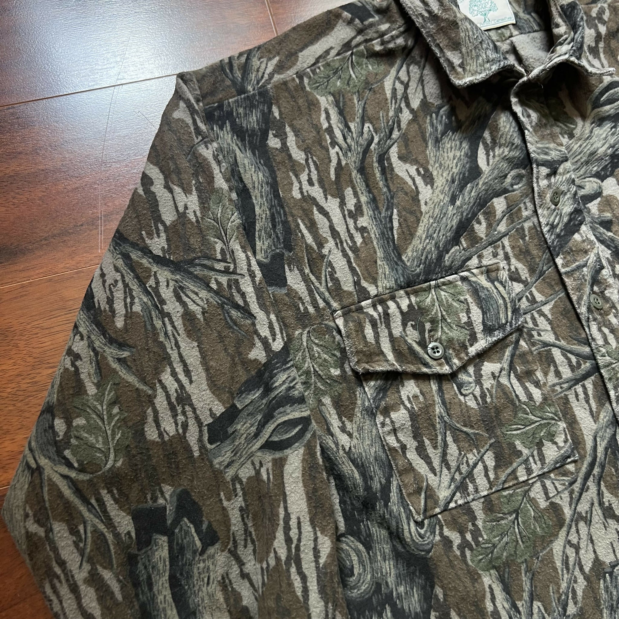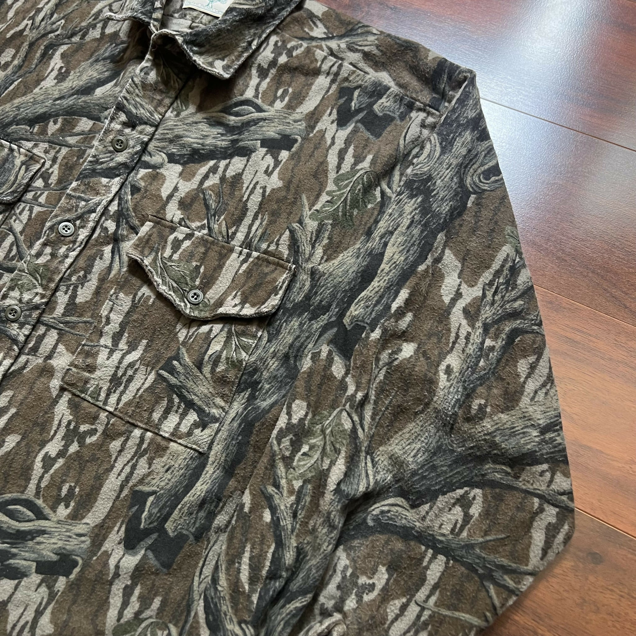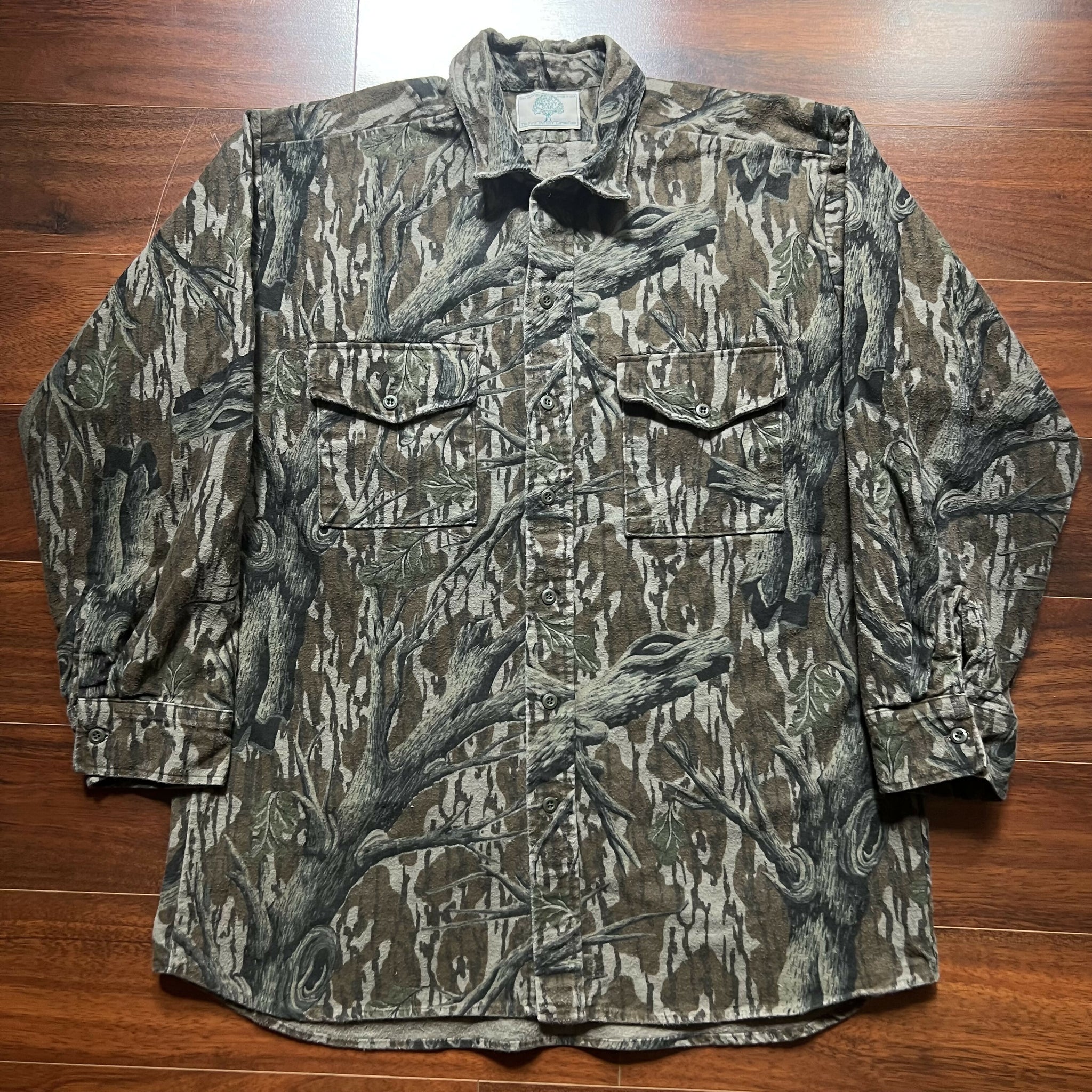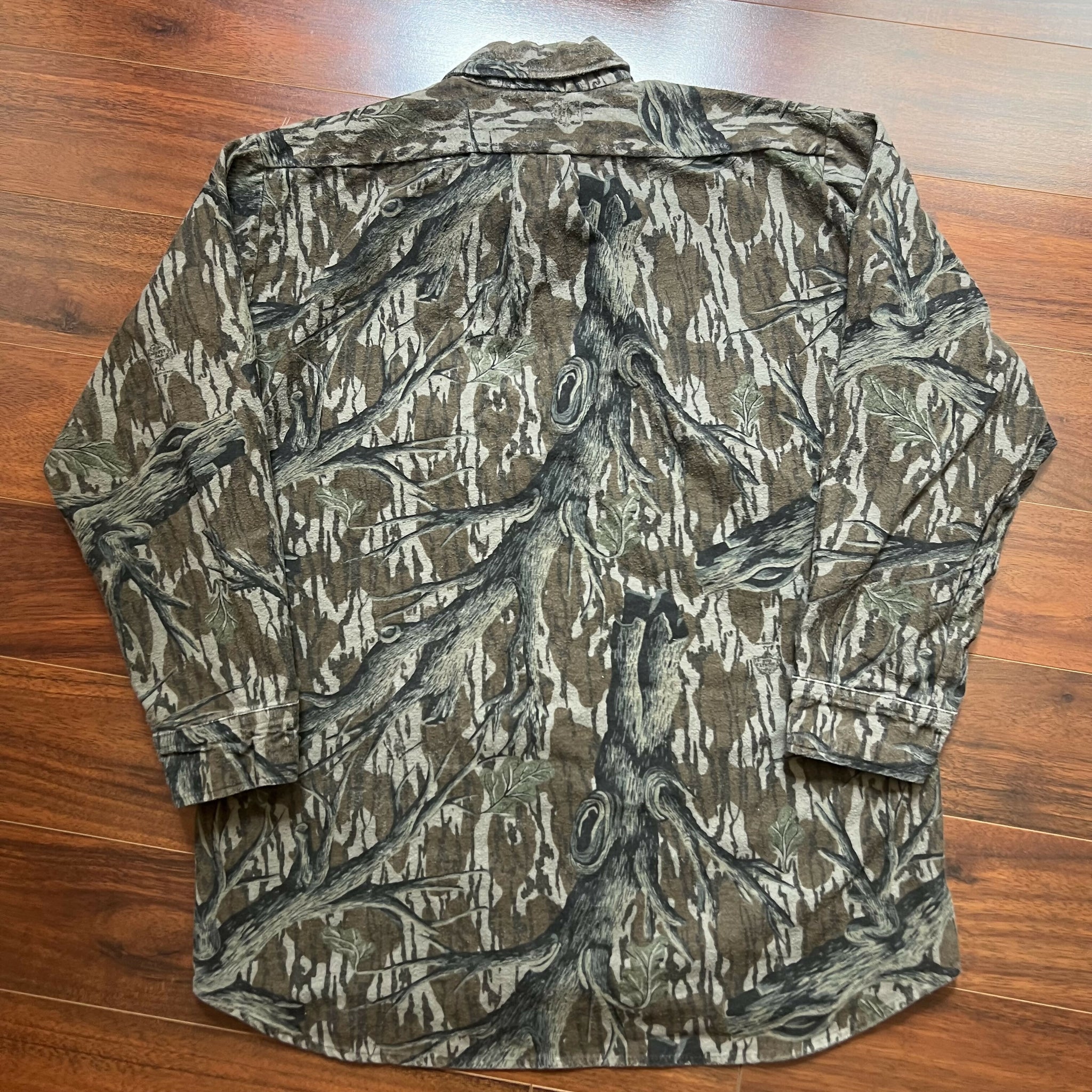 Great condition. No stains or distressing. Excellent heavyweight chamois quality. No size tag, but fits like a XL (refer to measurements). 100% cotton. Original Mossy Oak Treestand camo. Made in USA.