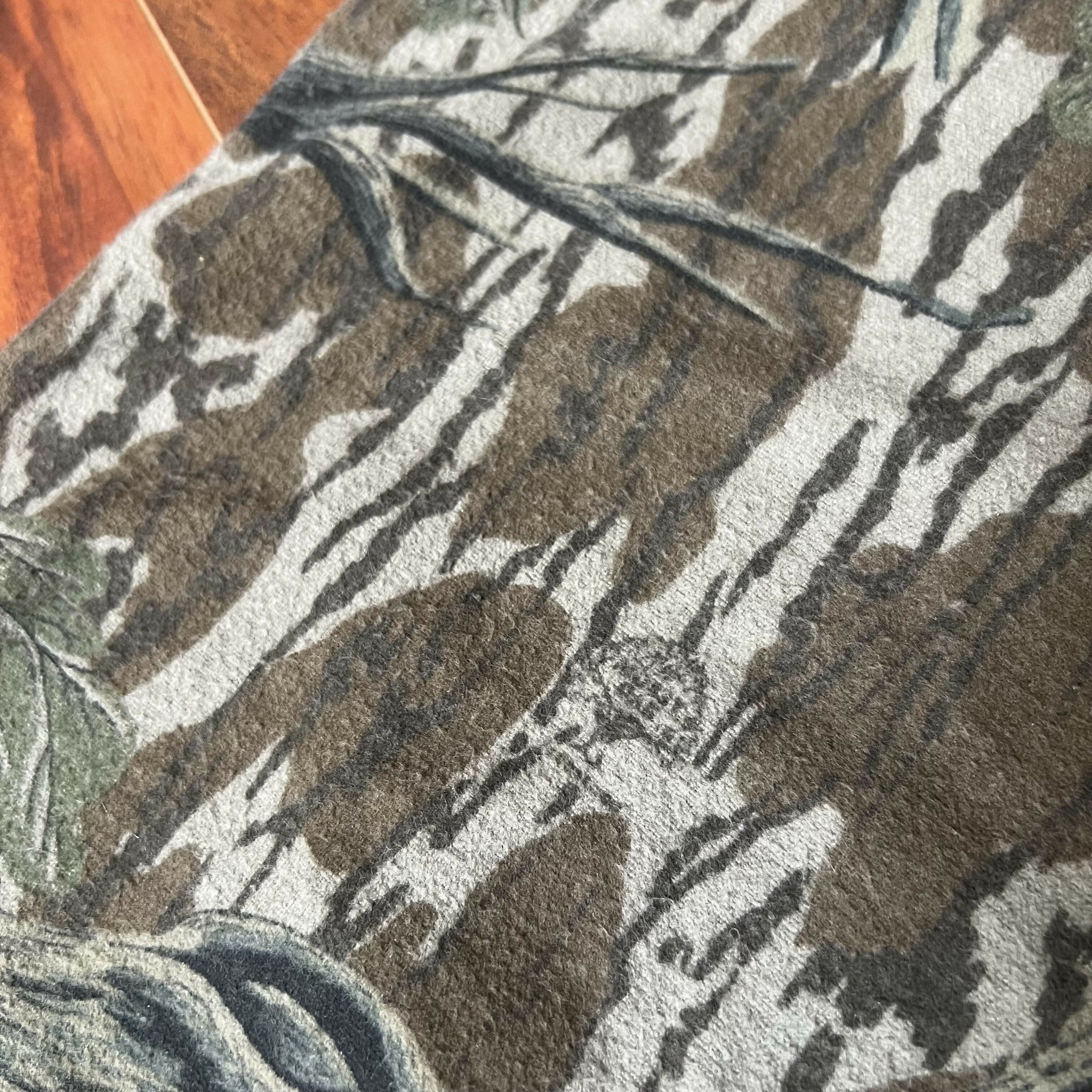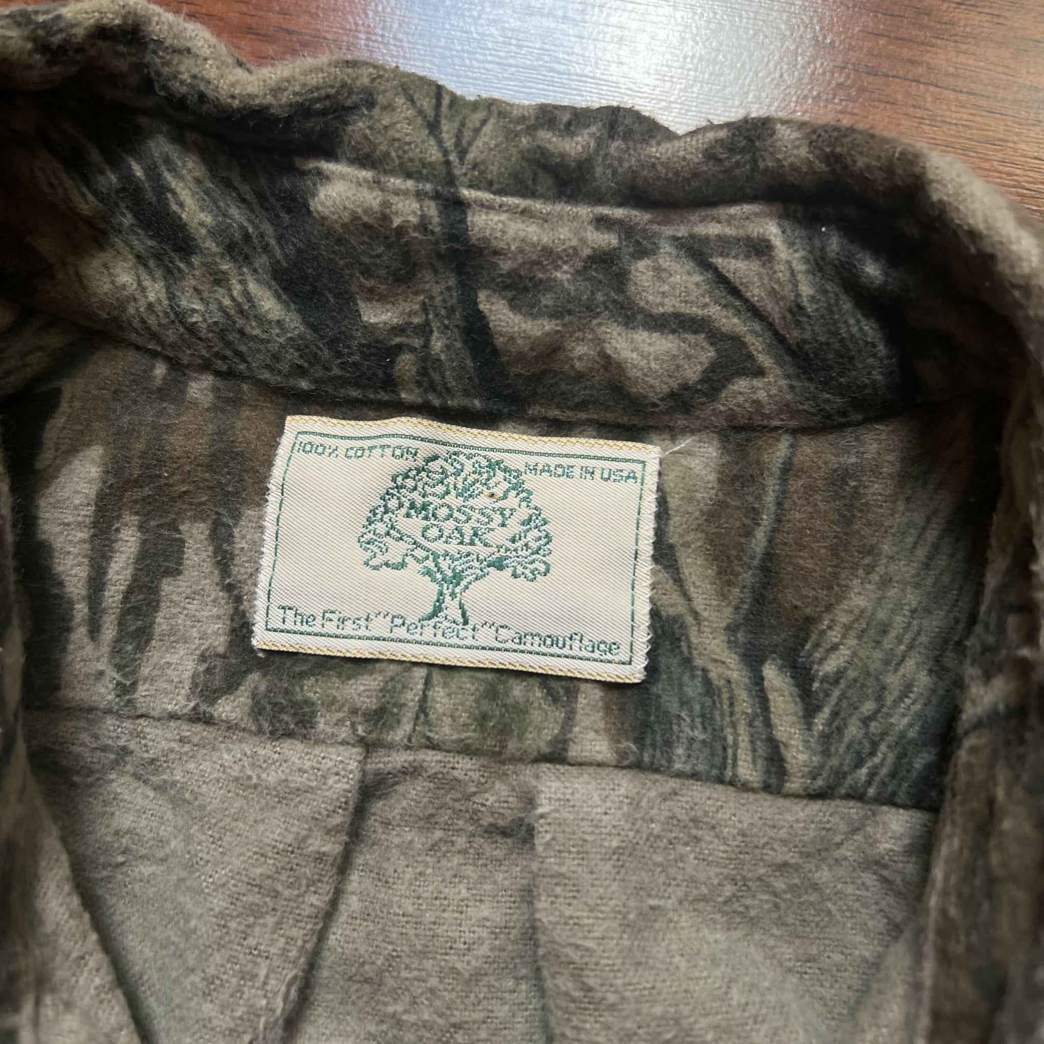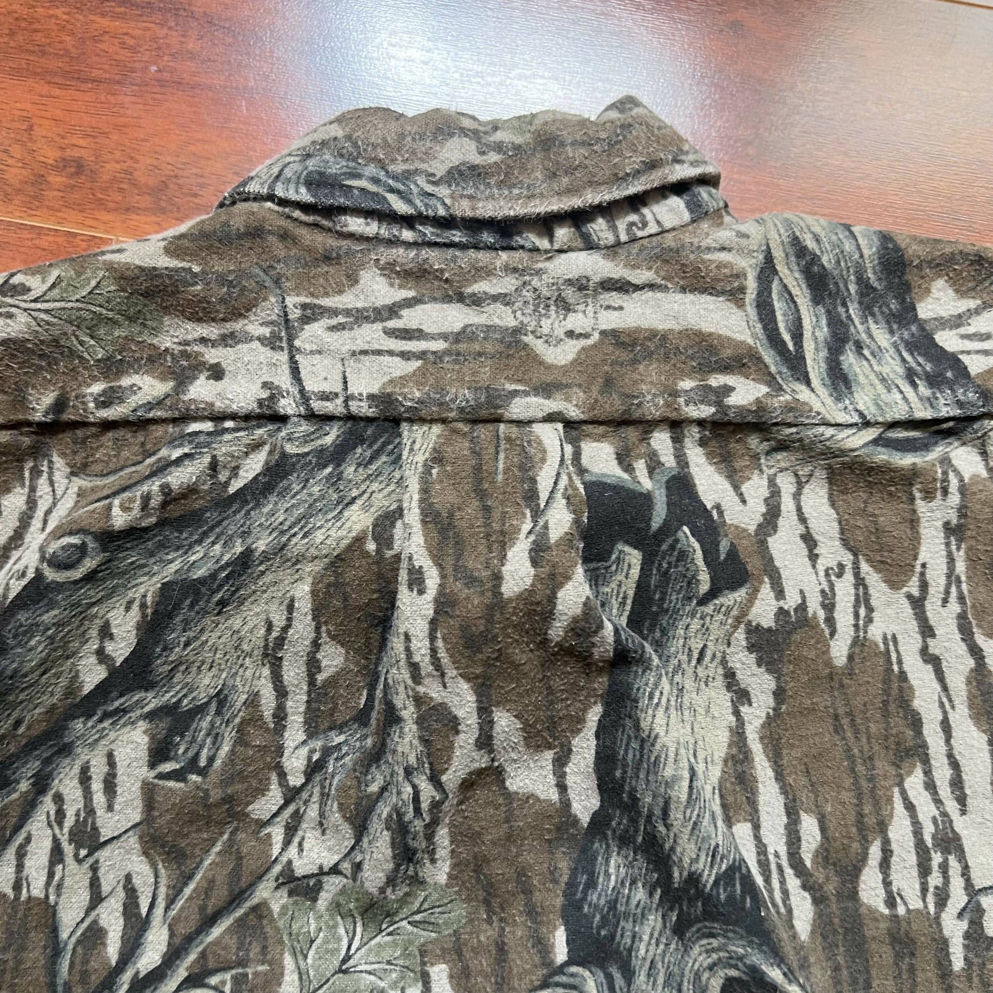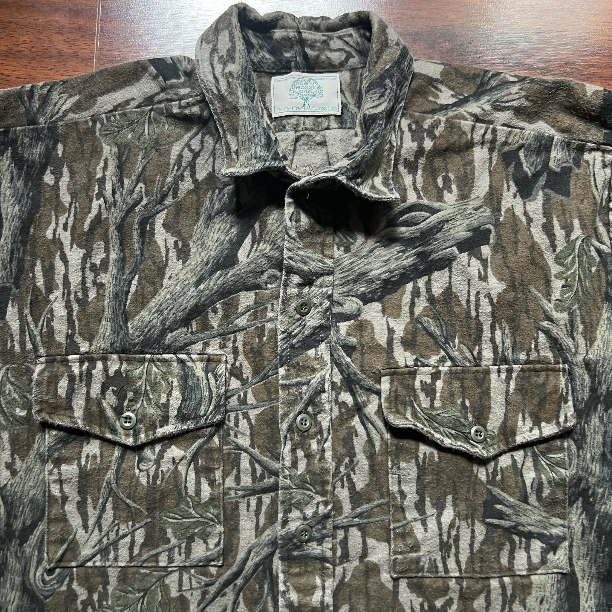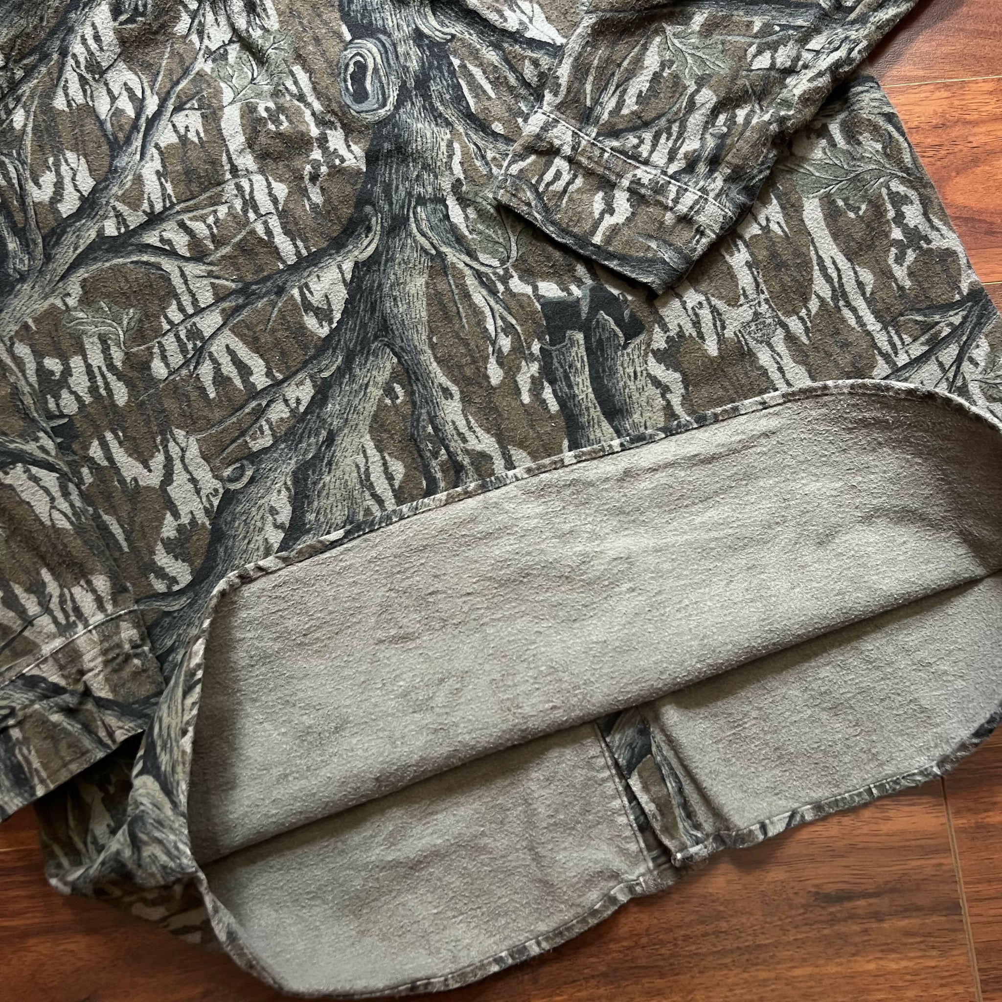 Great condition. No stains or distressing. Excellent heavyweight chamois quality. No size tag, but fits like a XL (refer to measurements). 100% cotton. Original Mossy Oak Treestand camo. Made in USA.