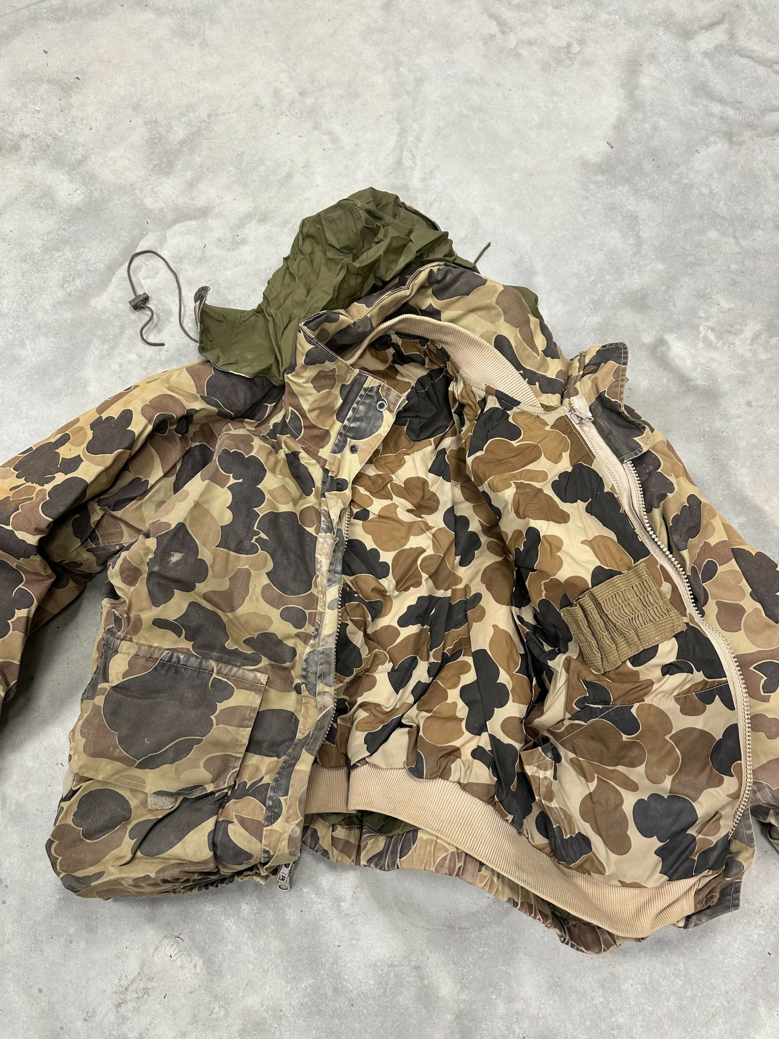 Late 1980s brown camo Columbia jacket. Liner zips out, has hood. Size Large