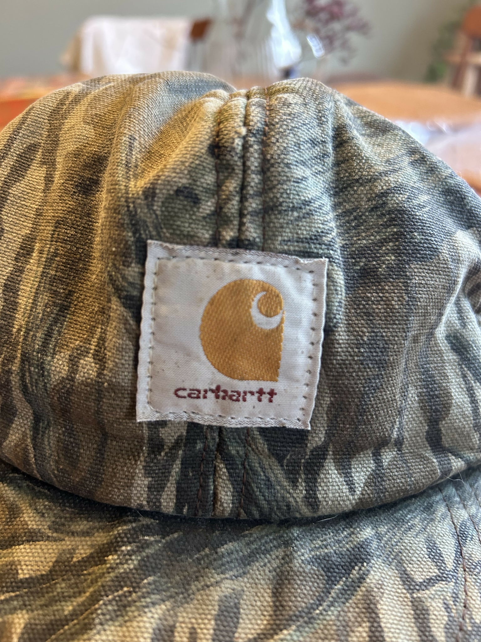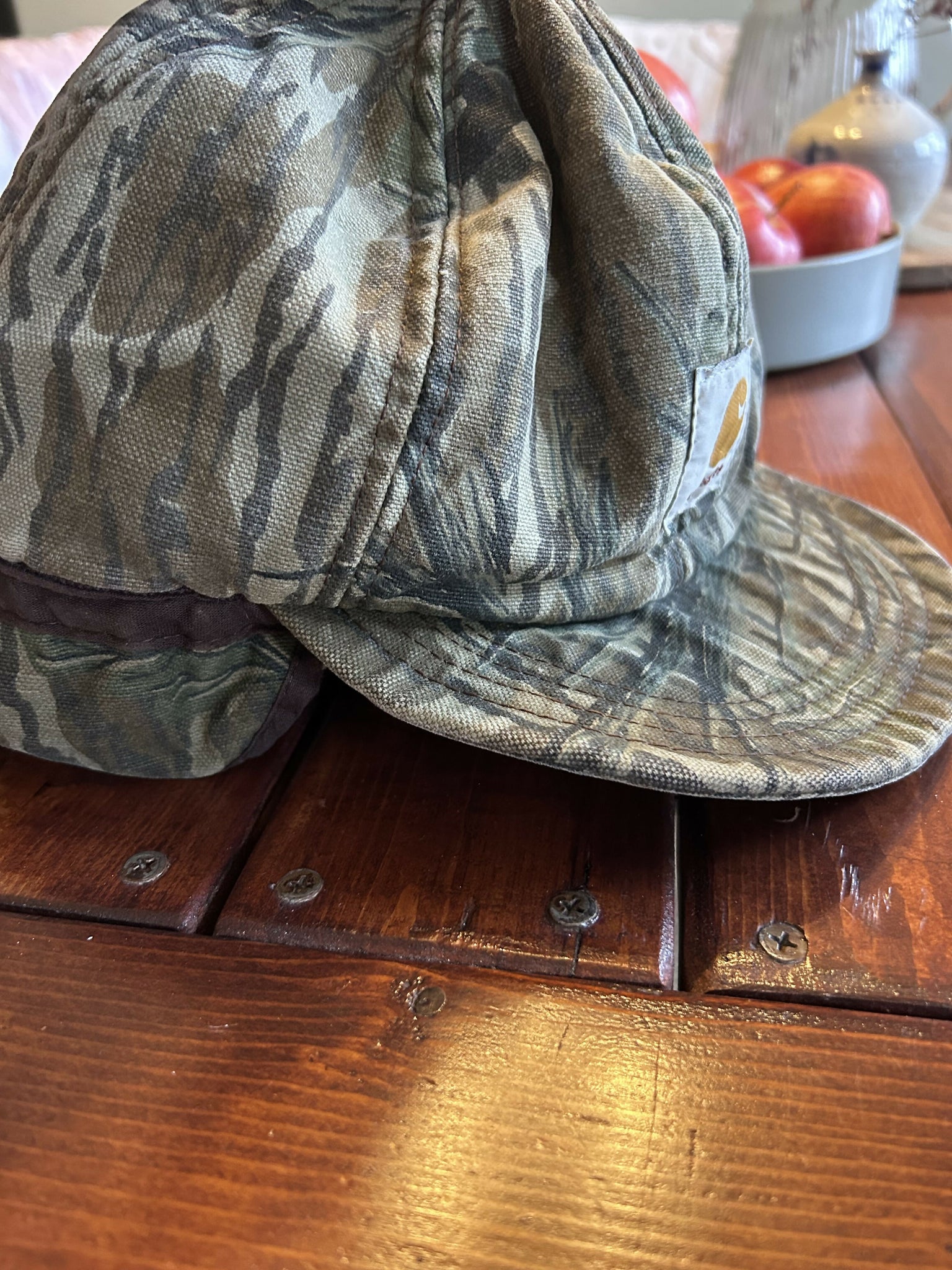 Authentic vintage Carhartt camouflage winter cap with quilted lining and ear flaps.