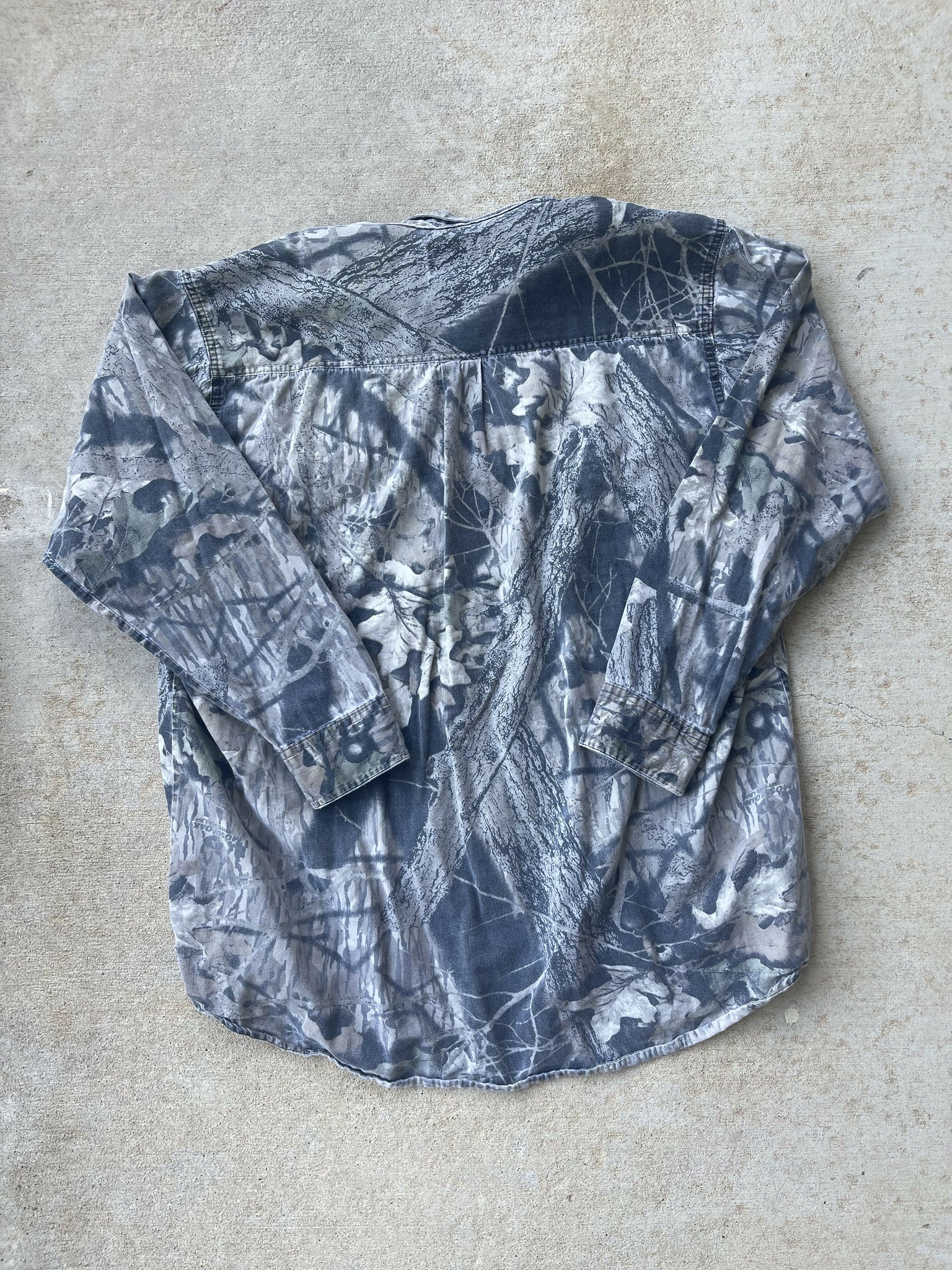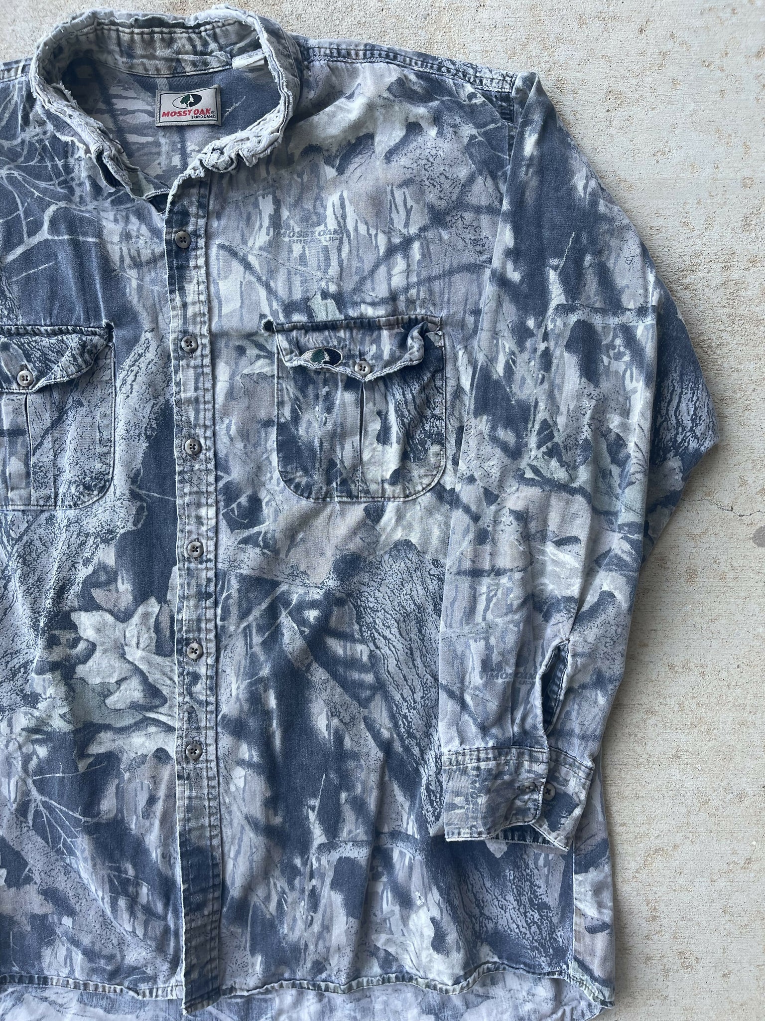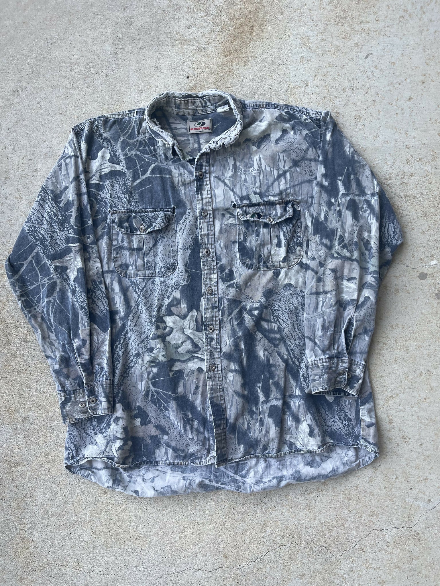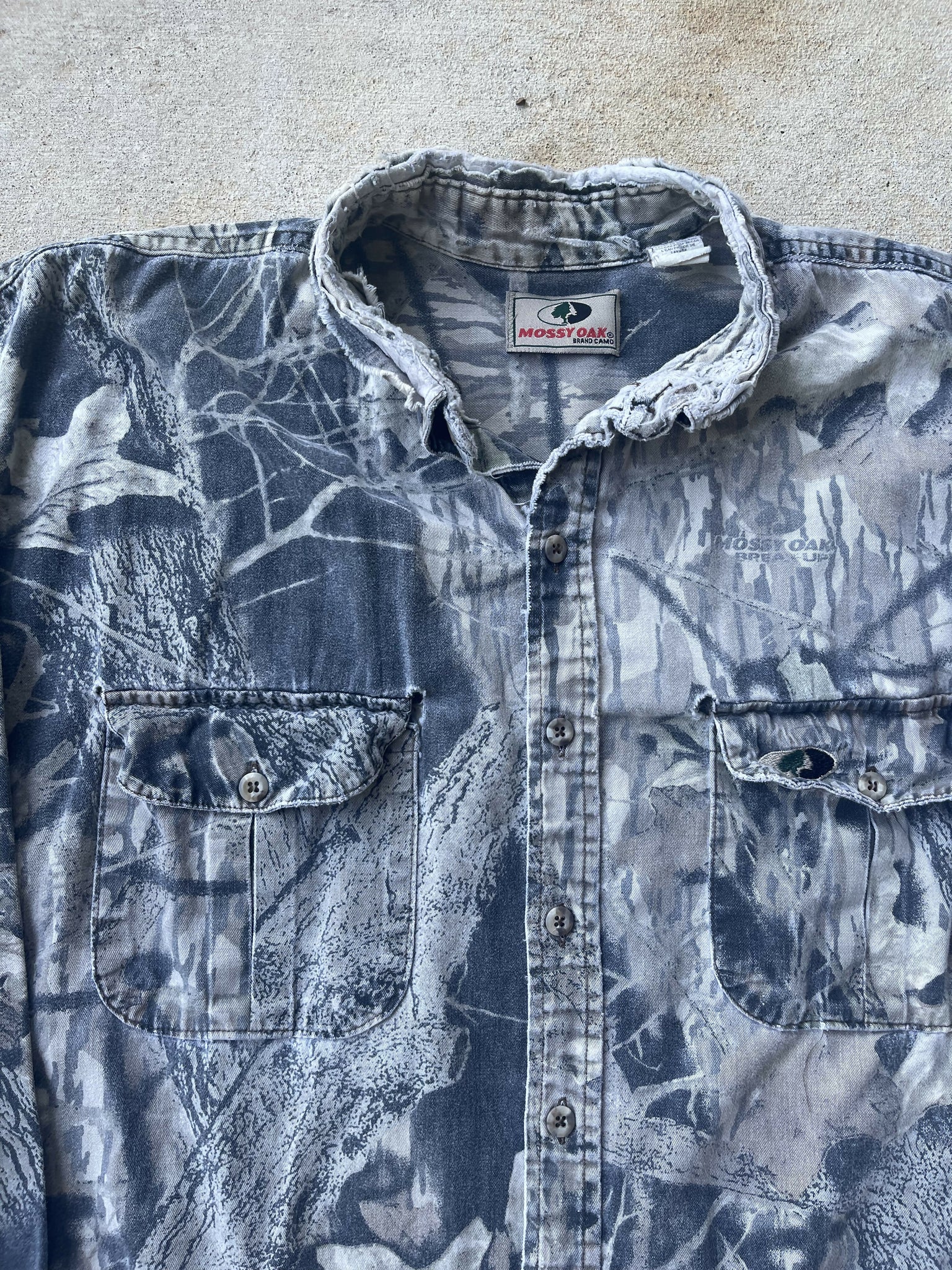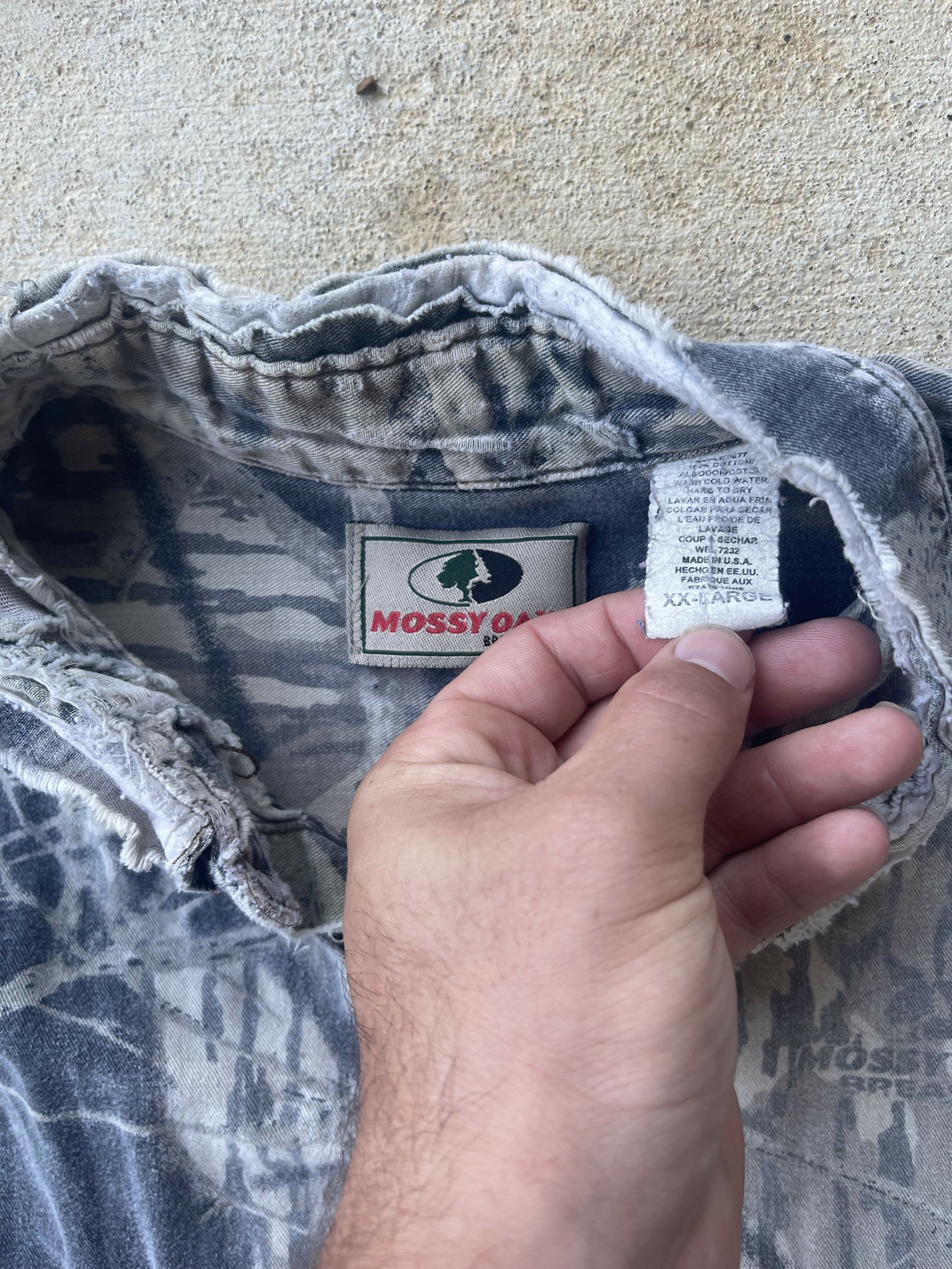 Vintage Distressed & Faded Mossy Oak Breakup Camo Button-Up Shirt (2XL)