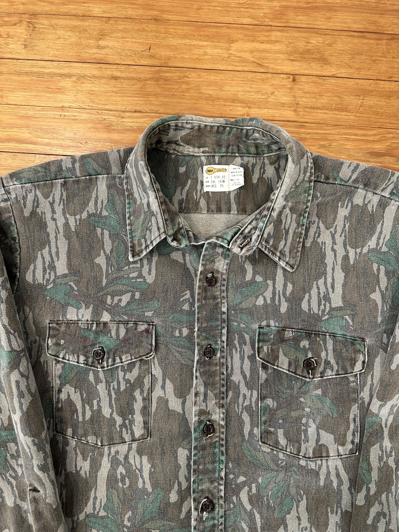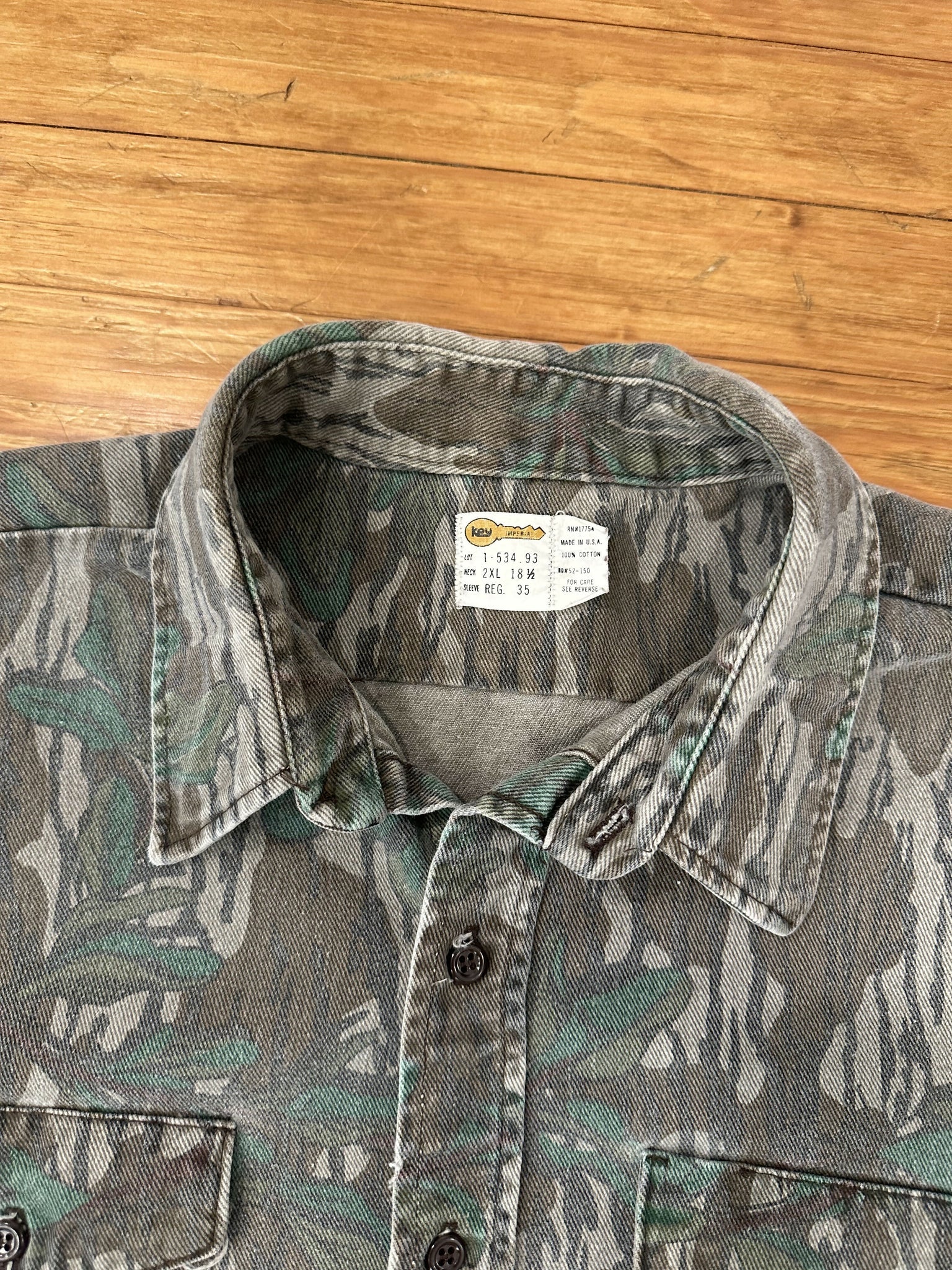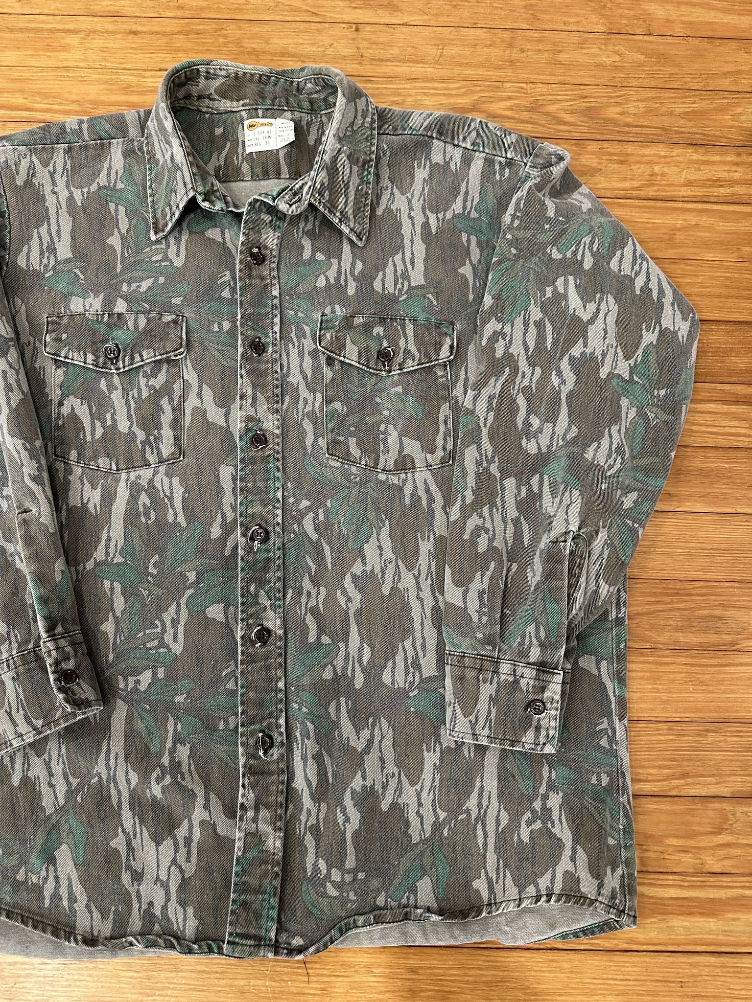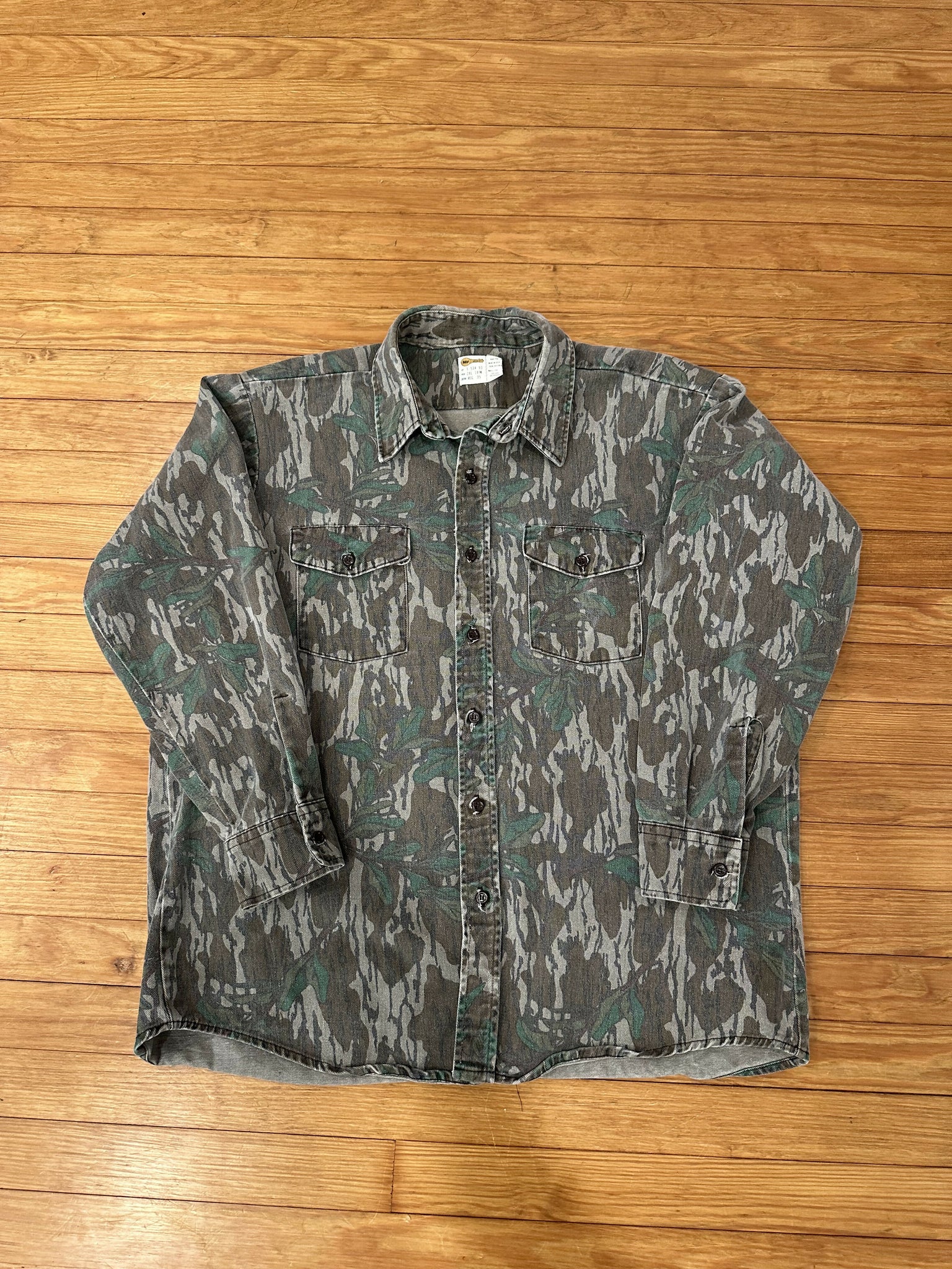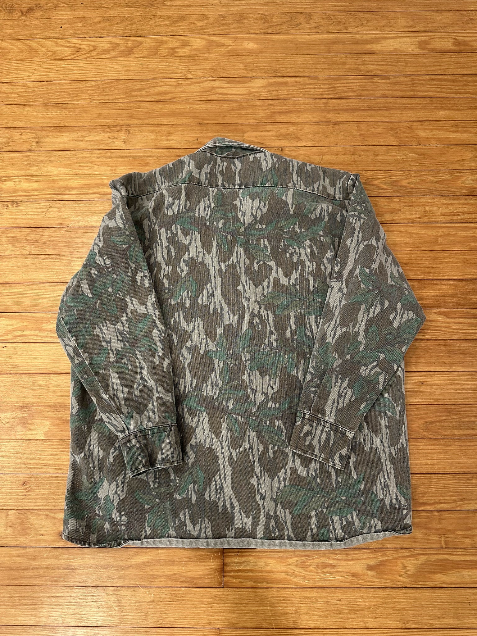 Vintage Key Imperial Mossy Oak Greenleaf Camo Denim Button Up Shirt (XL)