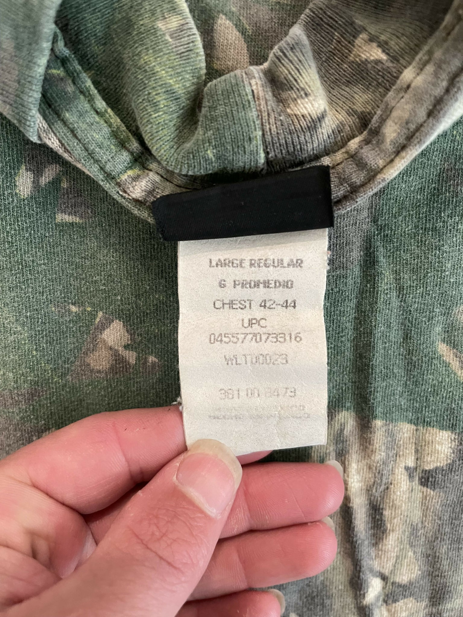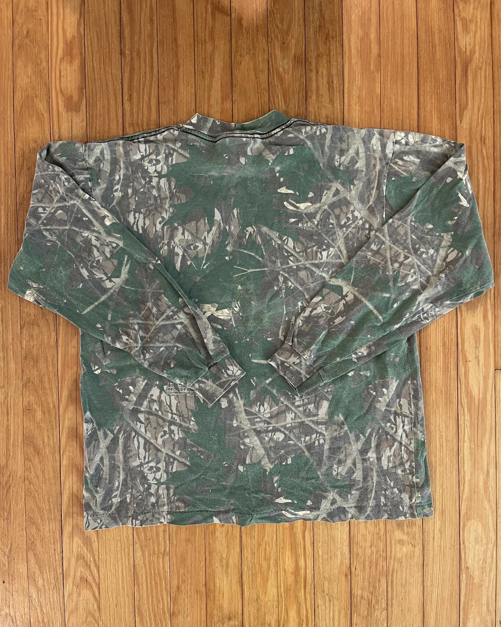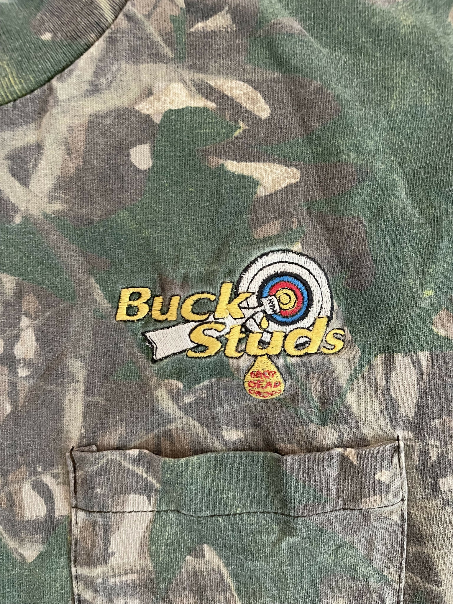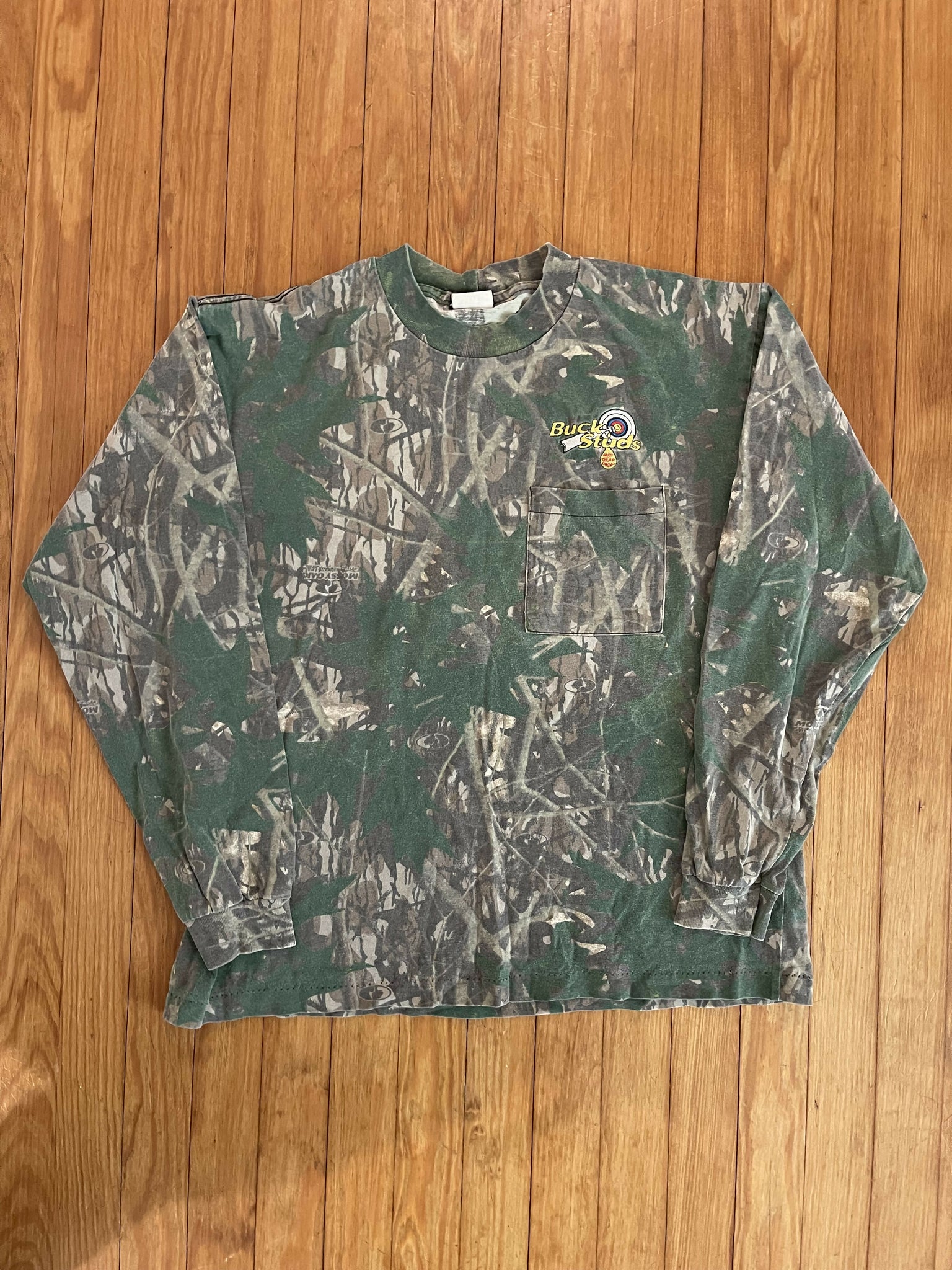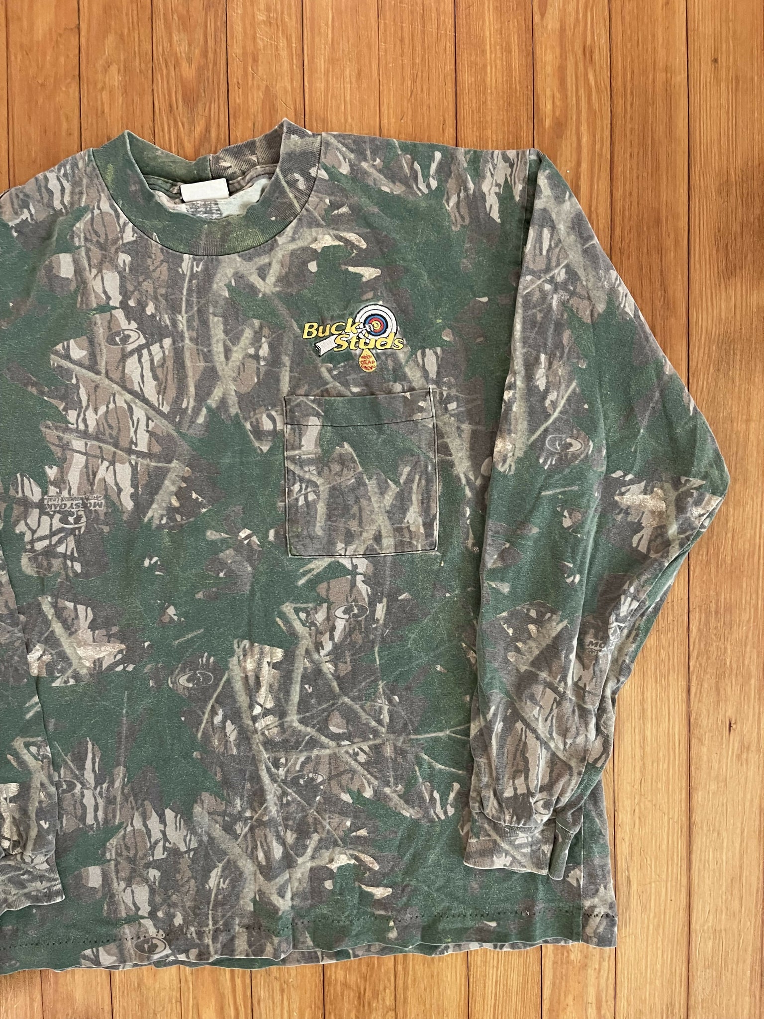 Vintage Mossy Oak Shadow Leaf Camo Buck Studs Drop Dead Drops Embroidery Long Sleeve Shirt (L)