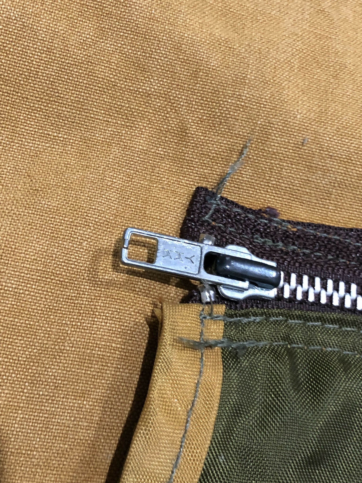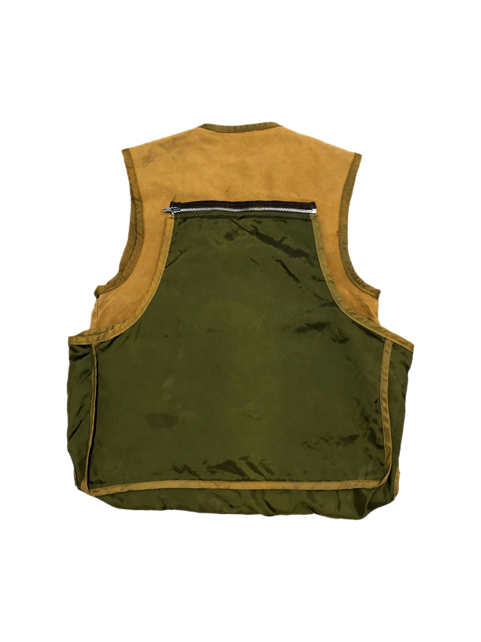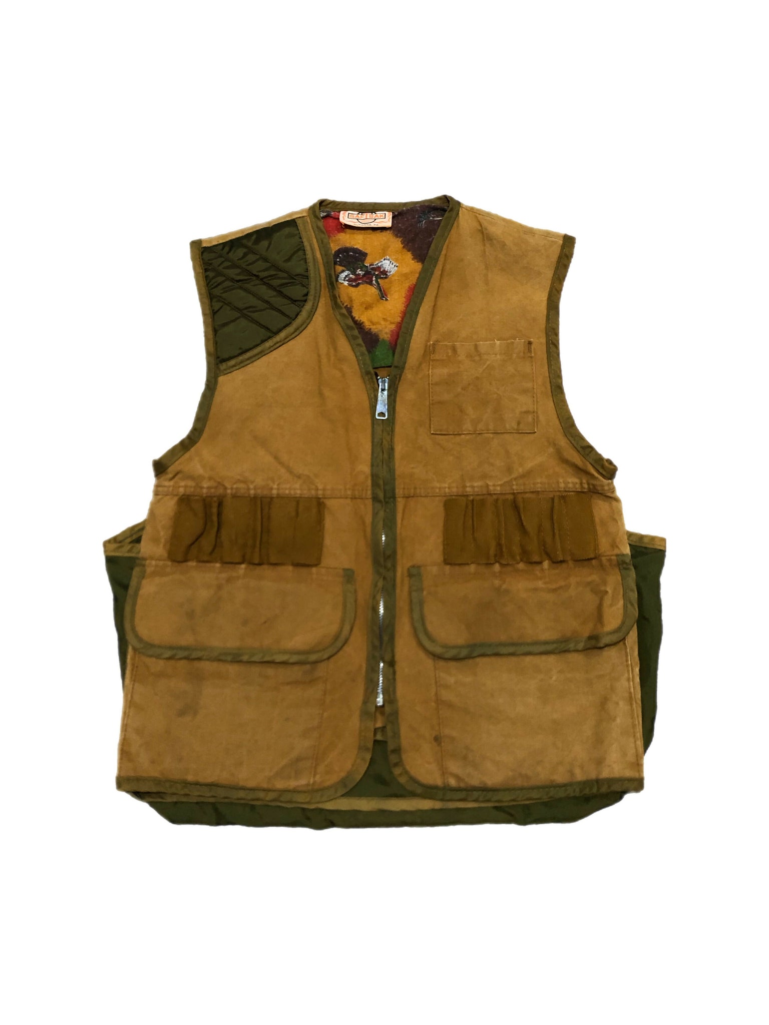 Tan brown canvas vest. Full zip front. Padded right shoulder for shooting. Cargo pockets on both sides. Art of pheasants inside in the vest. Zip up bird collection bag attached on back. Small stains next to bottom left pocket. Small stains on backside on green bird bag attached.