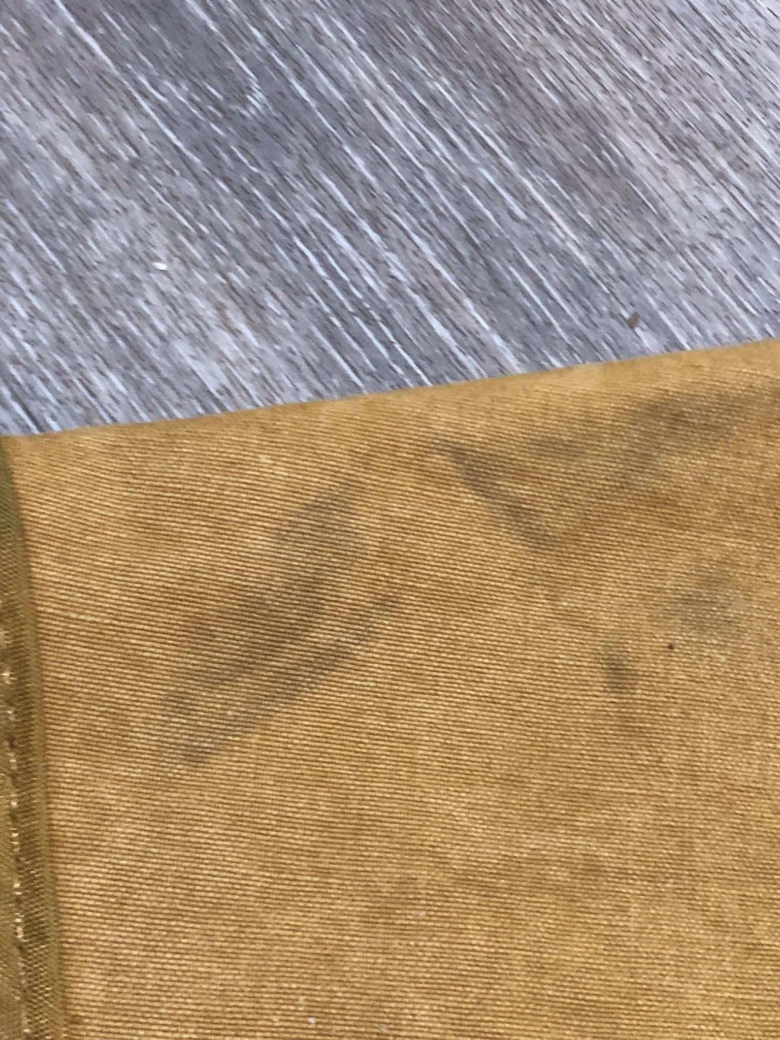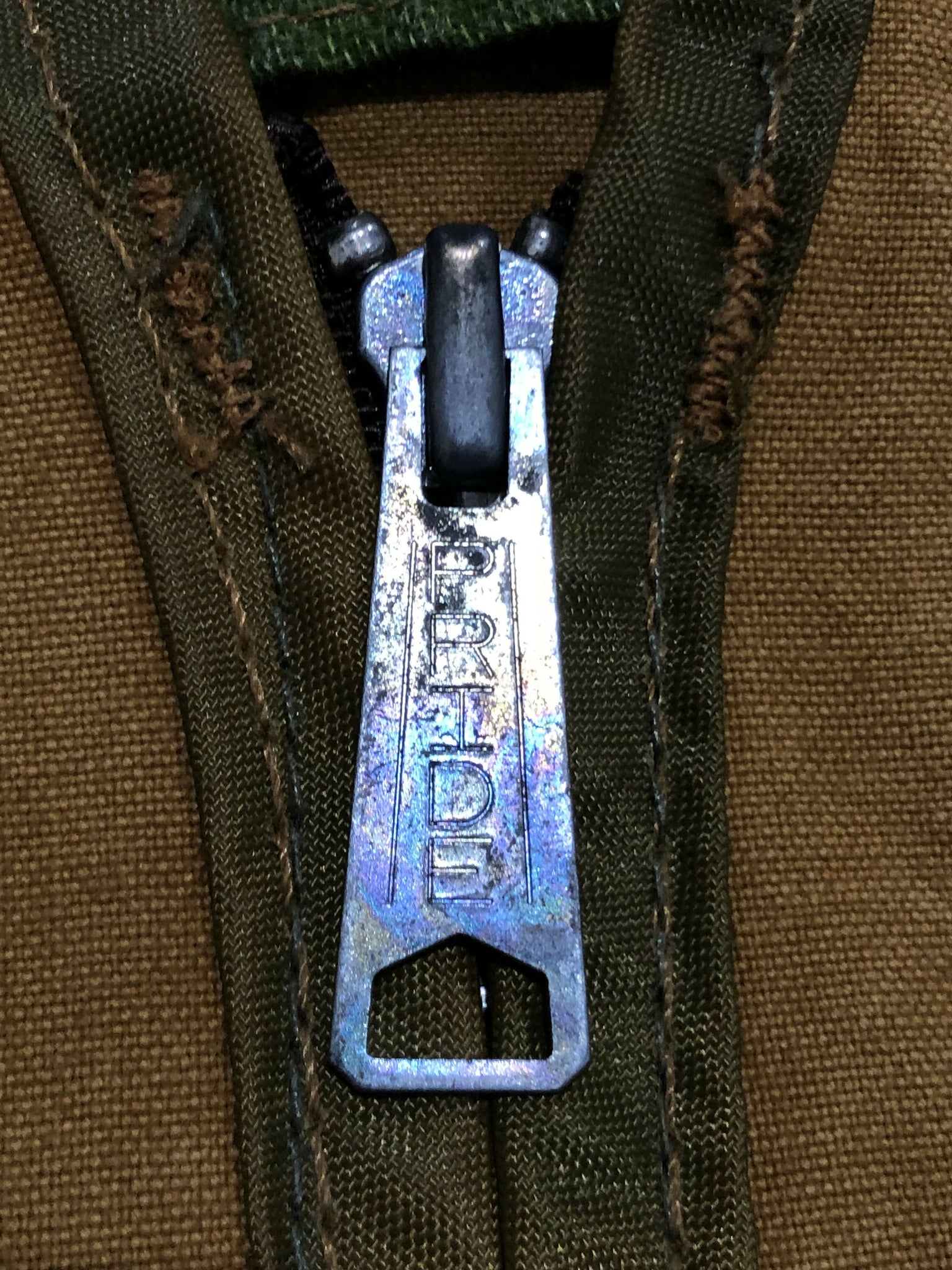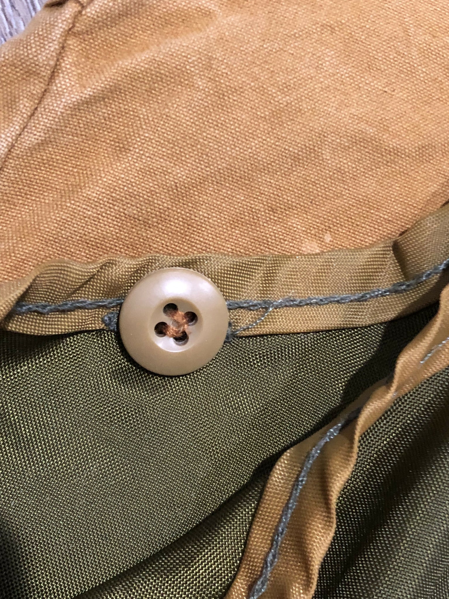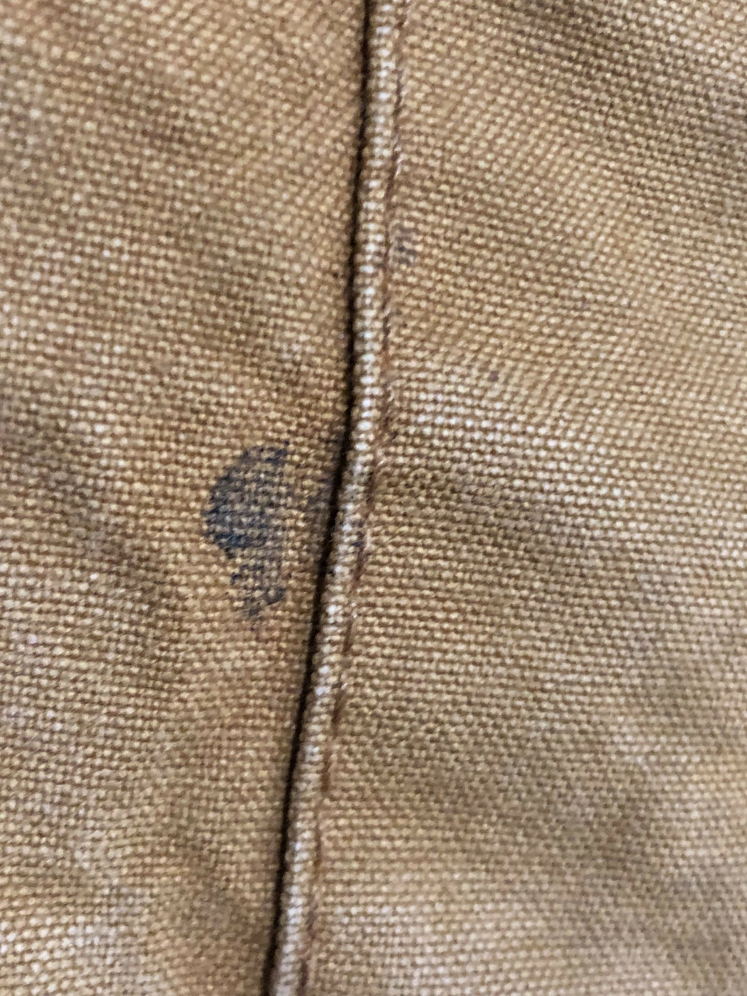 Tan brown canvas vest. Full zip front. Padded right shoulder for shooting. Cargo pockets on both sides. Art of pheasants inside in the vest. Zip up bird collection bag attached on back. Small stains next to bottom left pocket. Small stains on backside on green bird bag attached.