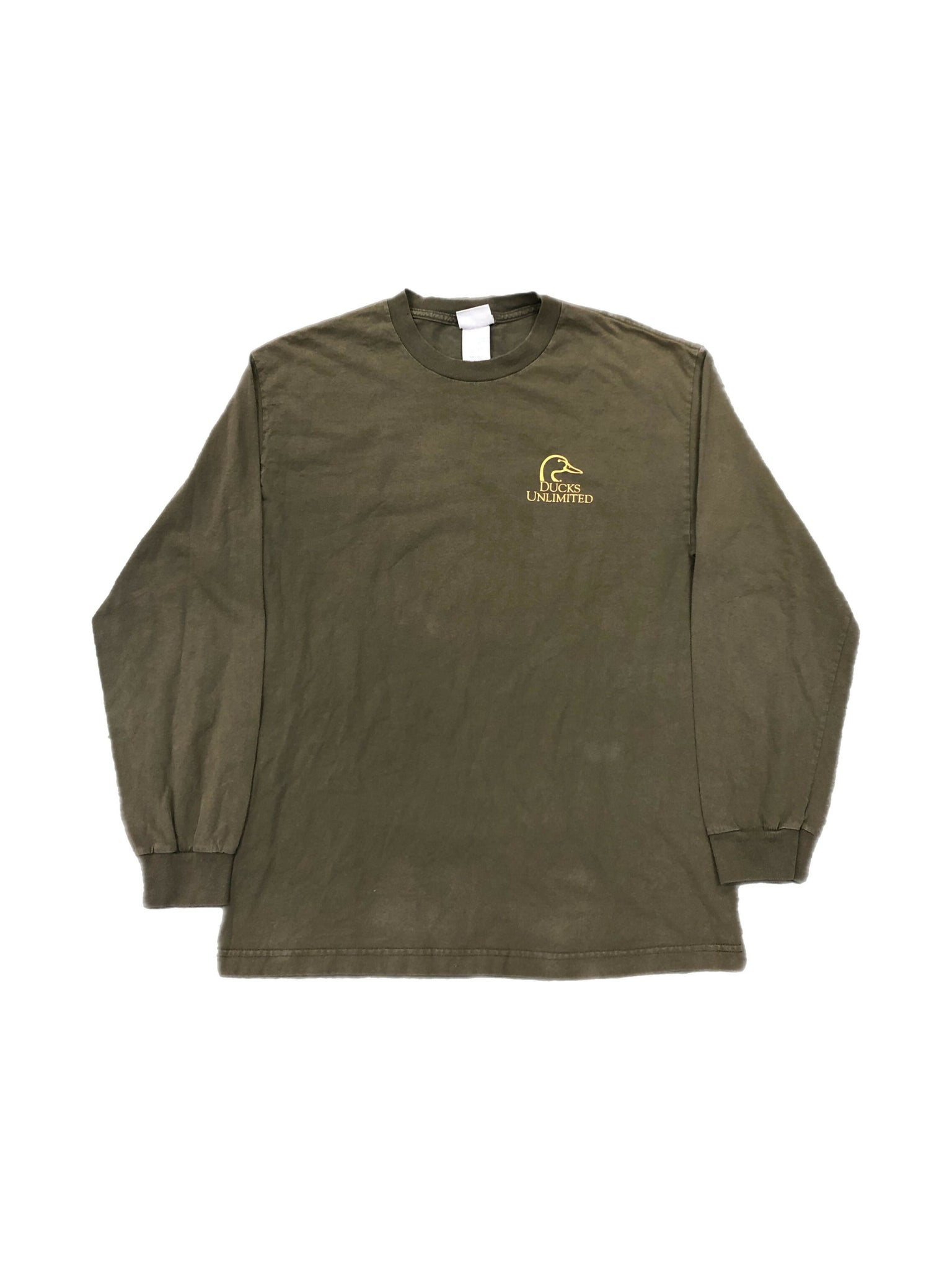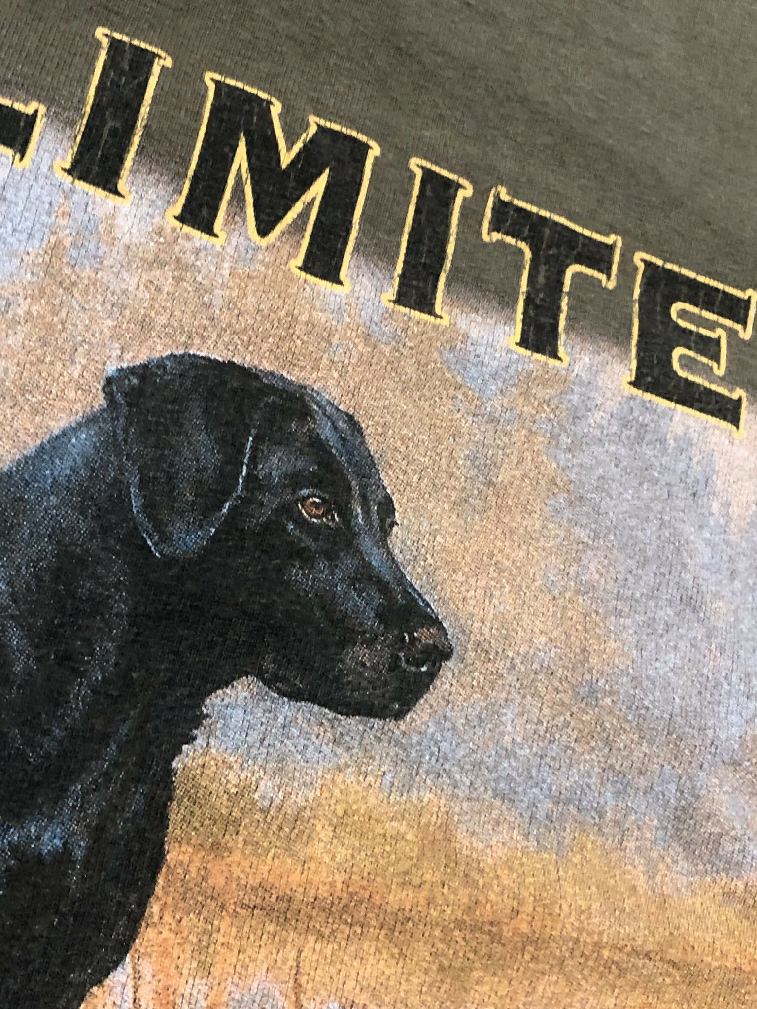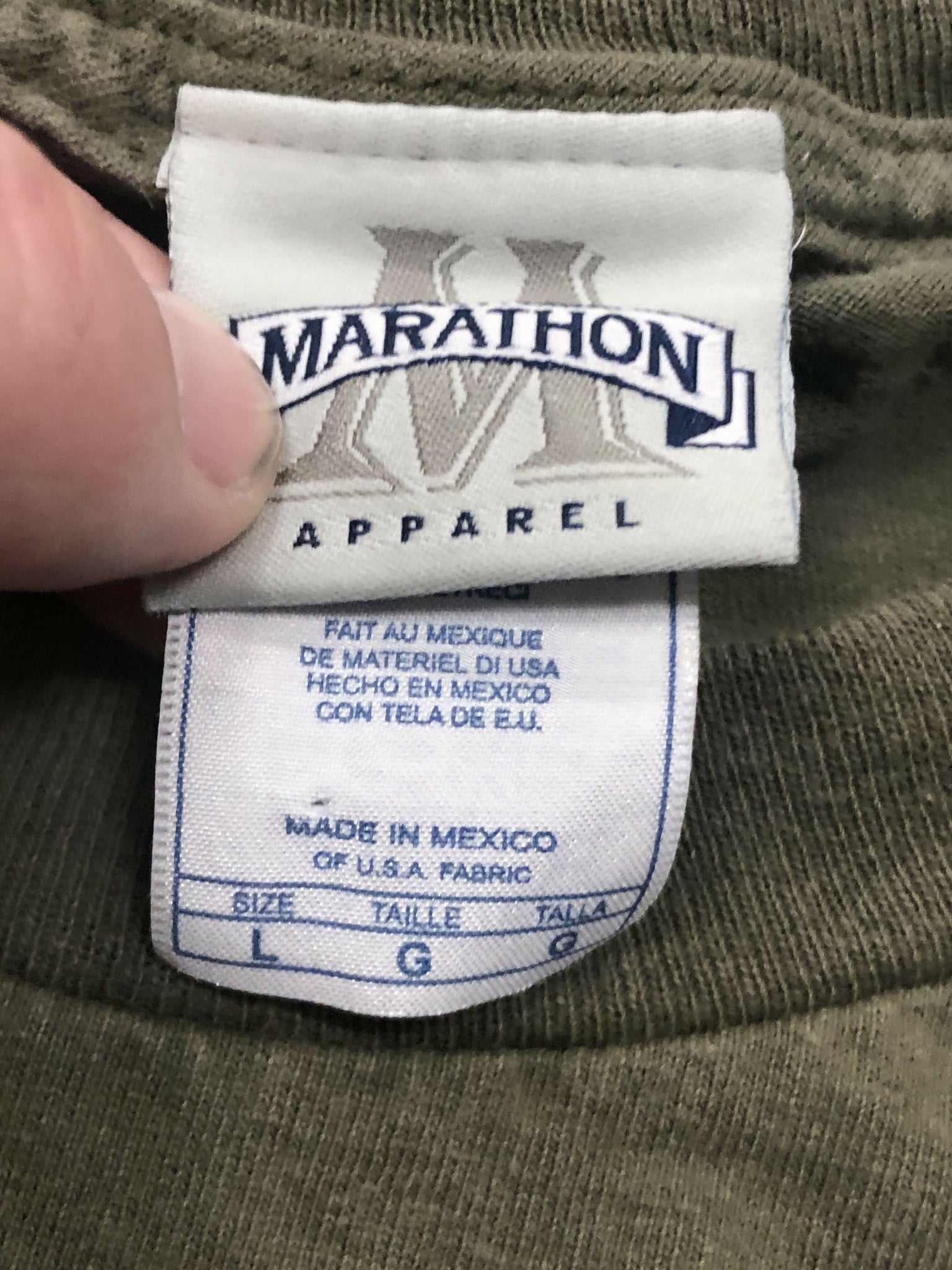 Olive green shirt. Big graphic on back of lab getting ready to retrieve some ducks. Small logo on chest. Double stitch hem. Marathon tag. 100% cotton.
