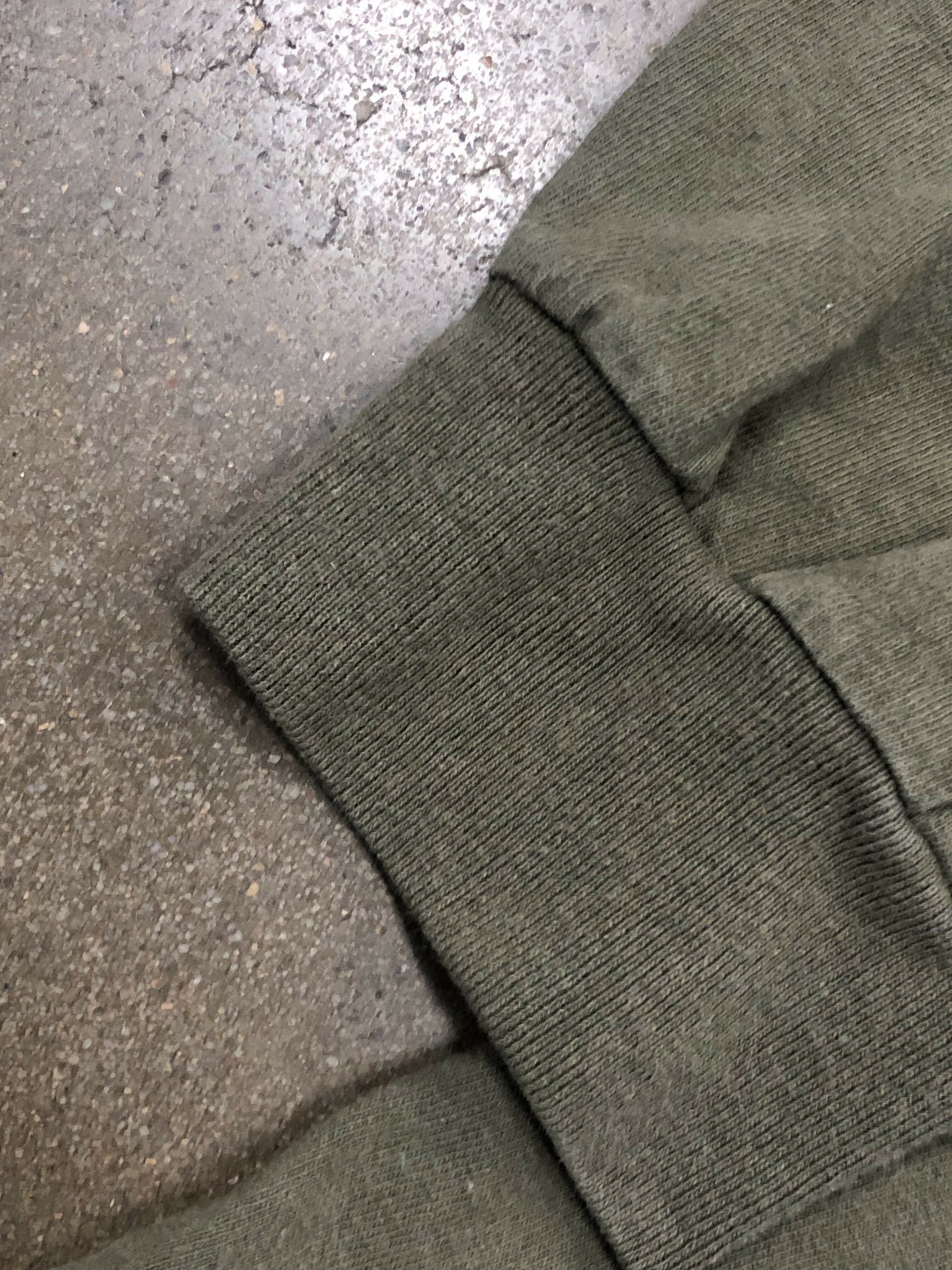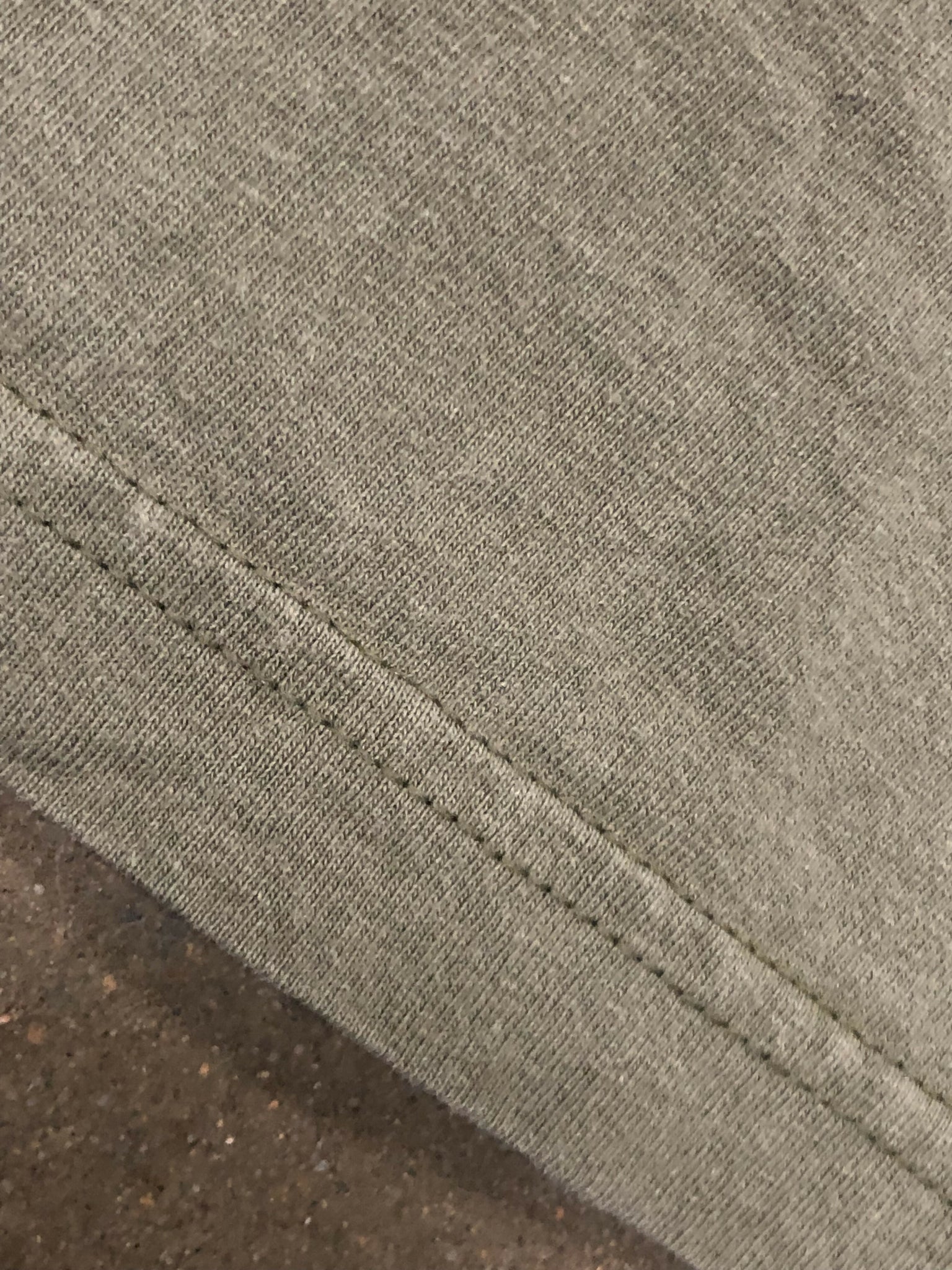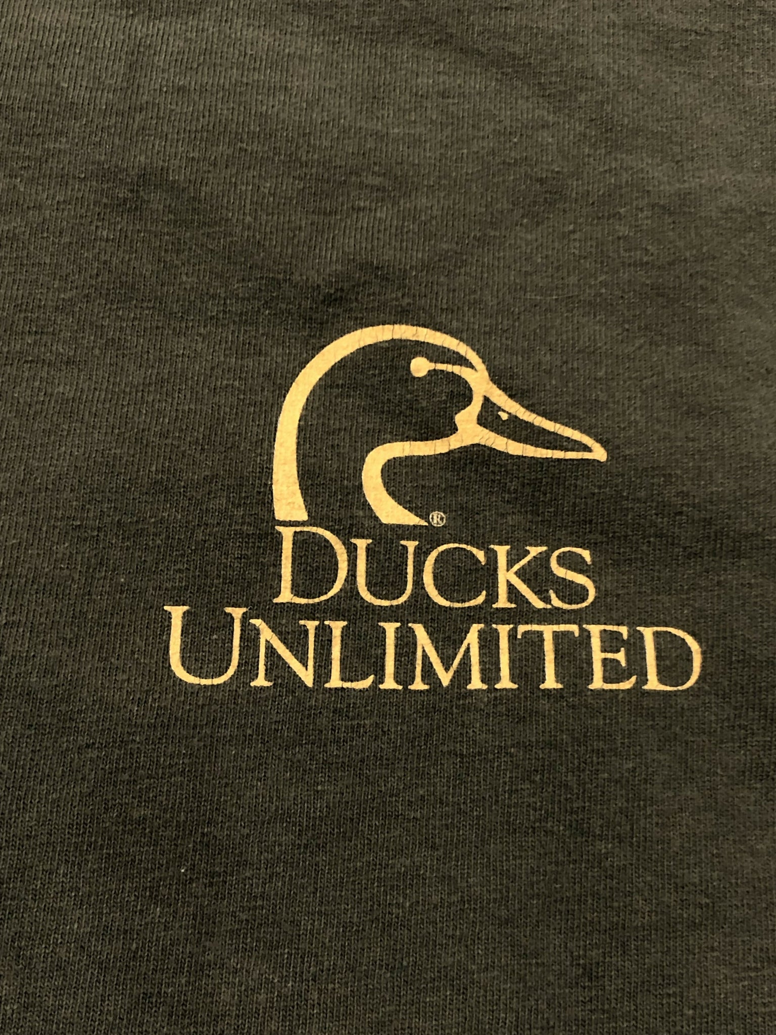 Olive green shirt. Big graphic on back of lab getting ready to retrieve some ducks. Small logo on chest. Double stitch hem. Marathon tag. 100% cotton.
