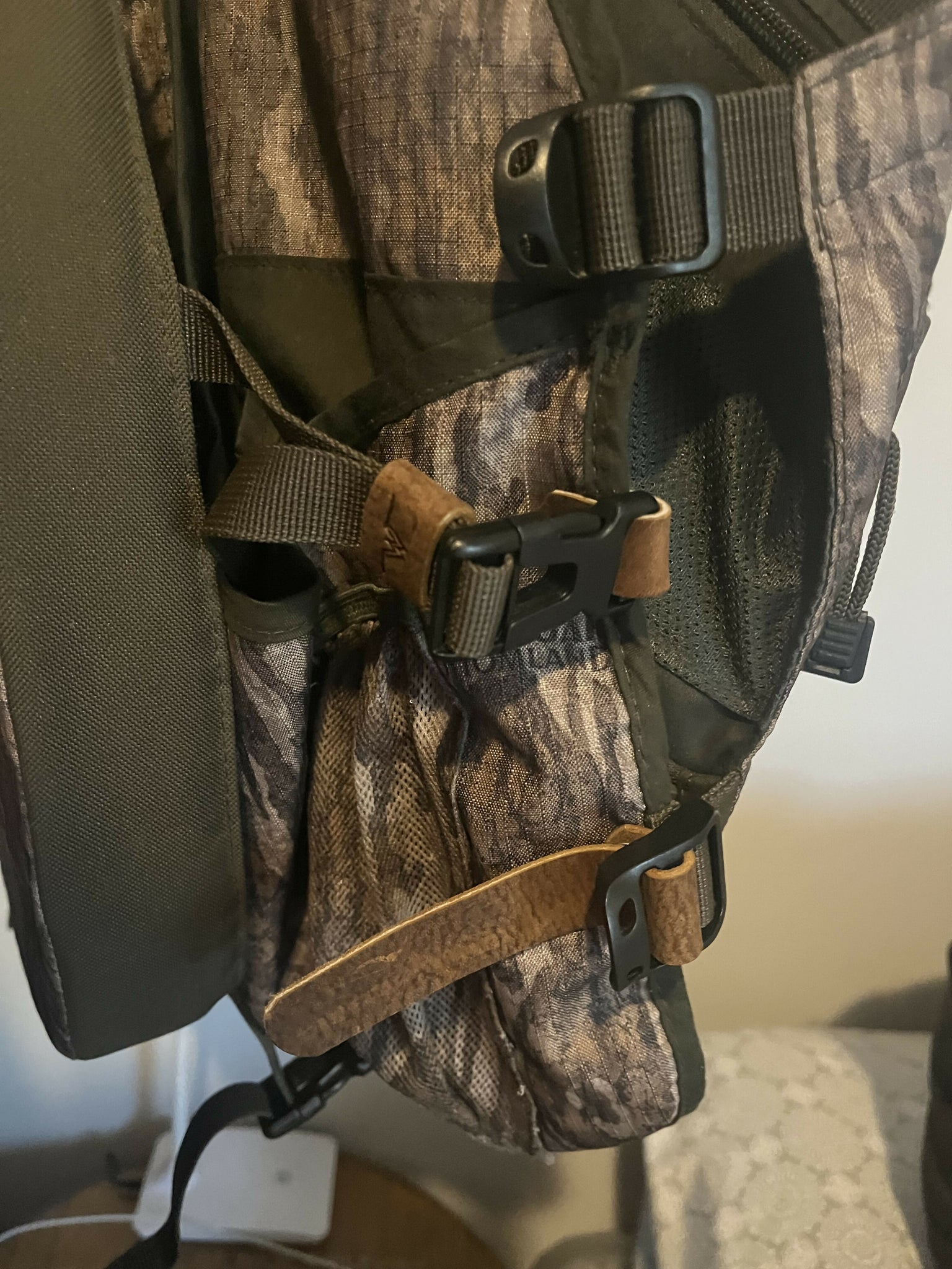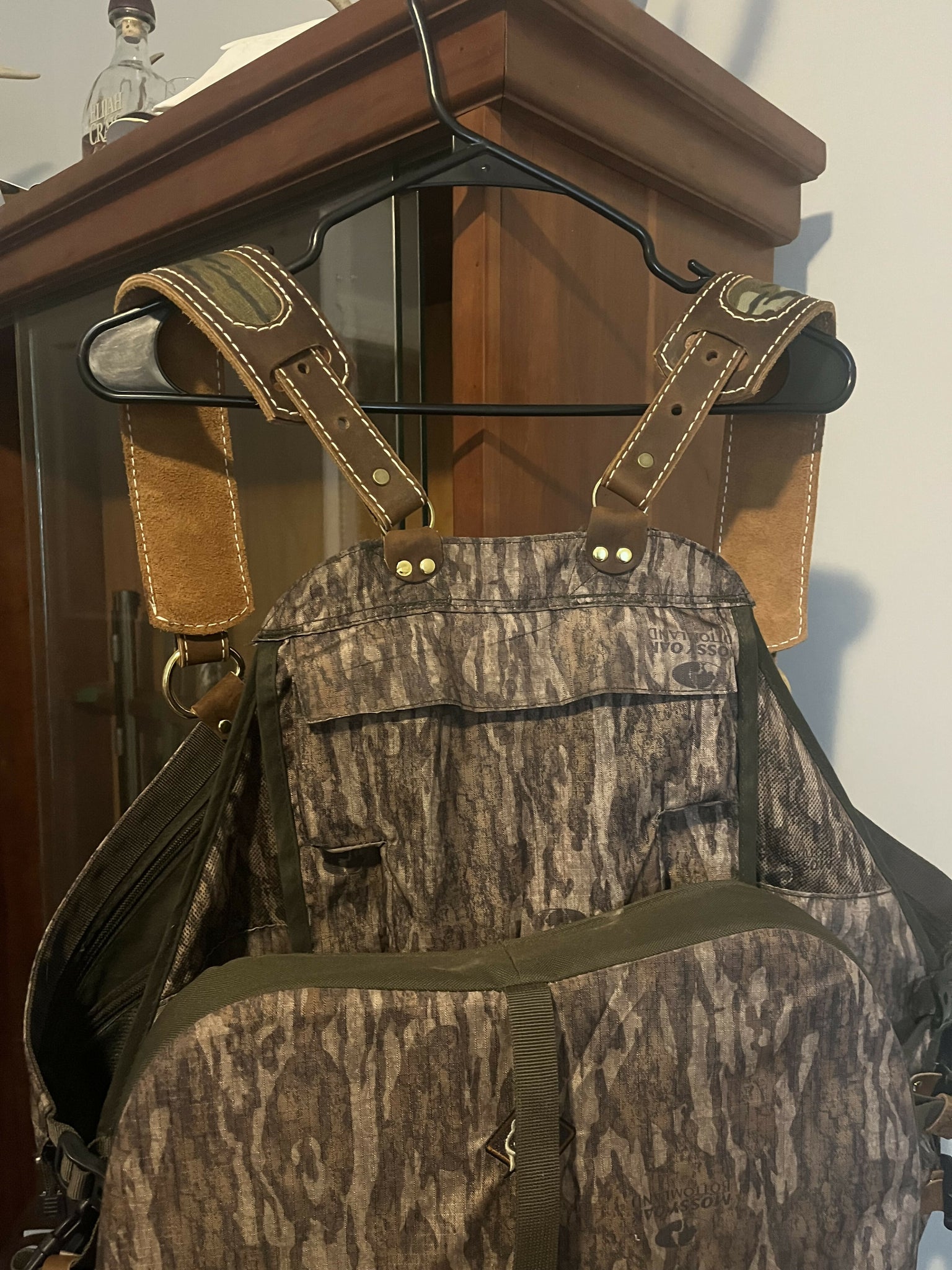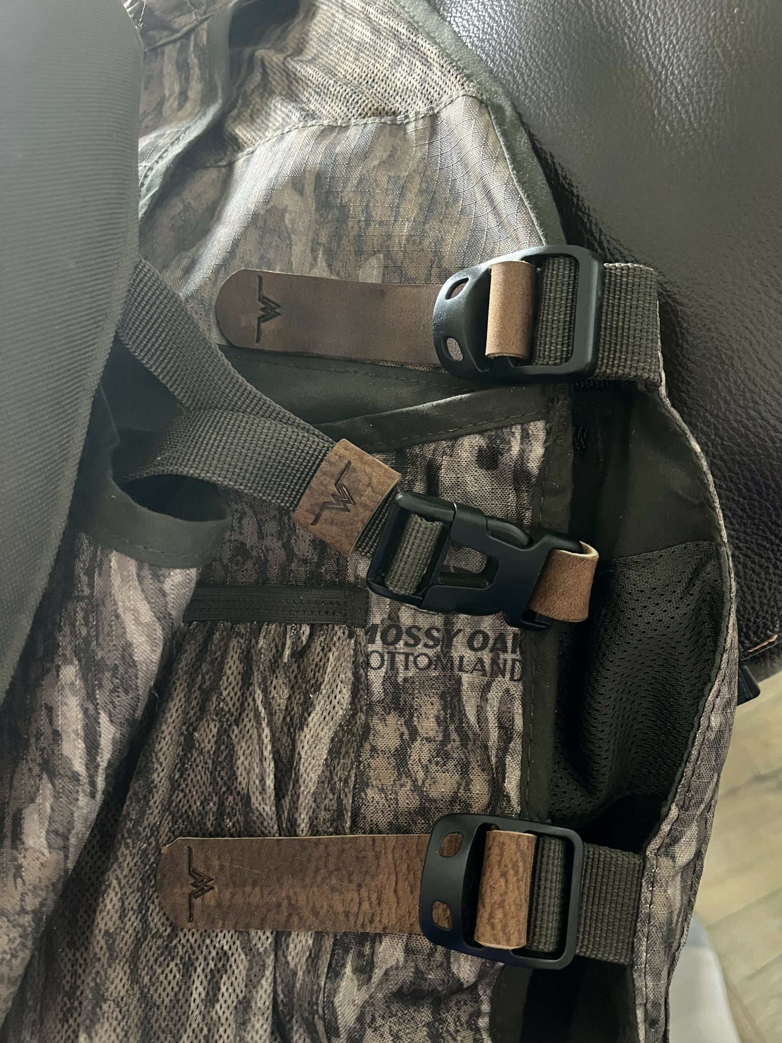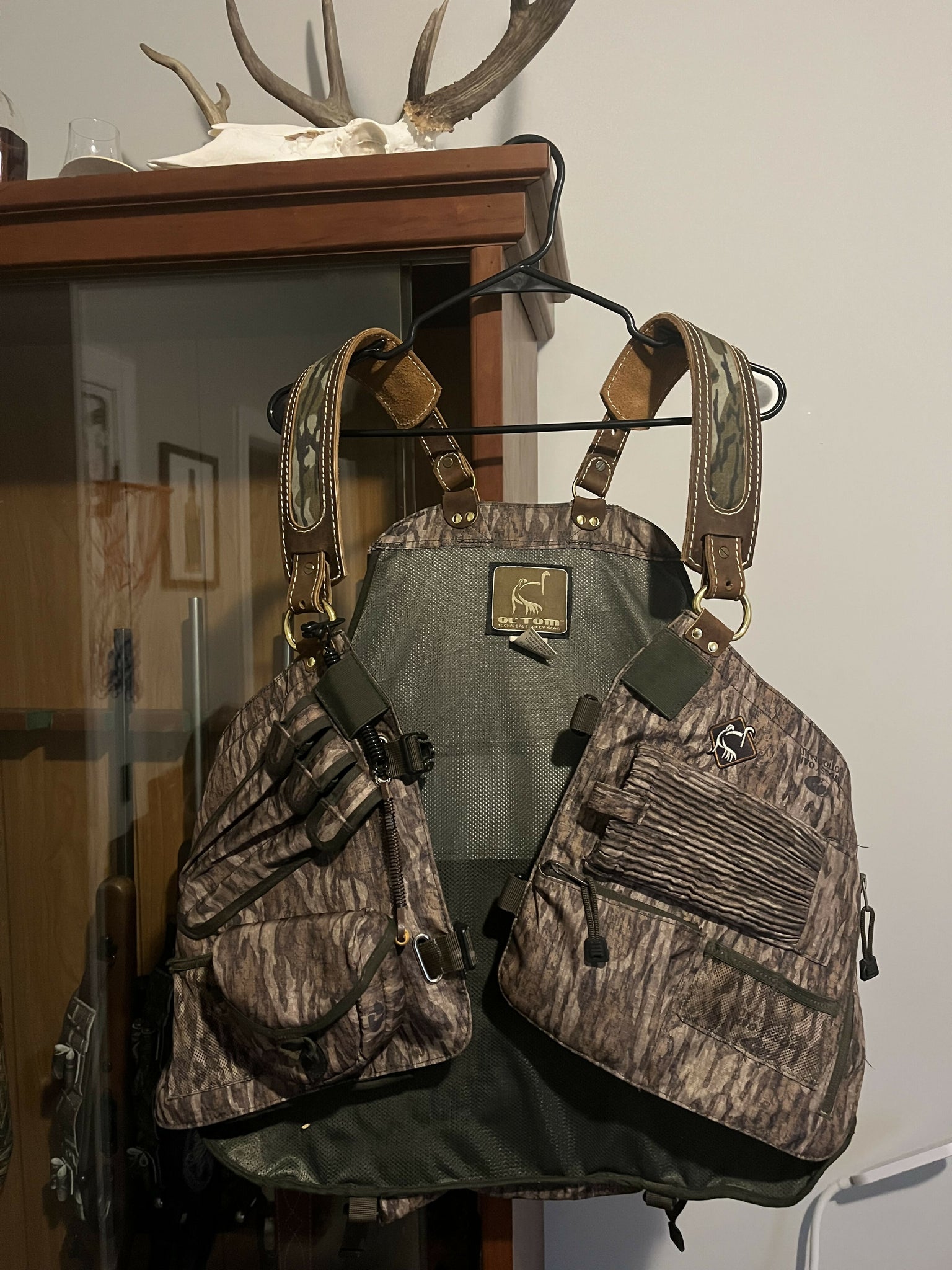 Ol Tom Turkey vest with added modifications. Leather shoulder straps with bottomland inlay. New leather cinch straps and brass hardware.