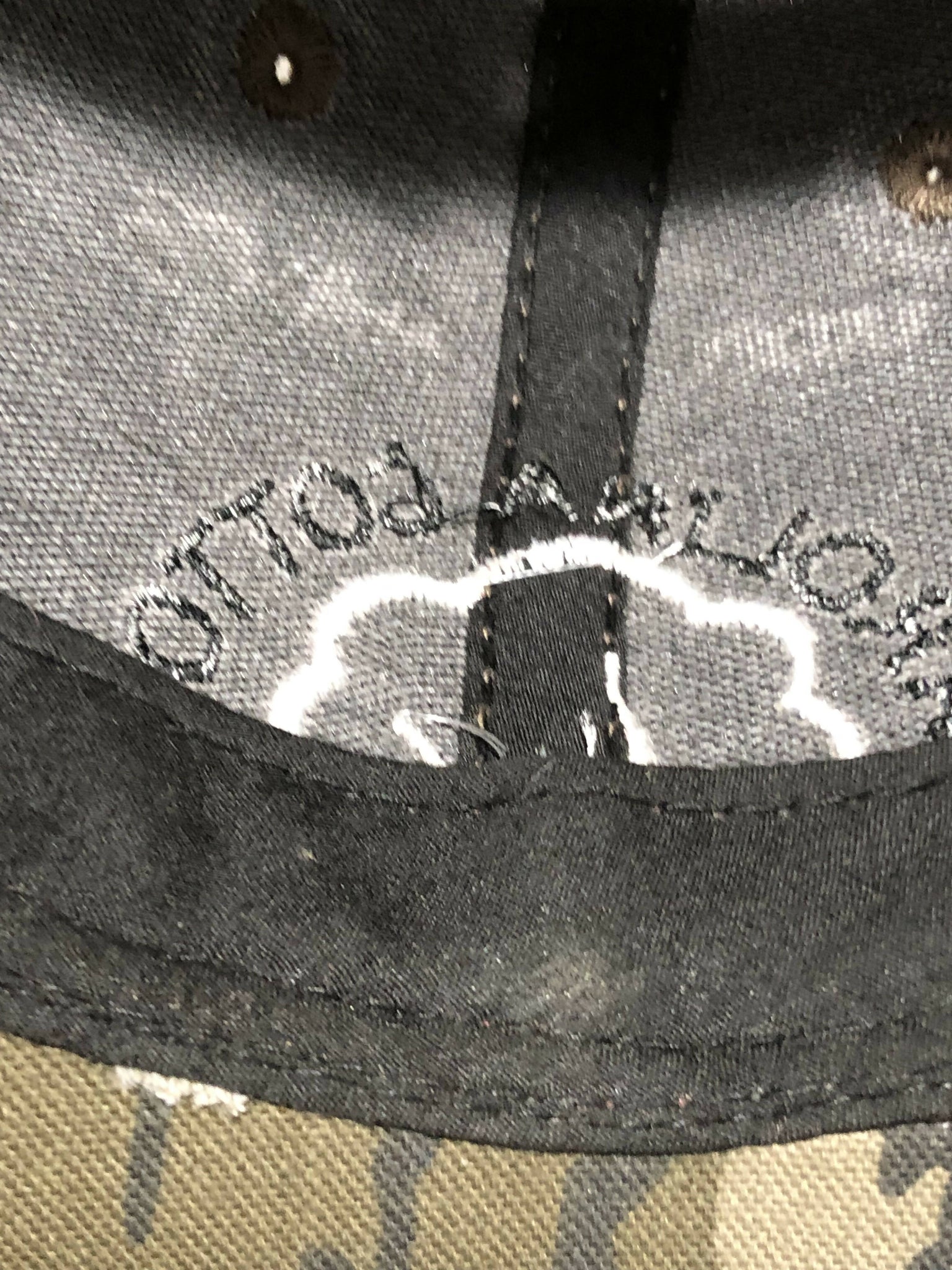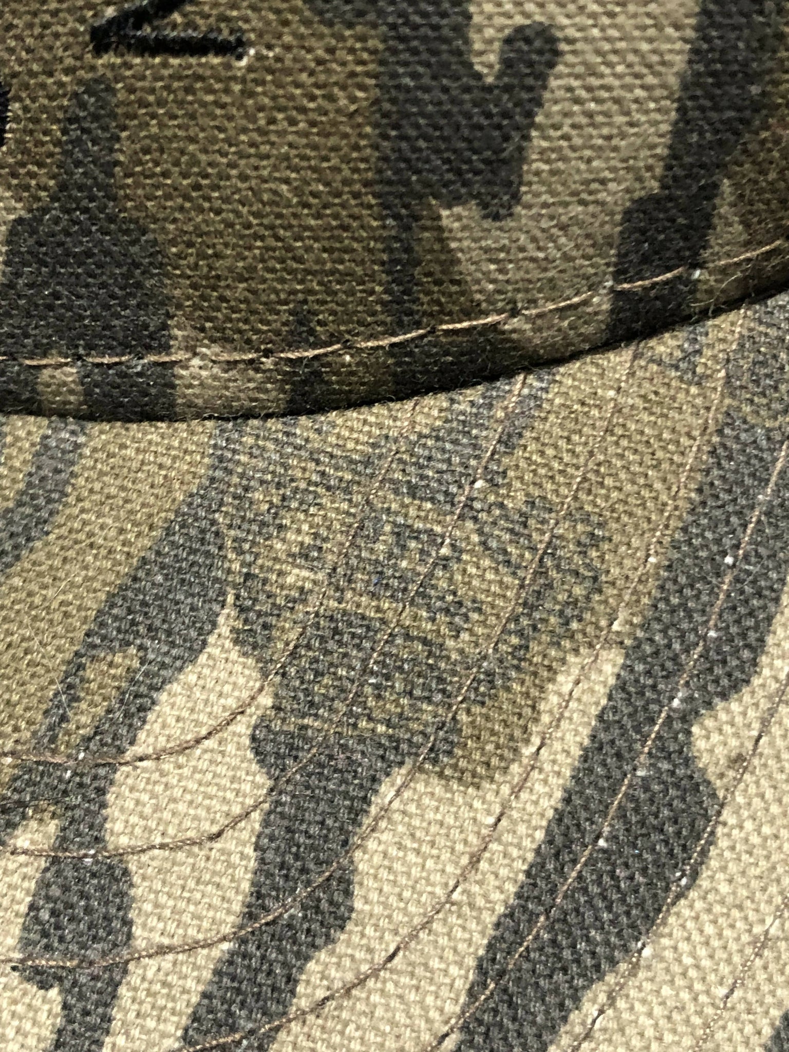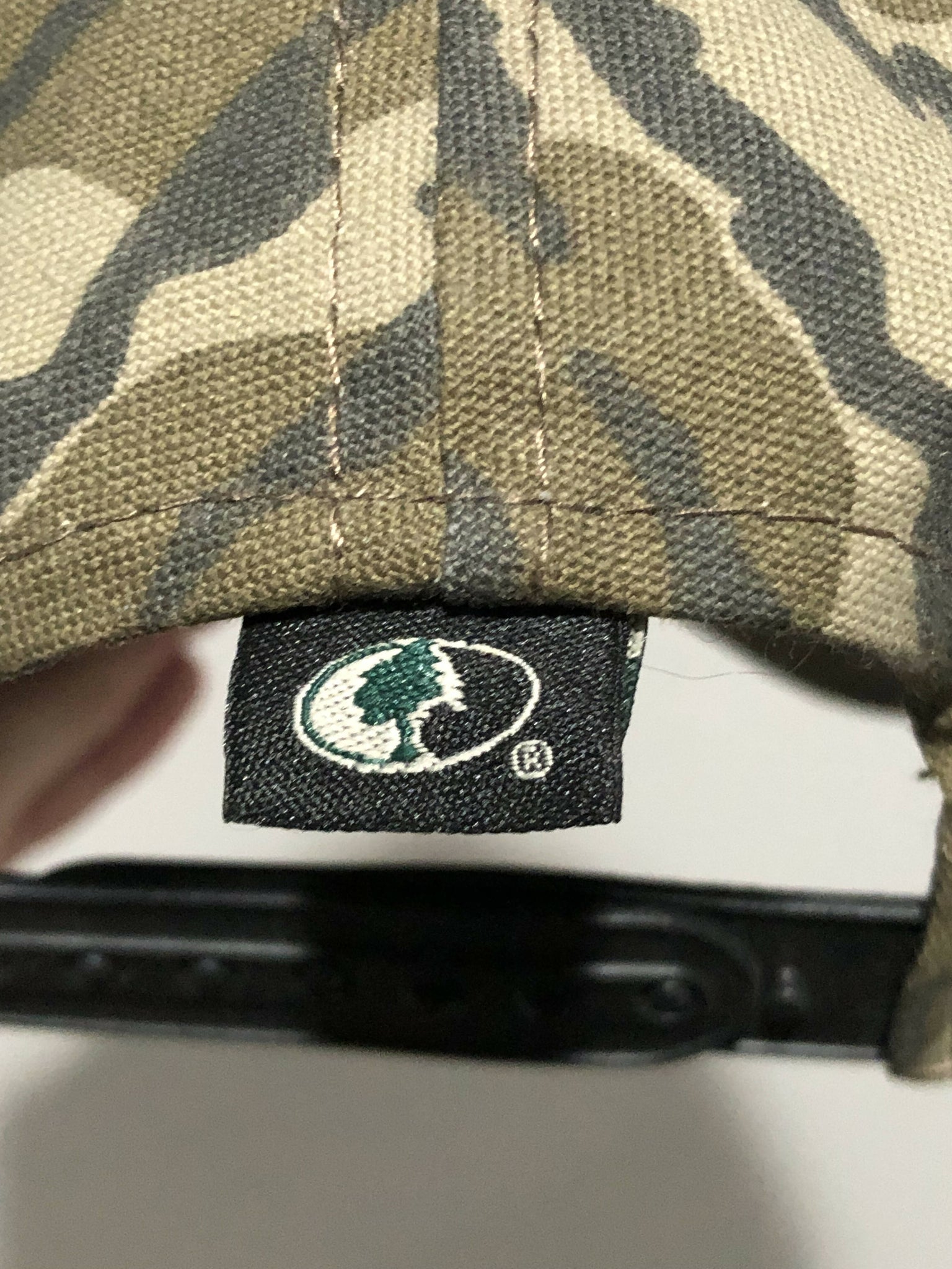 Green, tan, brown and black camo pattern. Mossy oak tag on back. Outdoor cap tag on the interior.
