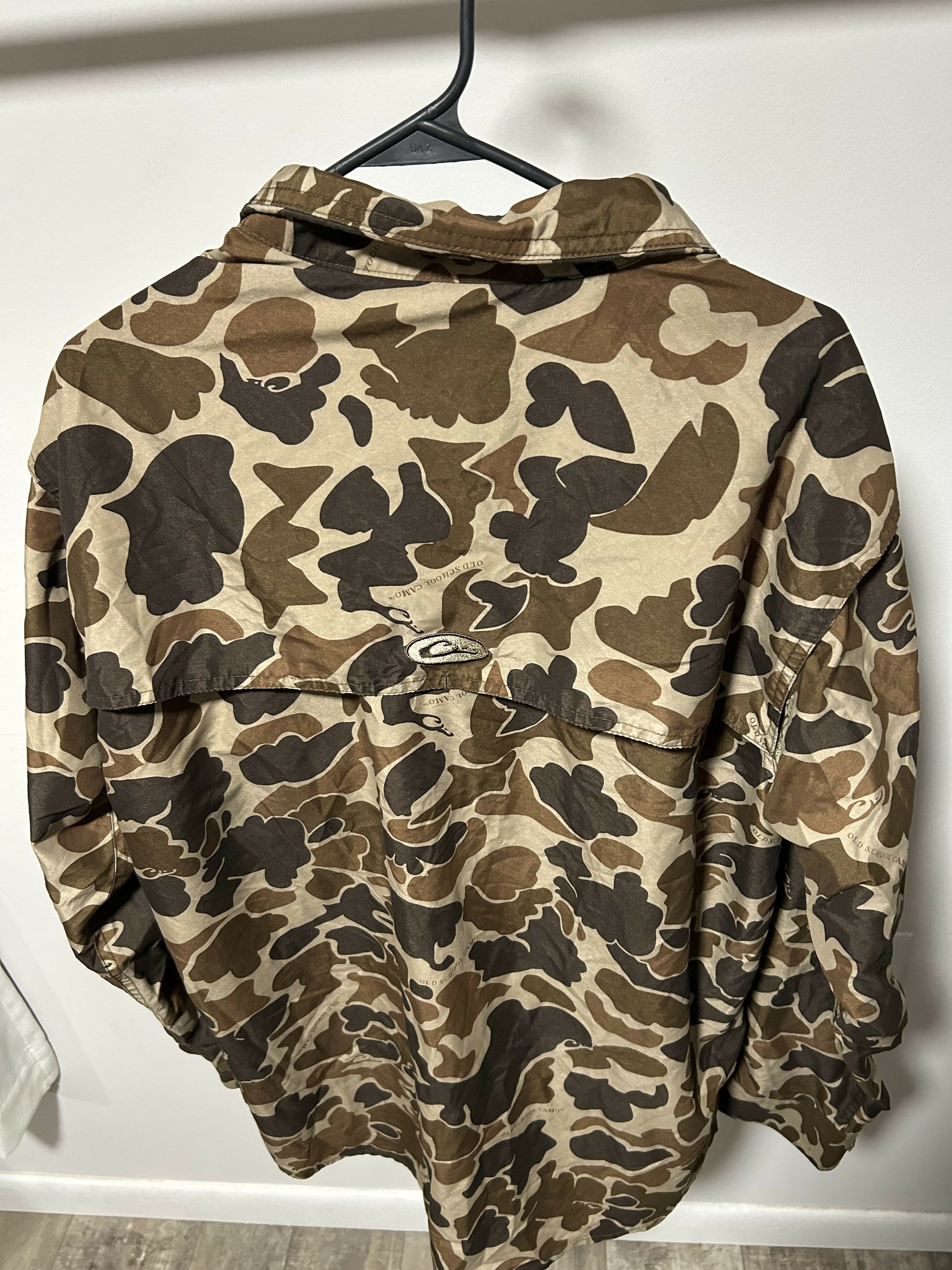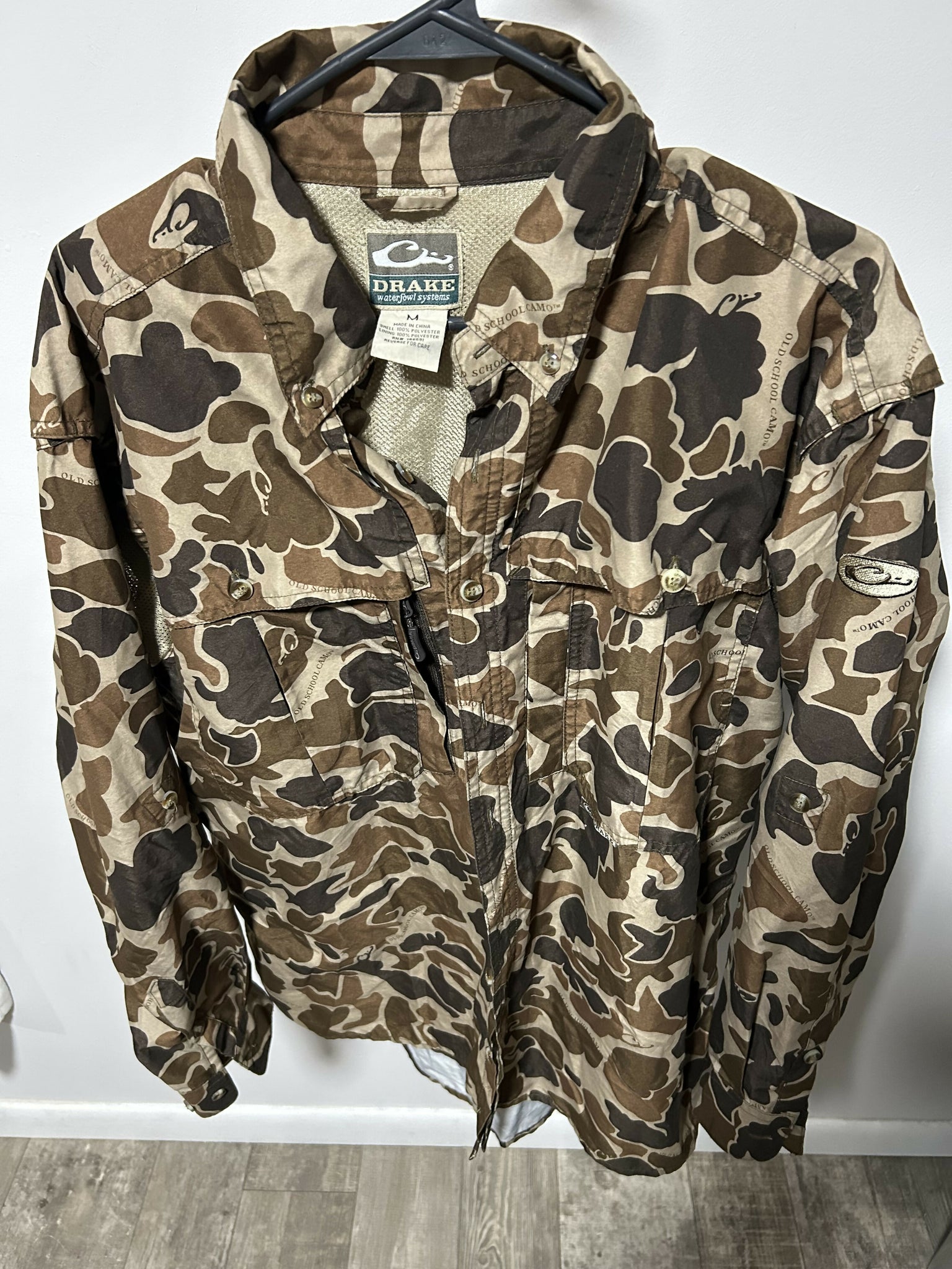 Drake waterfowl, “old school” camo button up shirt, vented back , magnetic chest pocket, zipper chest pocket, size medium