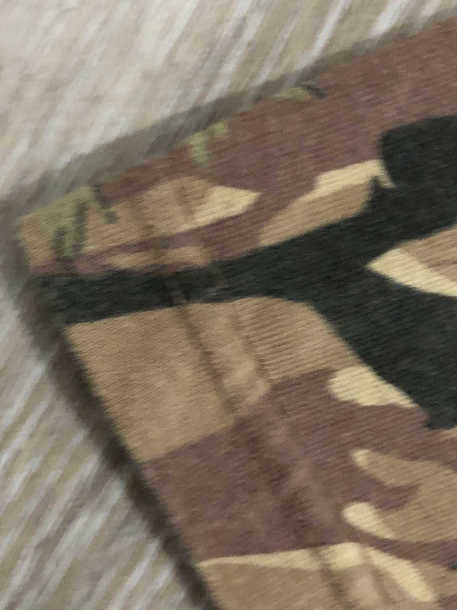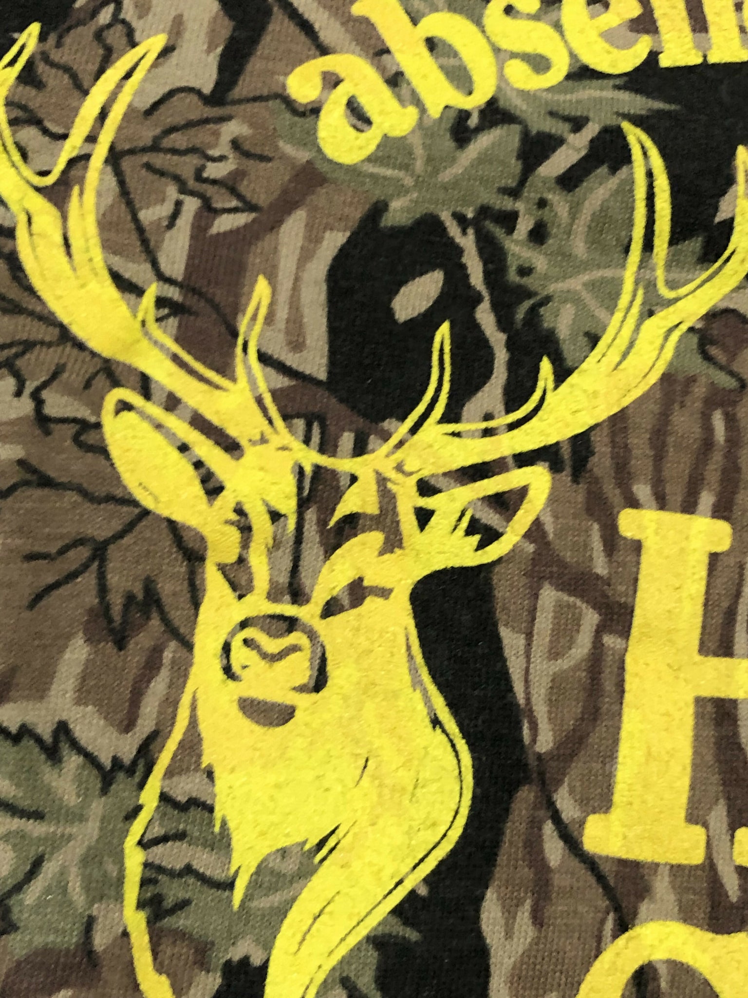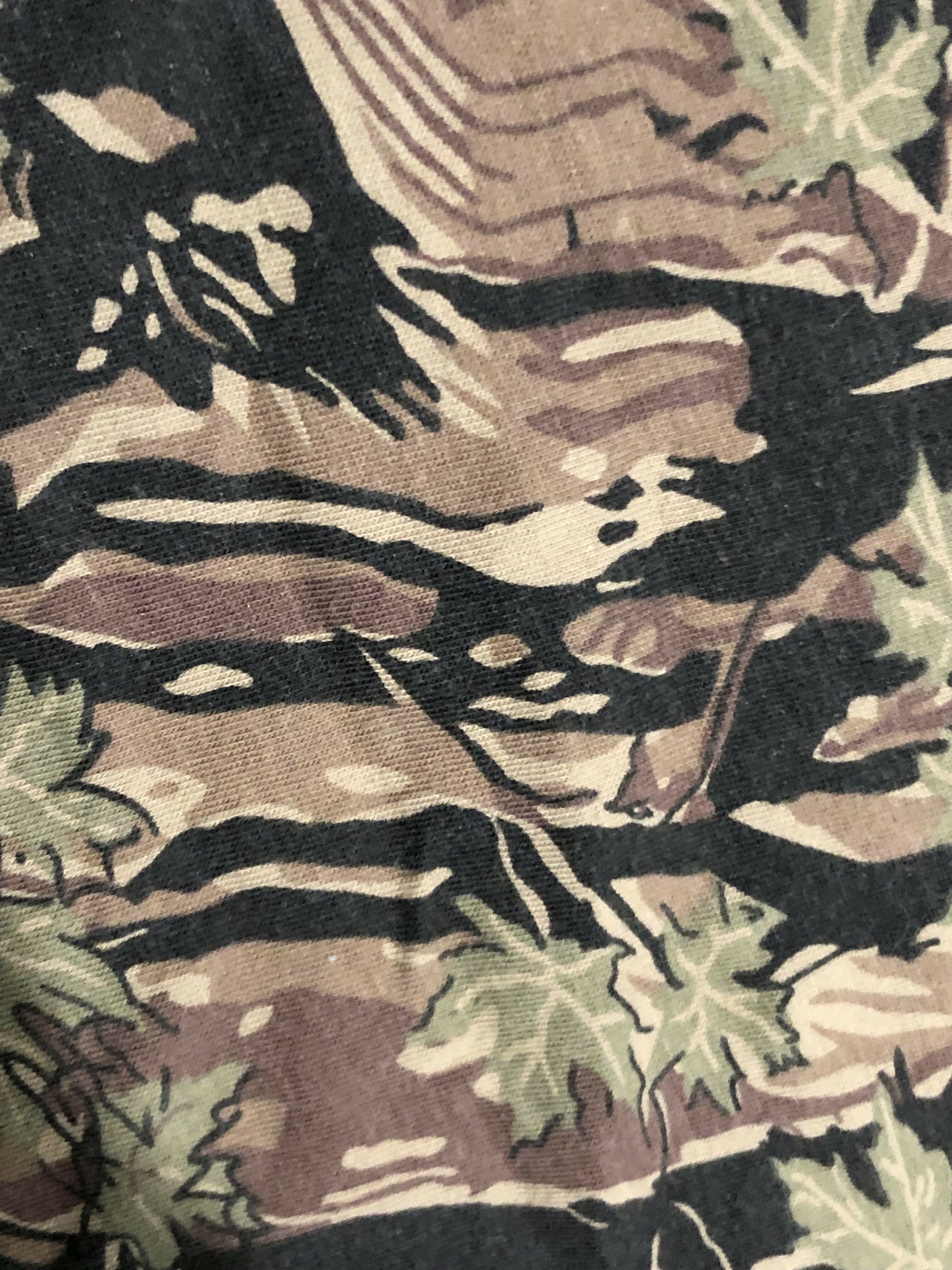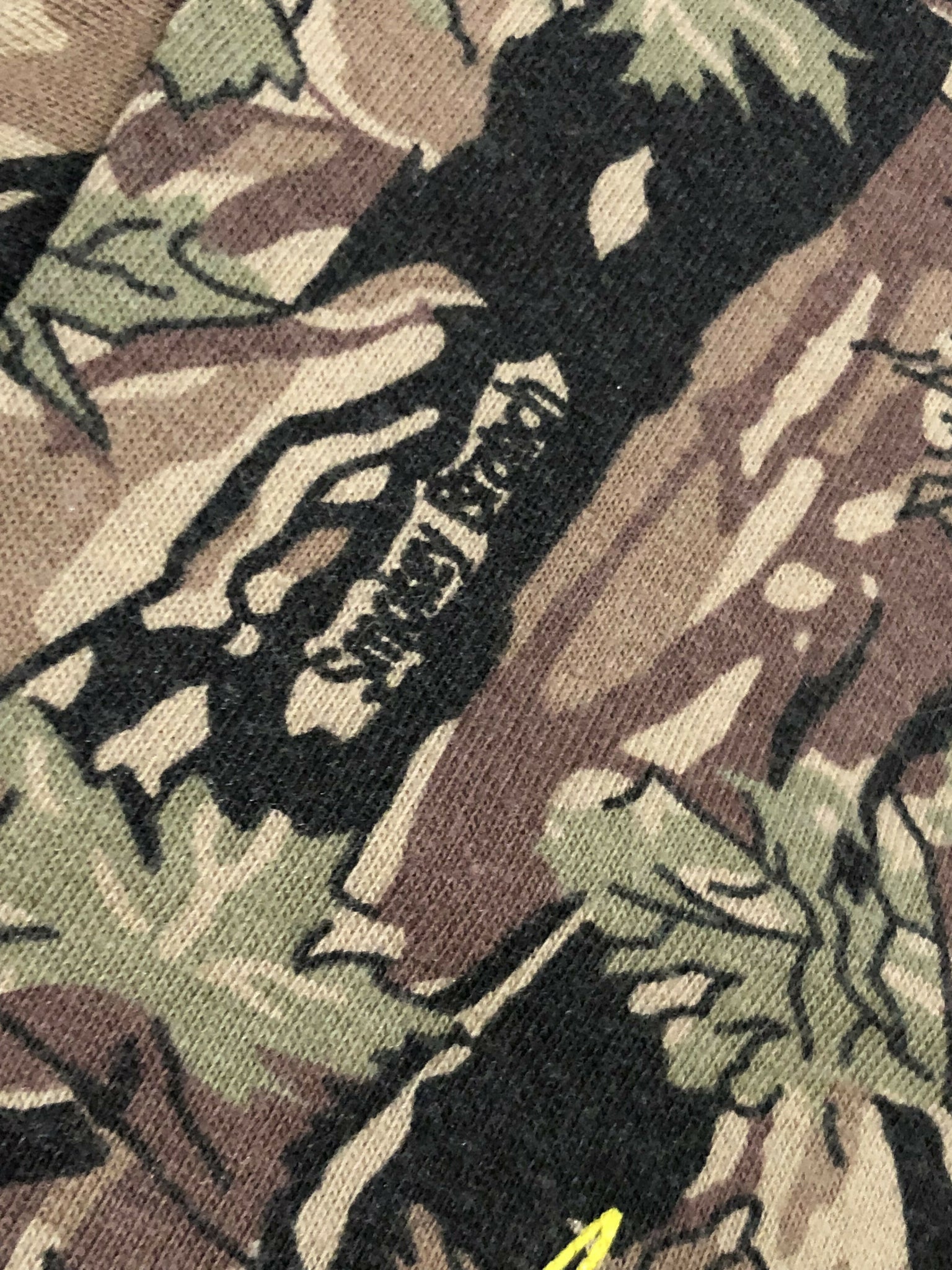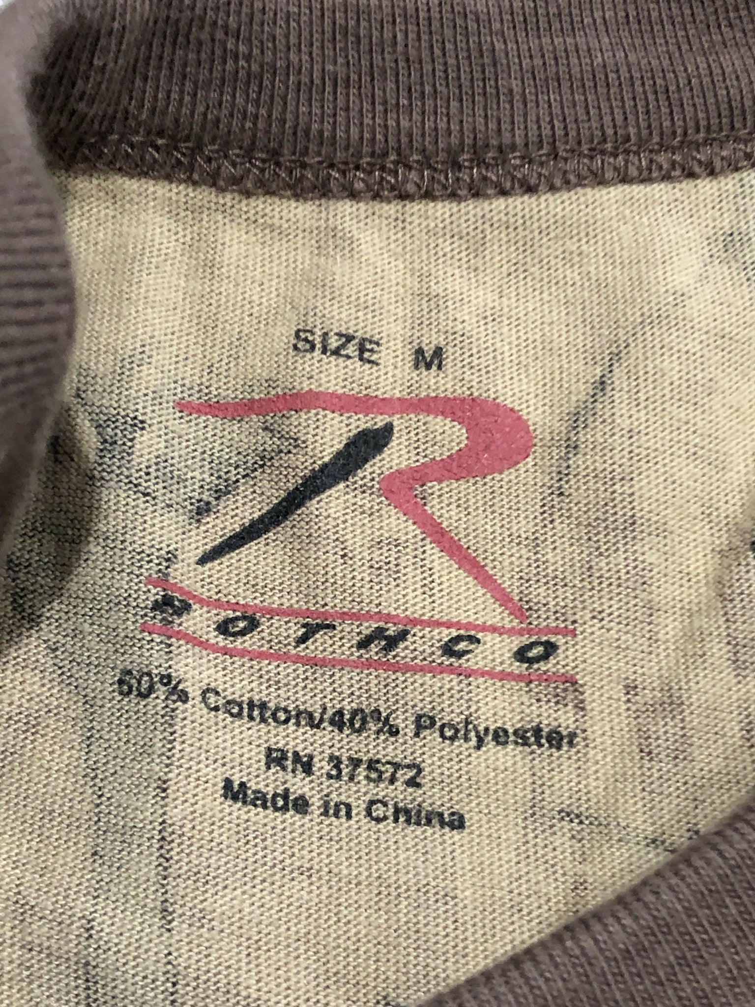 Brown, tan, black, and green Camo pattern. Yellow text and graphic on chest with yellow text on right sleeve. Double stitch. Rothco tag. 60% cotton 40% poly.