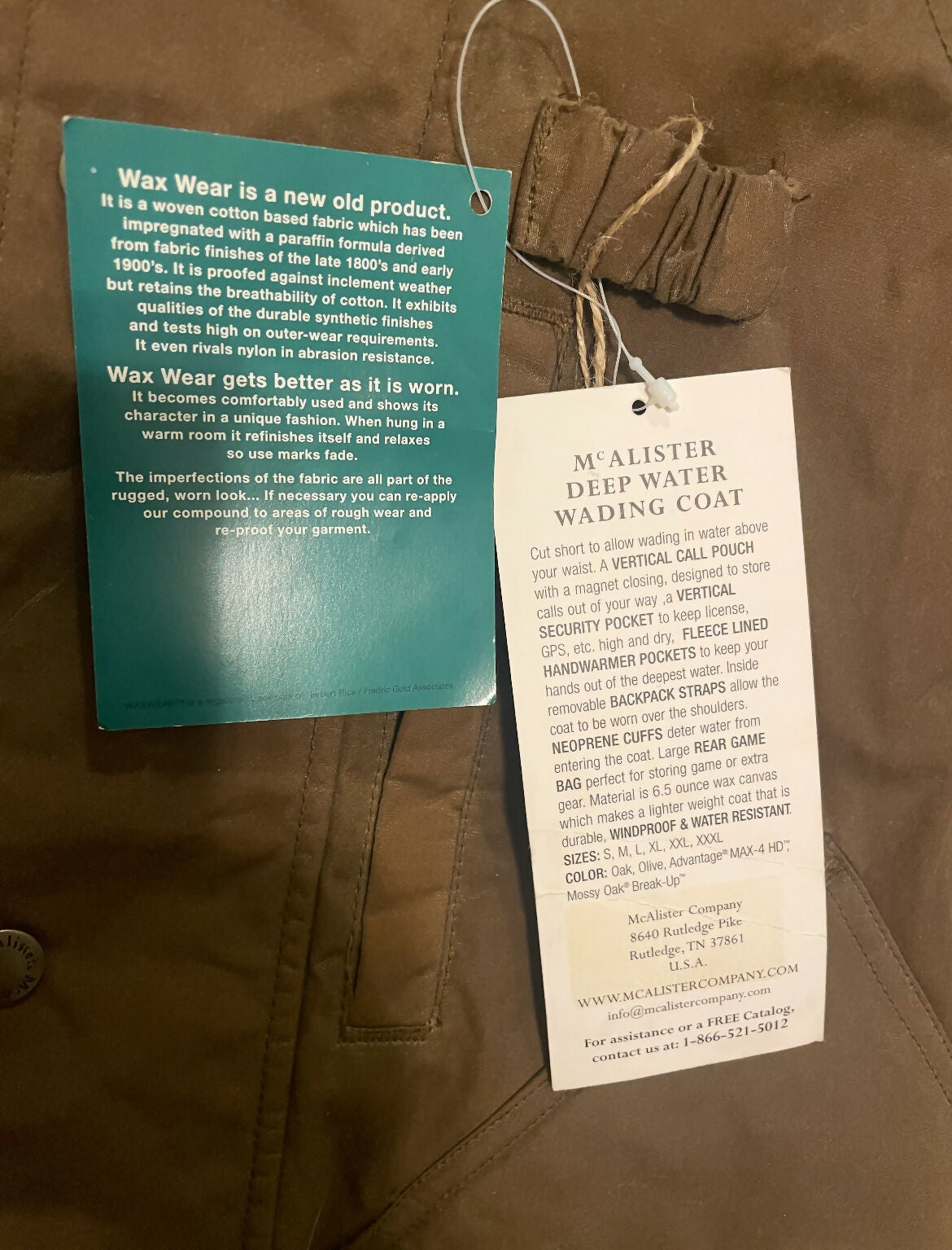 McAlister Deep Water Wading Coat - new with tags. Size L. Wax canvas material.