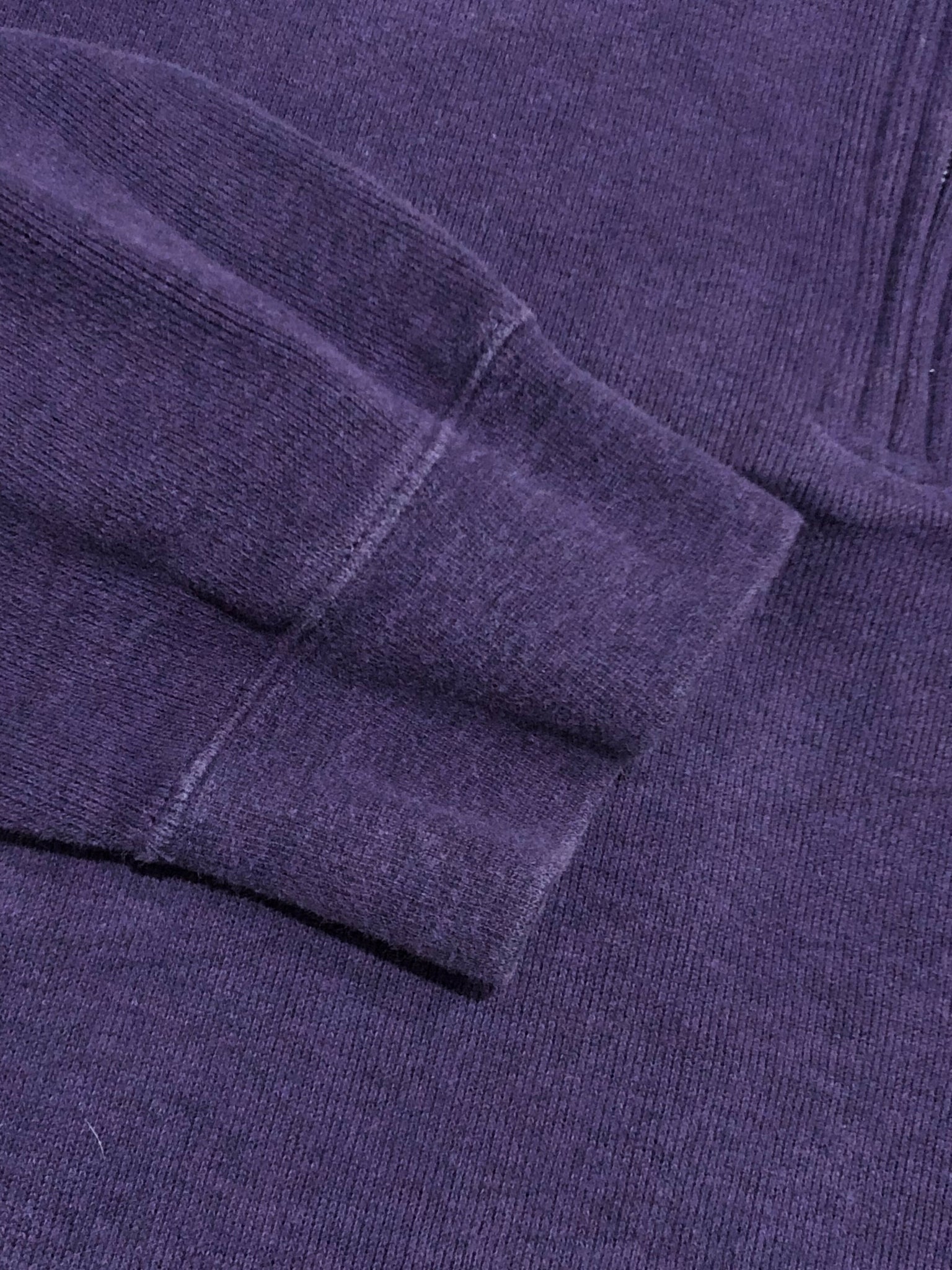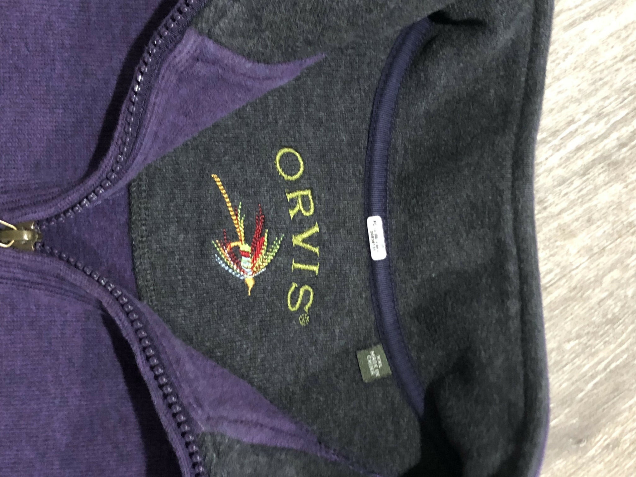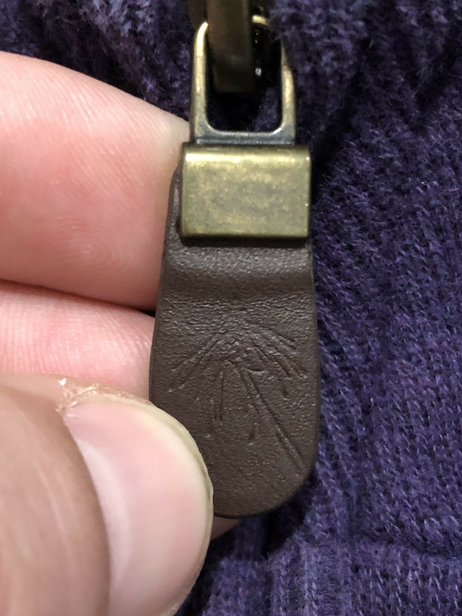 Purple sweater. Stitched fly fishing lure inside collar. Brown leather pull tab on brass zipper.