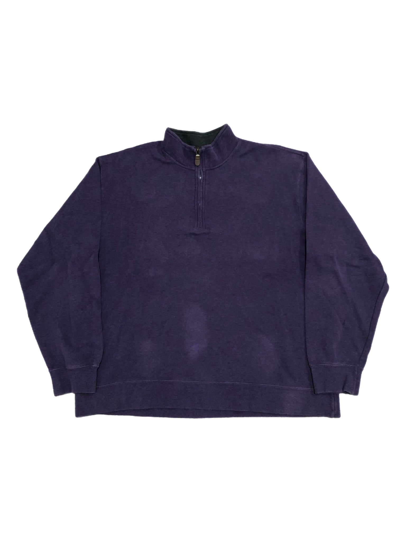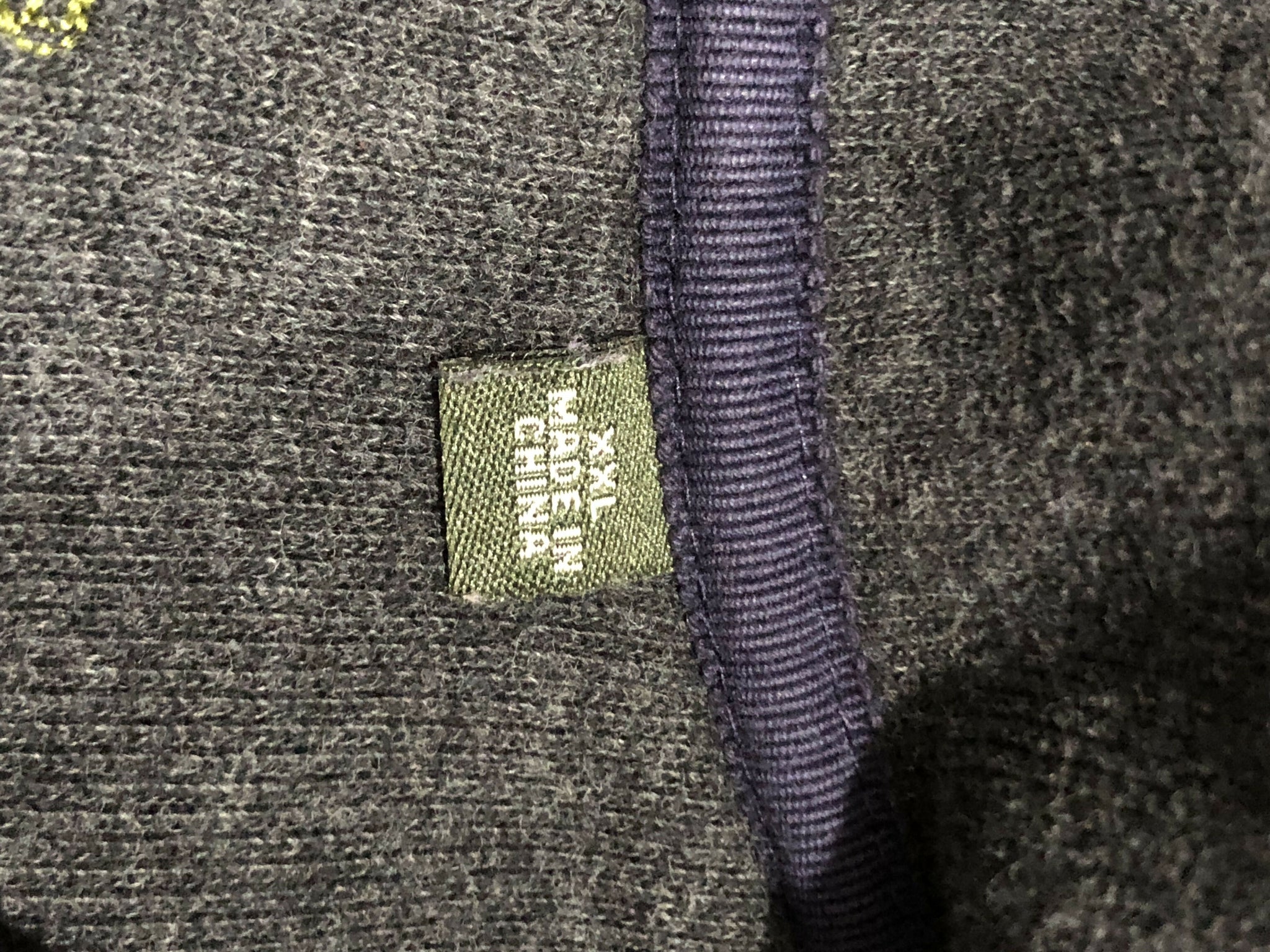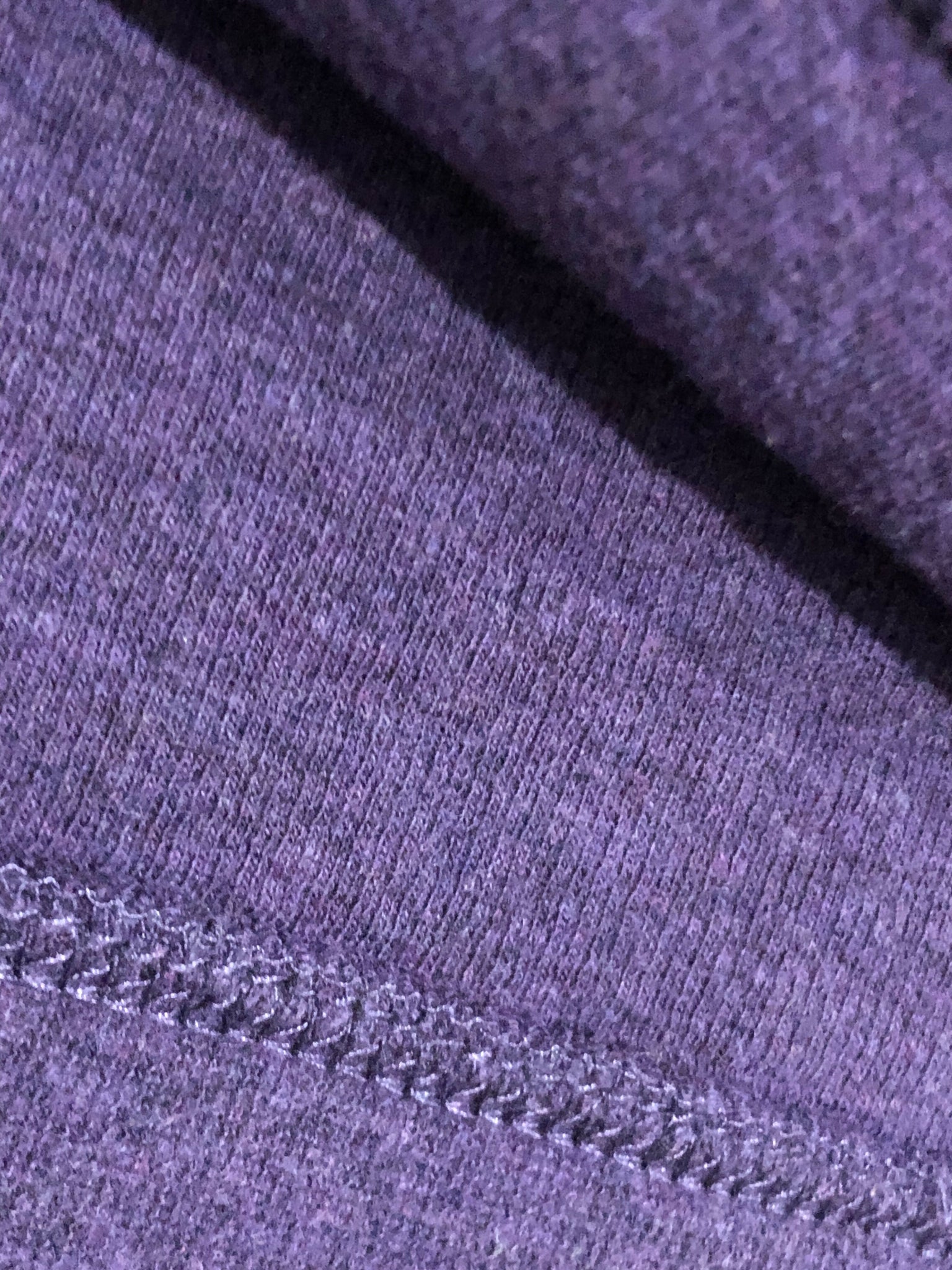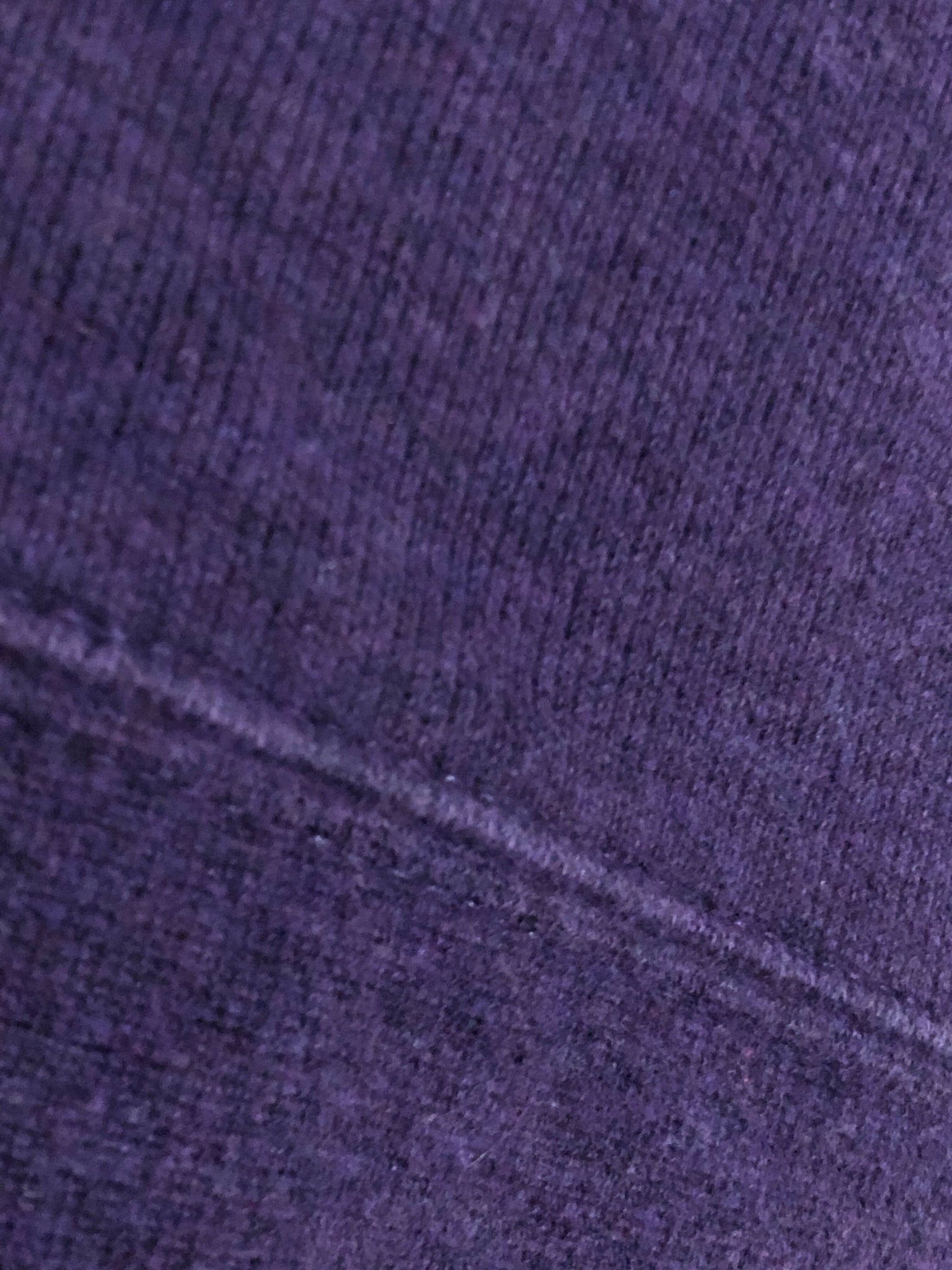 Purple sweater. Stitched fly fishing lure inside collar. Brown leather pull tab on brass zipper.