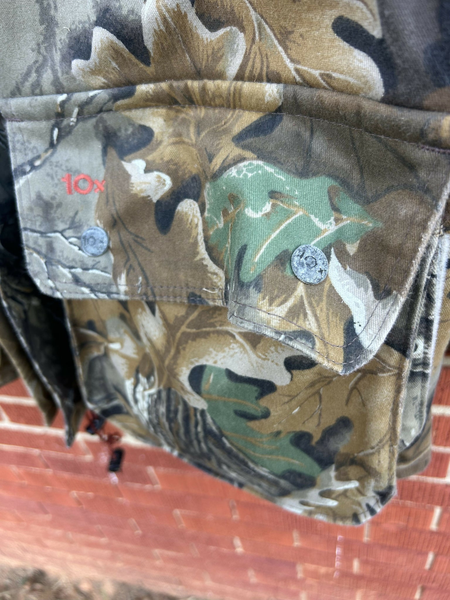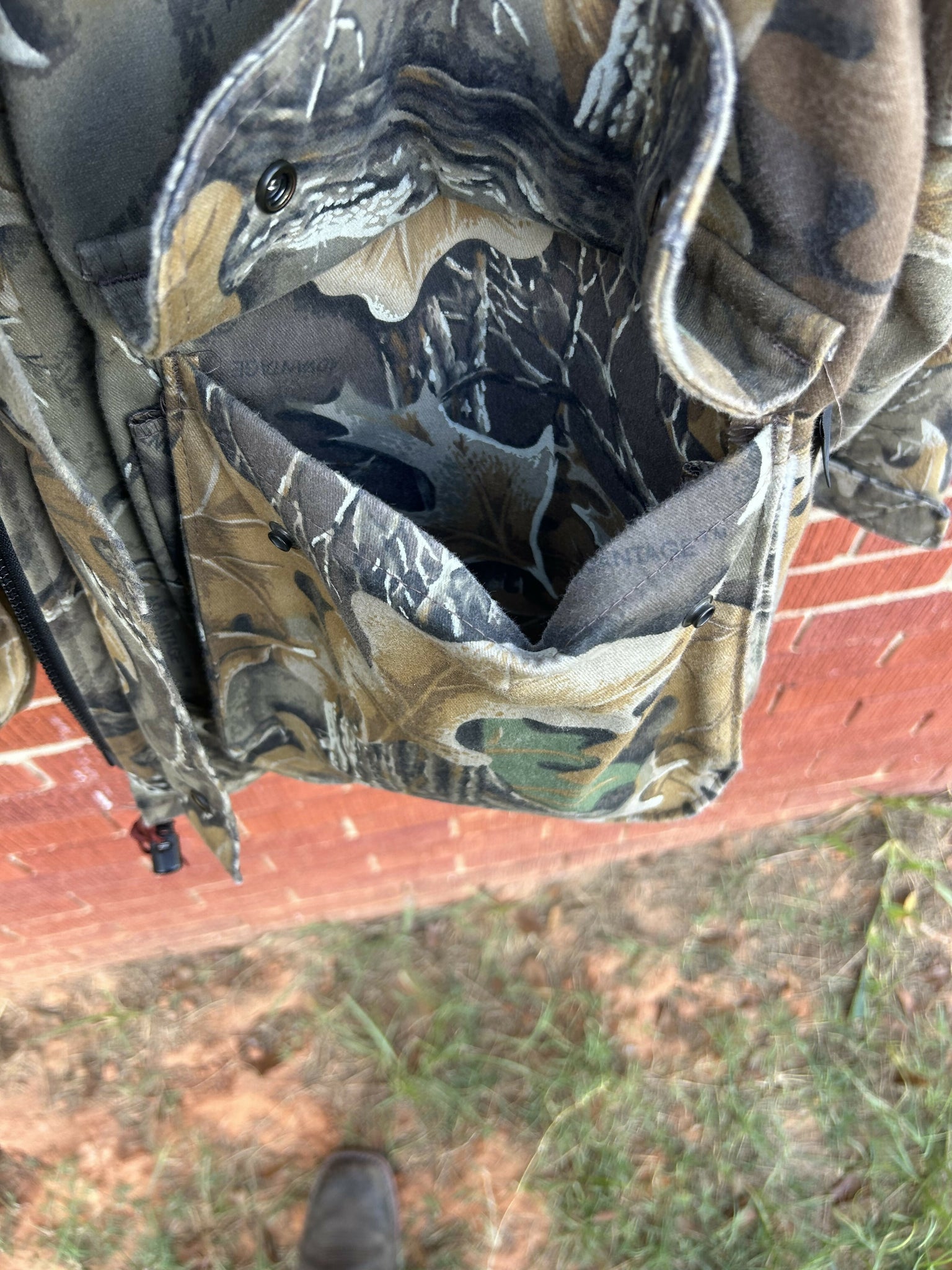 USA made Gore-Tex Realtree Advantage jacket. Size Large. Removable hood. Large front button pockets. Some corrosion on the pocket buttons.