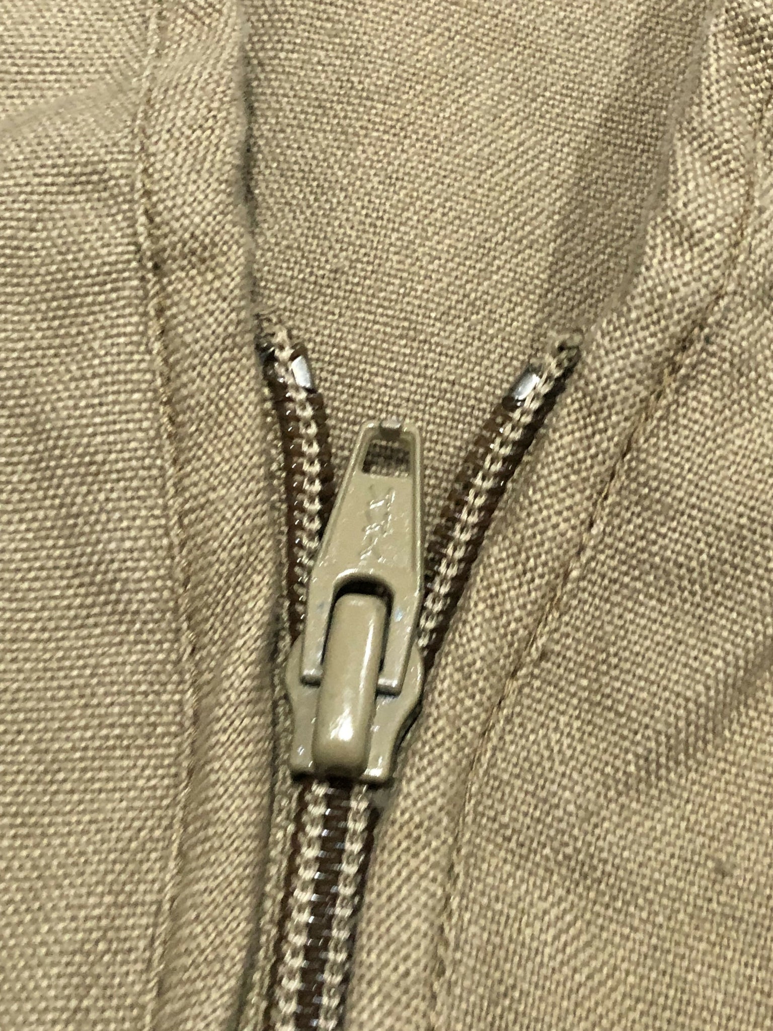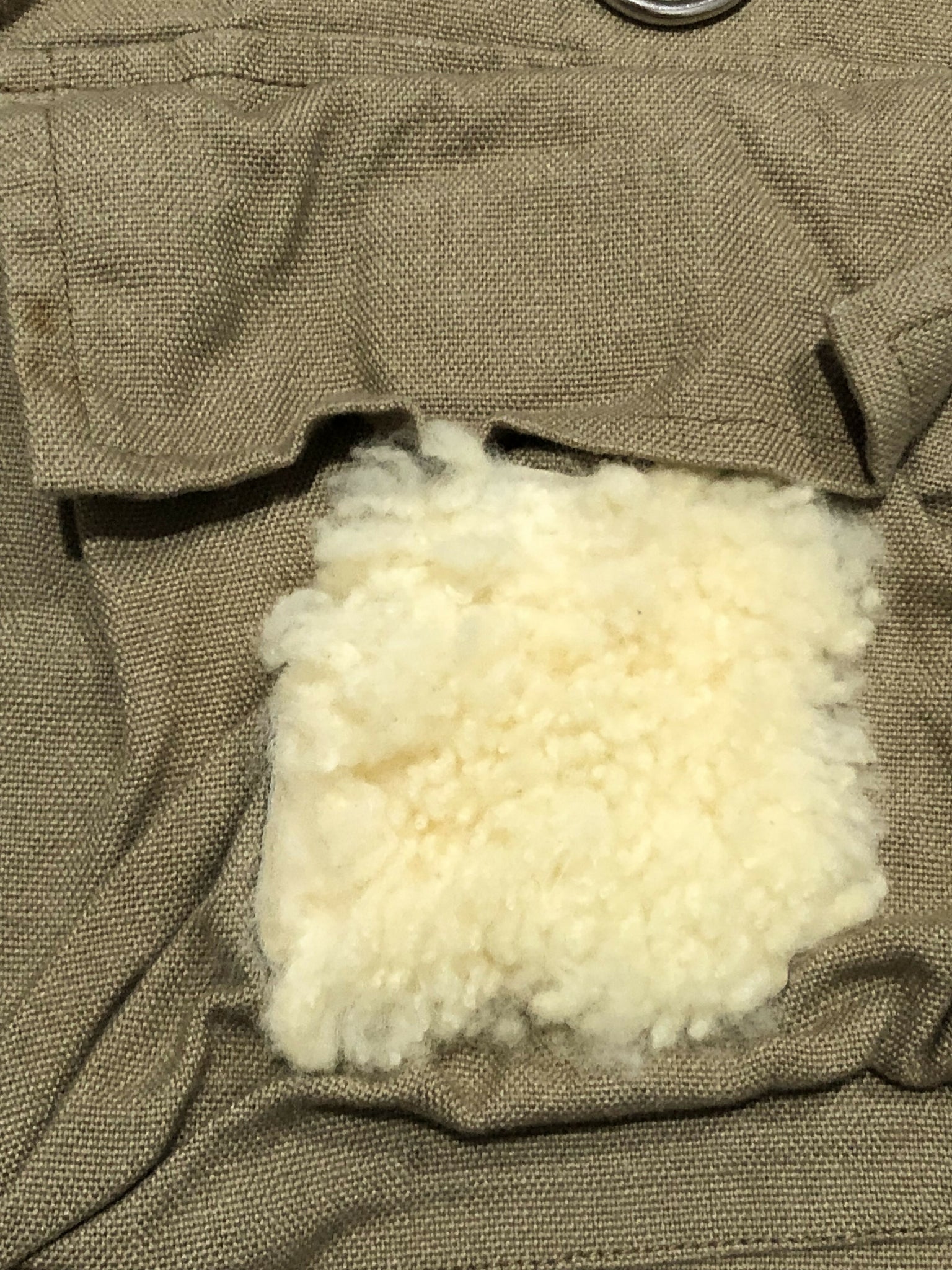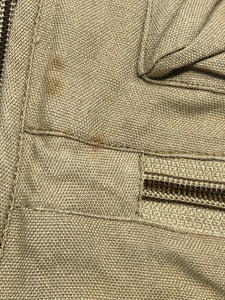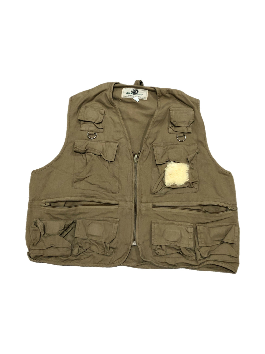 Khaki canvas vest. Tons of pockets and pouches on both sides. Sherpa spot for placing hooks into. Full zip front.