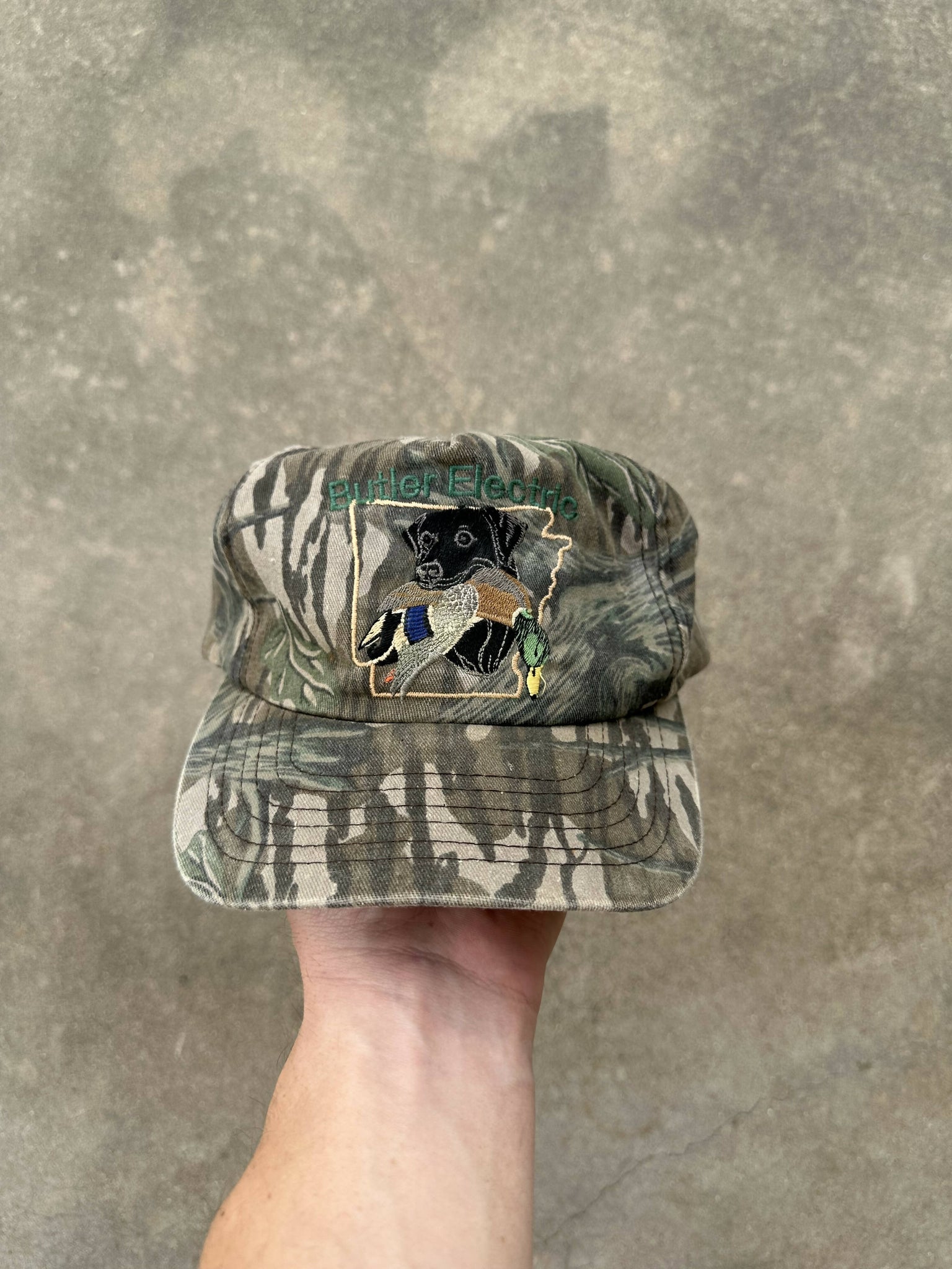Vintage Butler Electric Treestand Camo Snapback.