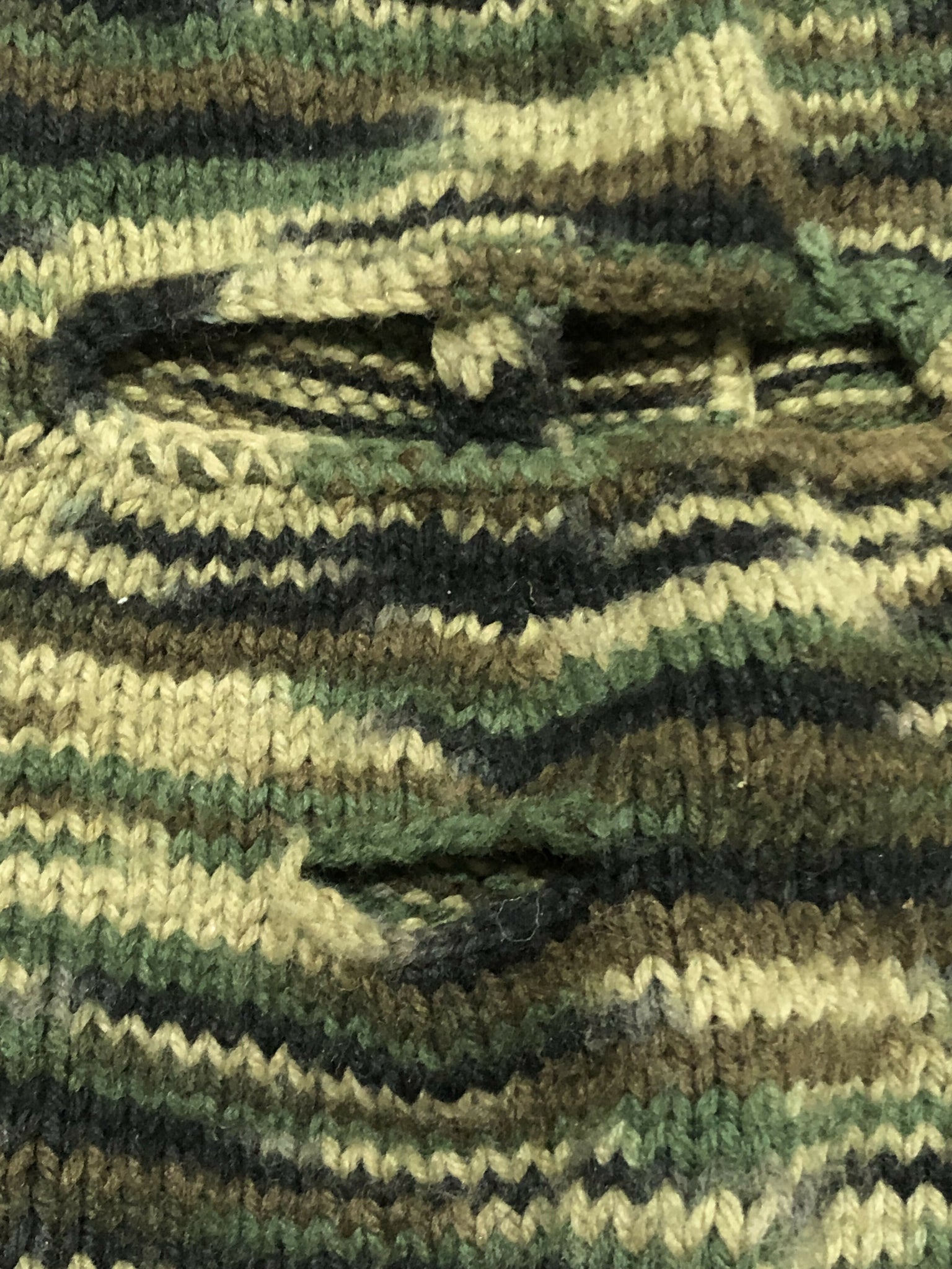 Lined Camo pattern with green, black, brown and tan. Eye holes and small mouth hole. Very warm and thermal. No tags.
