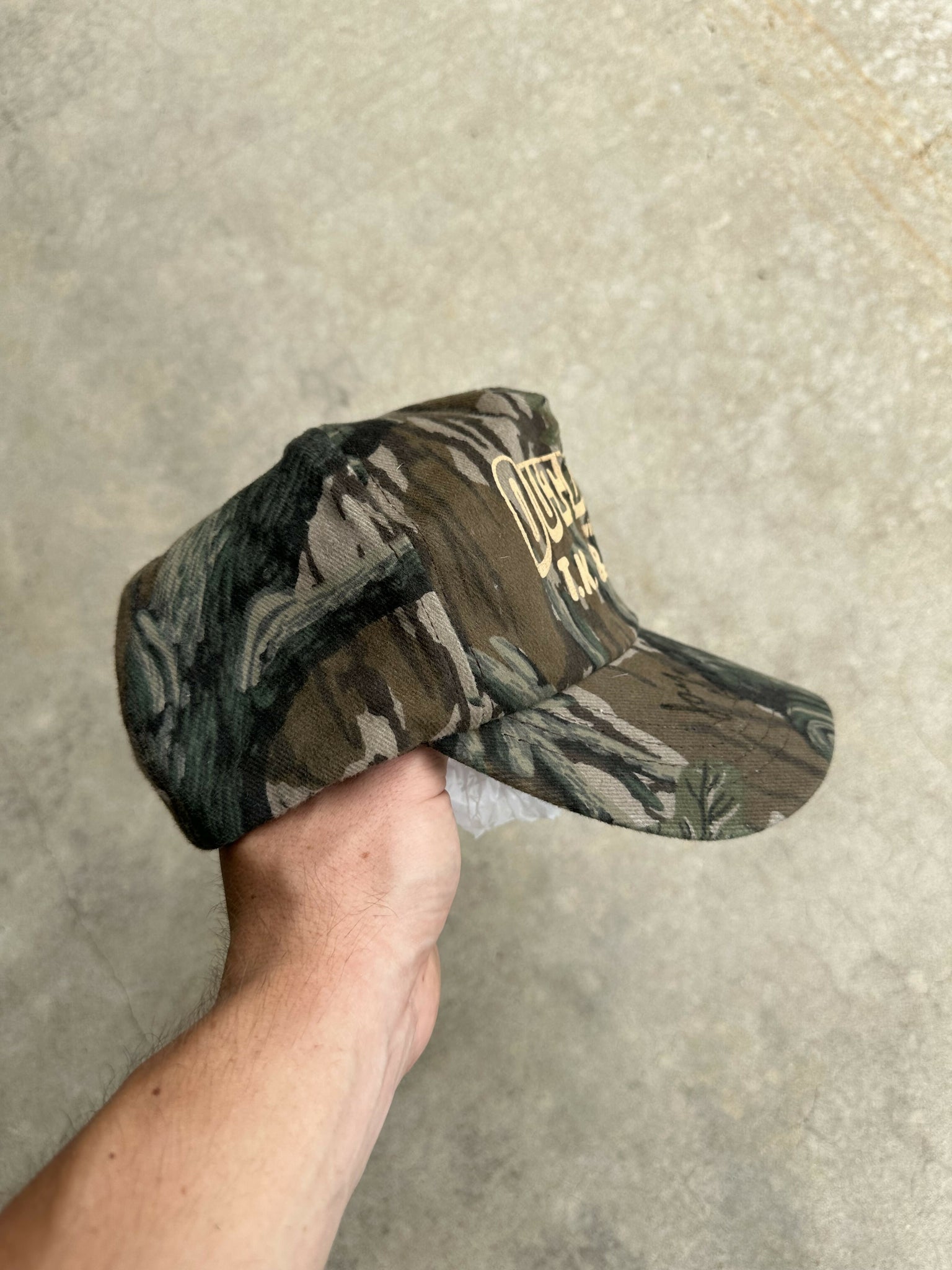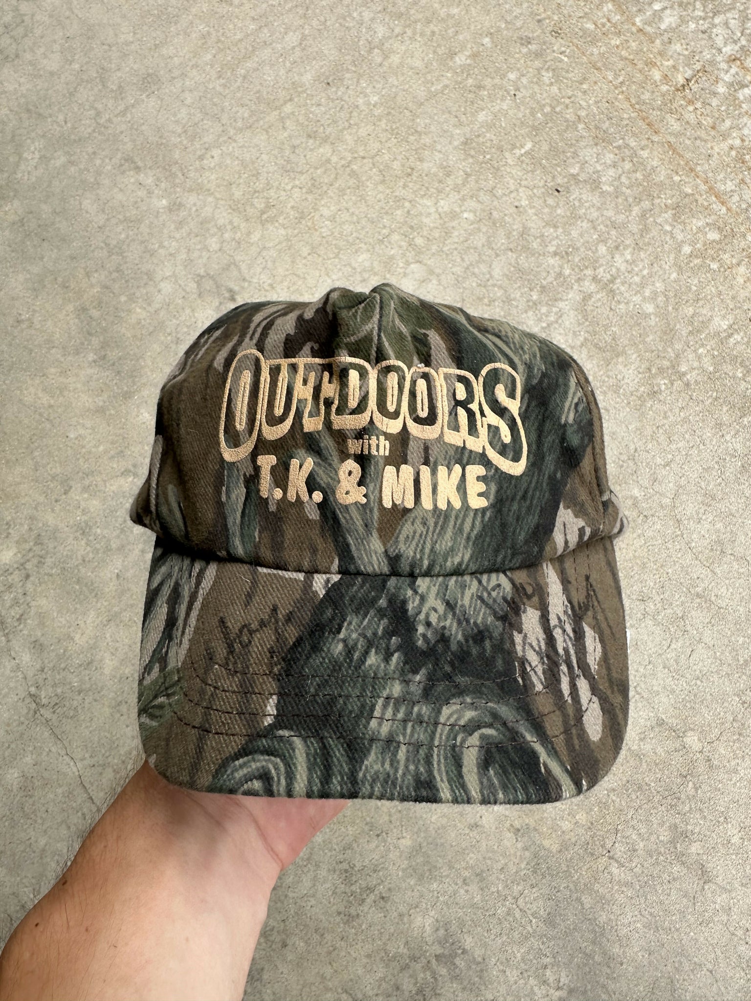 Vintage TK & Mike Outdoors Treestand Camo Autographed Snapback. Made in USA. Good condition.
